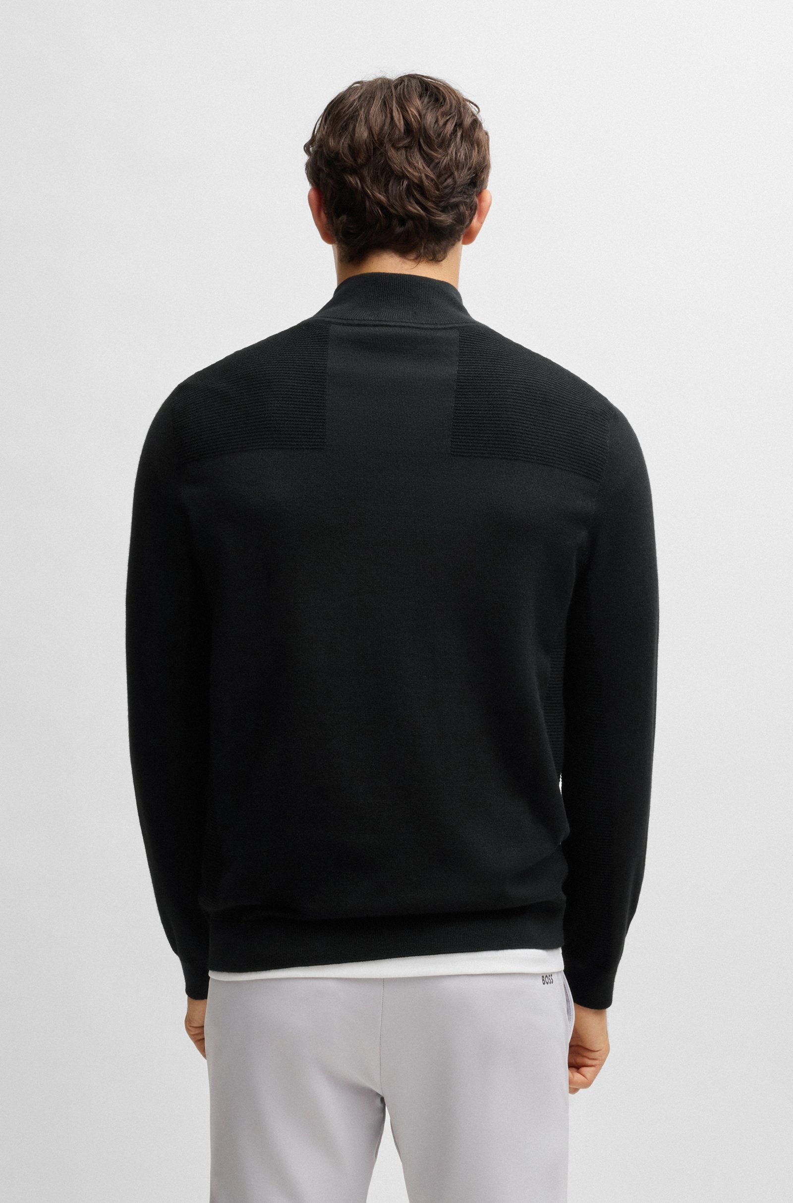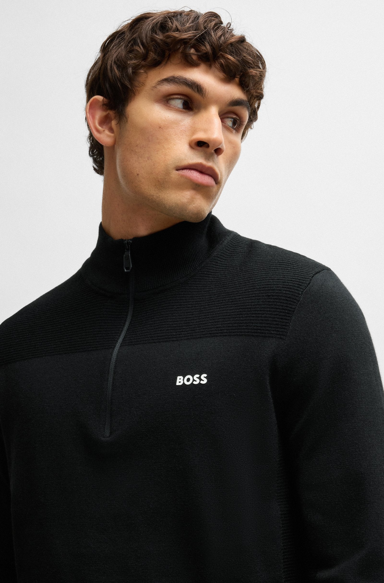 A regular-fit zip-neck sweater with a logo by BOSS Menswear, designed in thermo-regulating and moisture-managing fabric blended with wool.