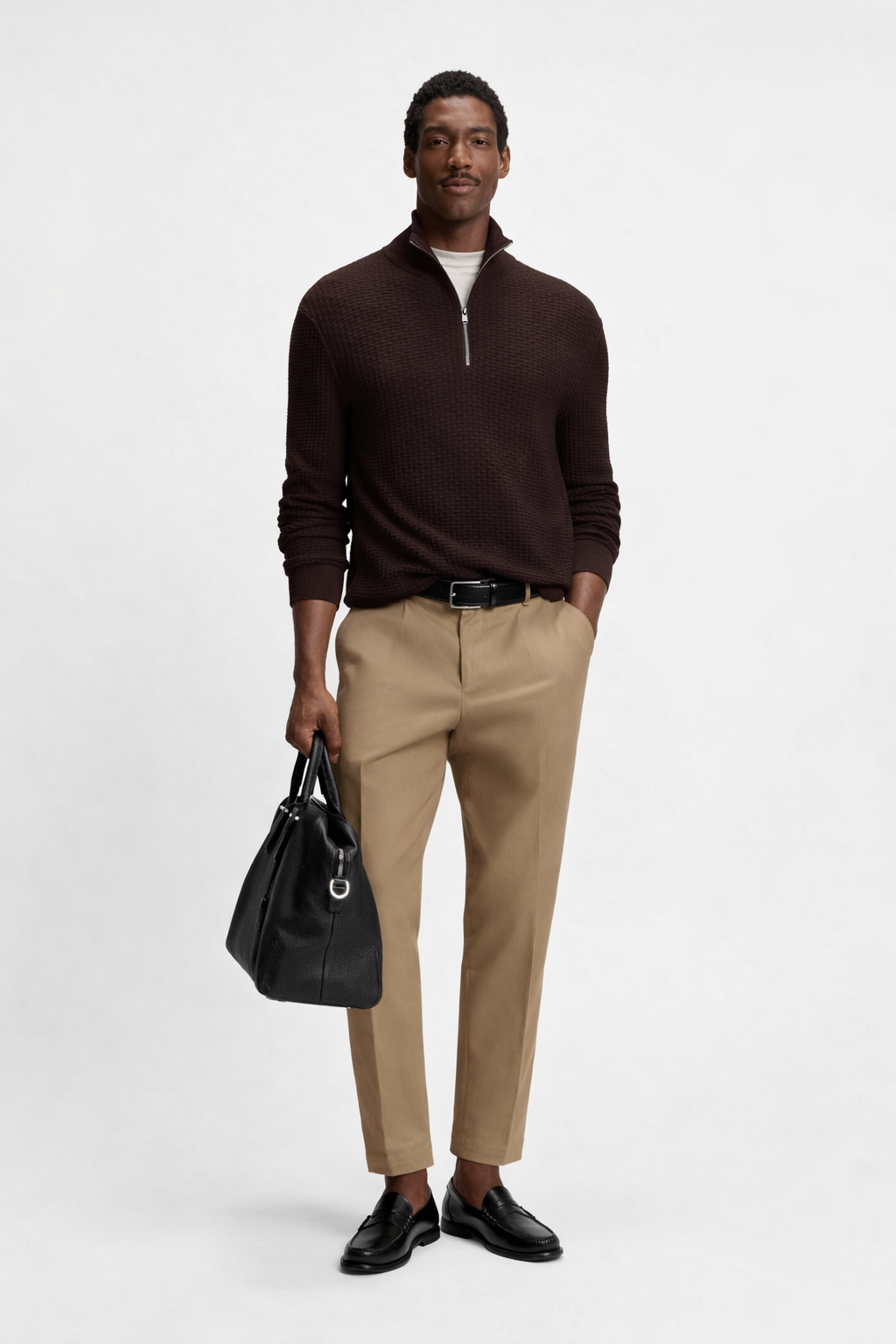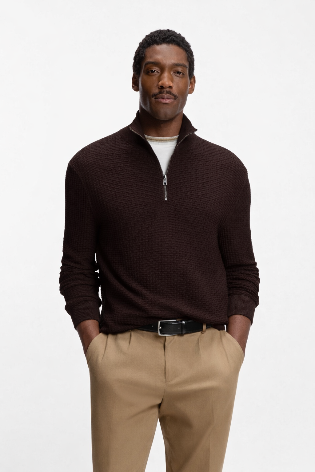 Great for layering in cooler weather, this BOSS Menswear sweater has a straight fit and quarter zip. Rich structure in soft cotton.