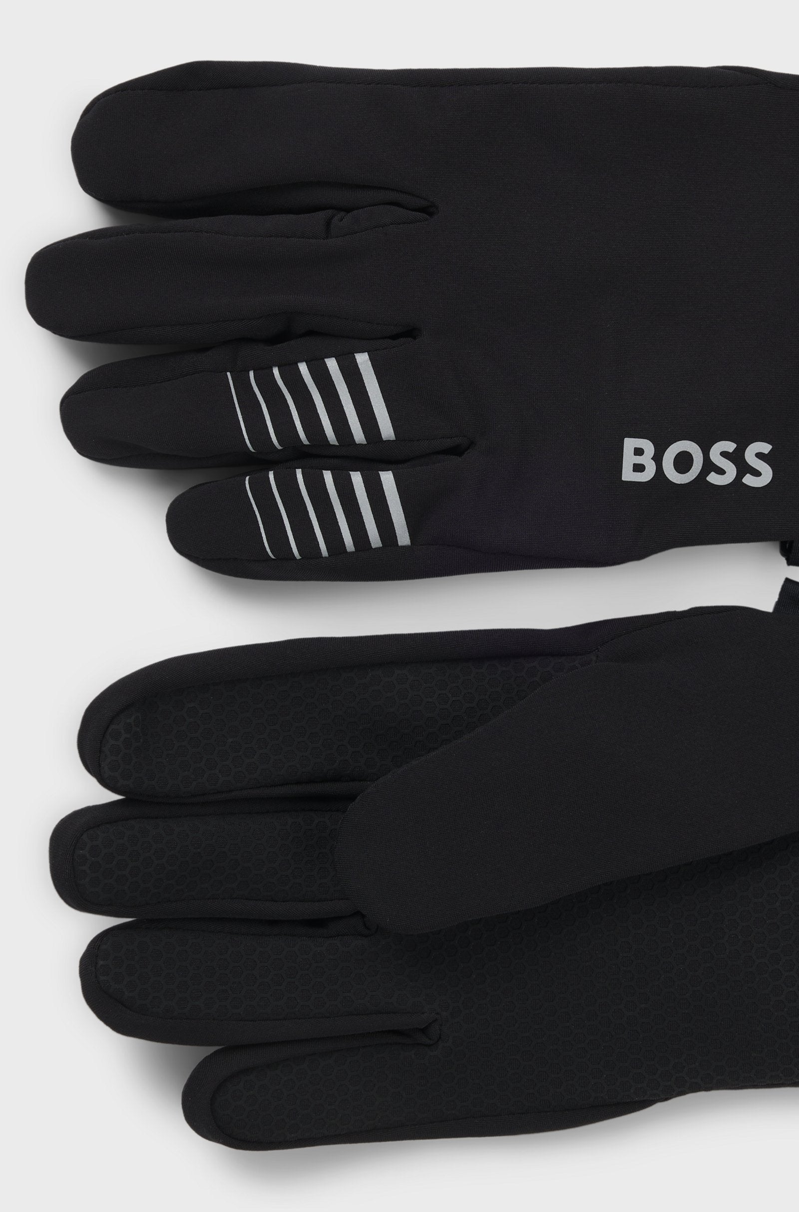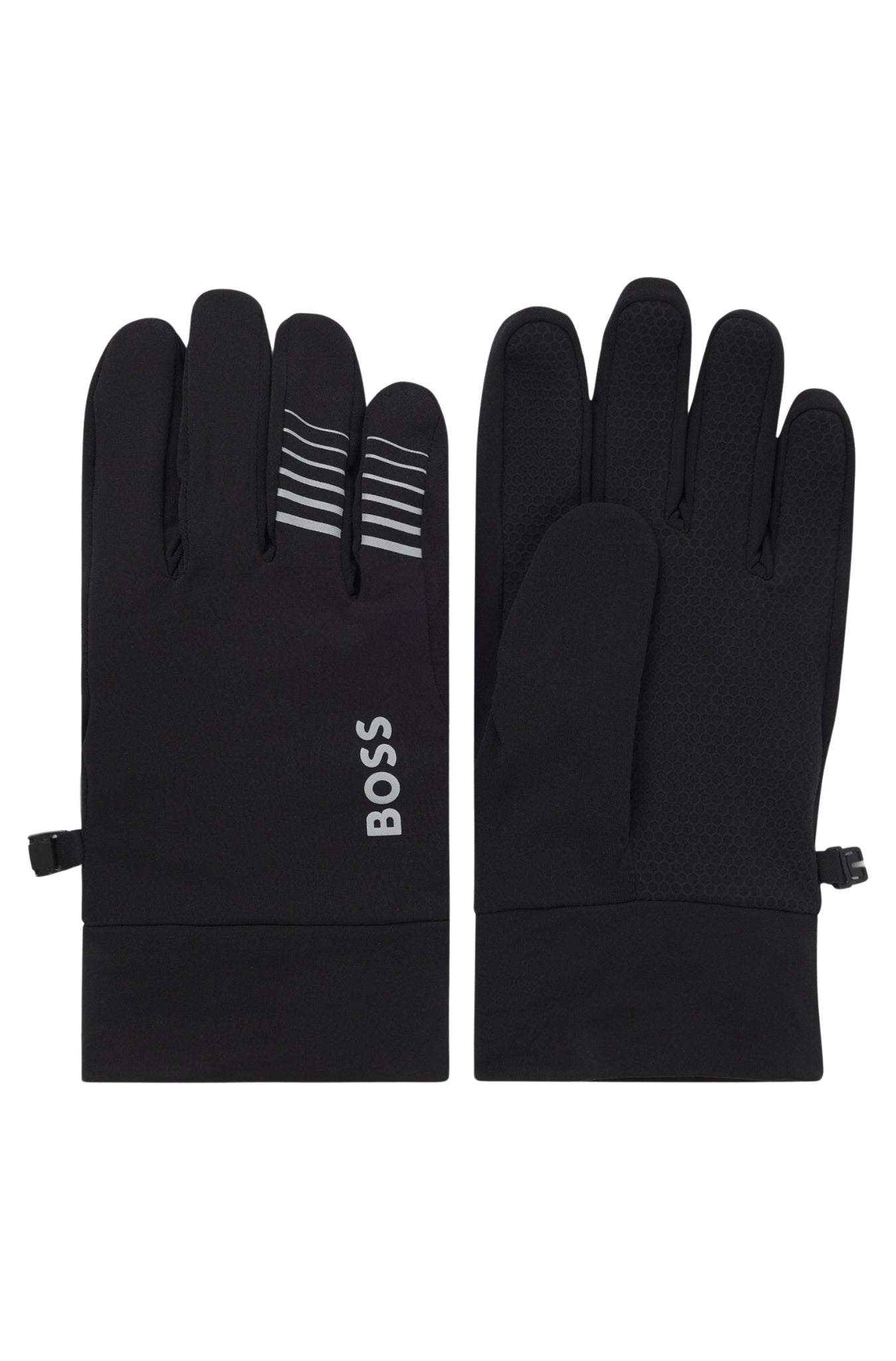 These BOSS Menswear running gloves offer optimal grip and touchscreen-friendly design features. Engineered in lightweight stretch fleece. Decorative reflective details. Connecting clip for storage.