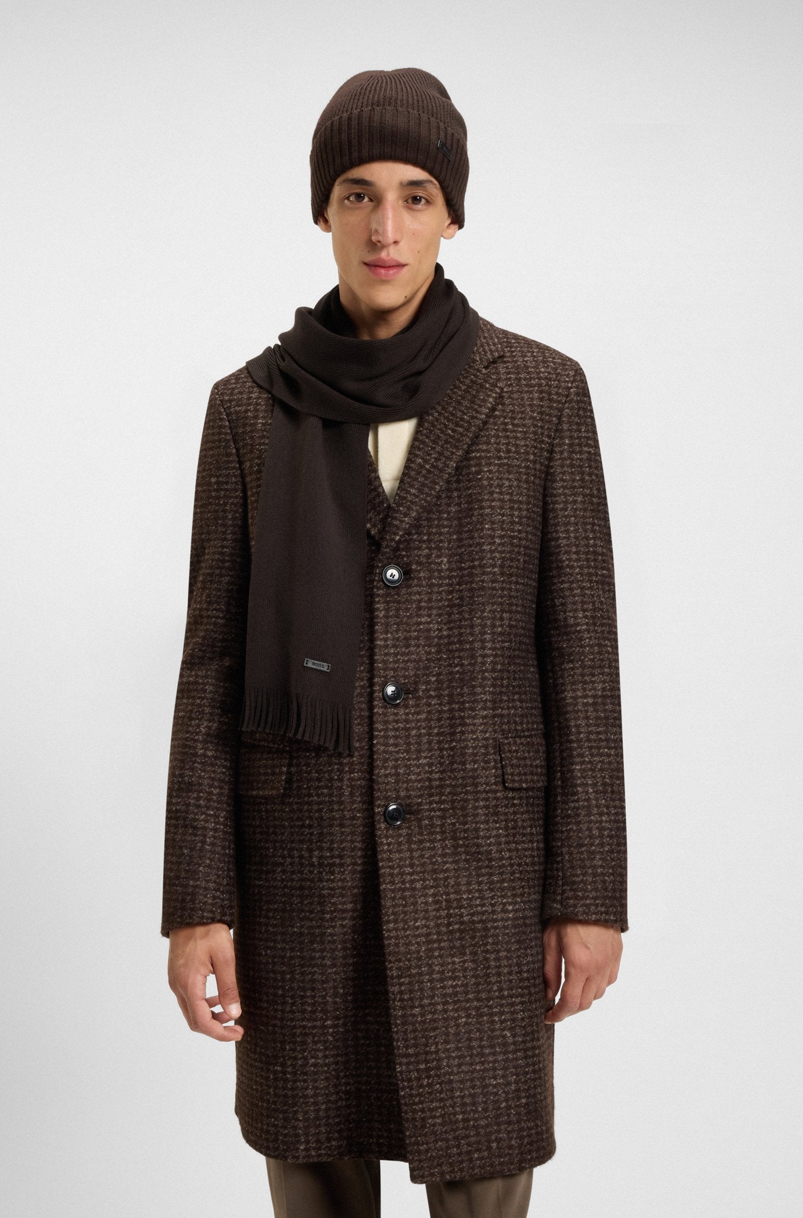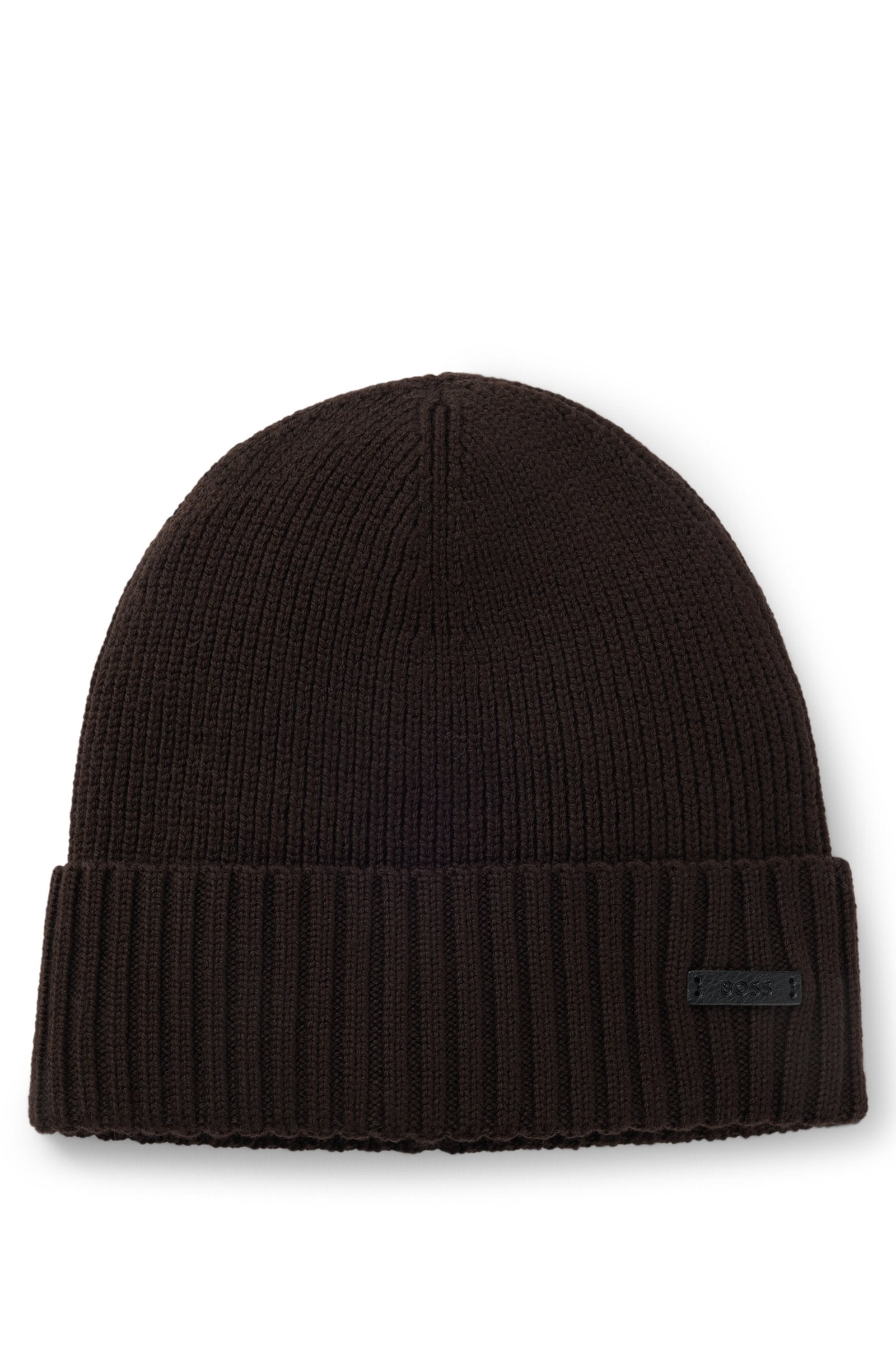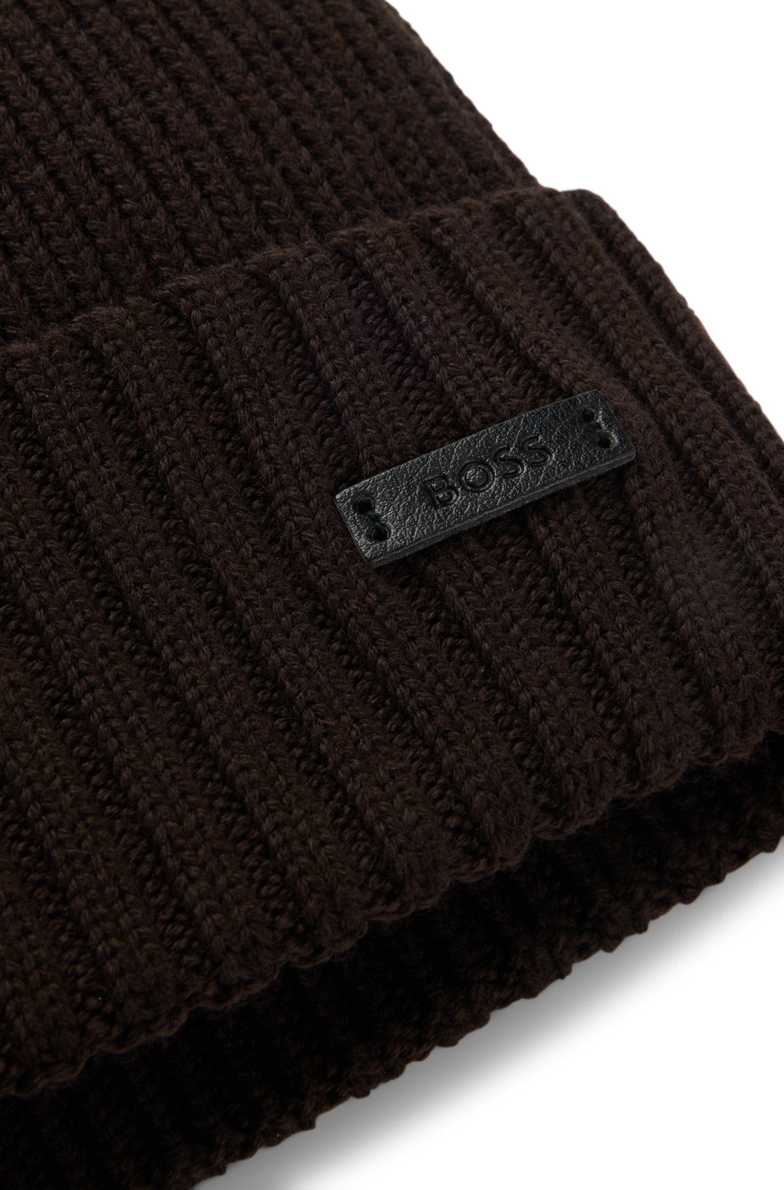 A cosy beanie hat by BOSS, knitted with all-over ribbing and trimmed with a logo plaque in faux leather.