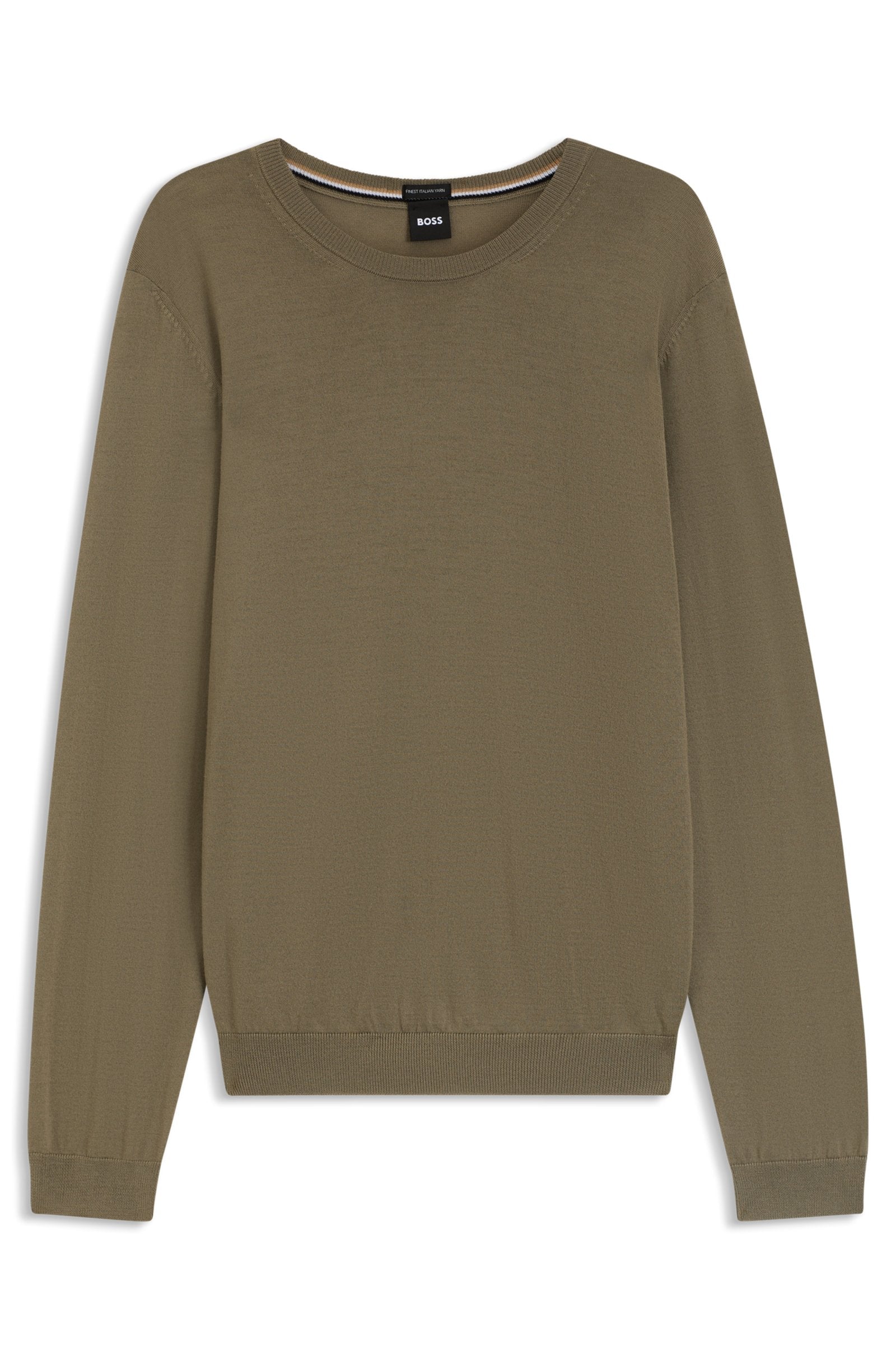 An essential sweater in a defined fit by BOSS Menswear. Crafted in 100% virgin wool for breathable comfort, this crew-neck sweater is detailed with structured side seams and a signature stripe at the inner collar.