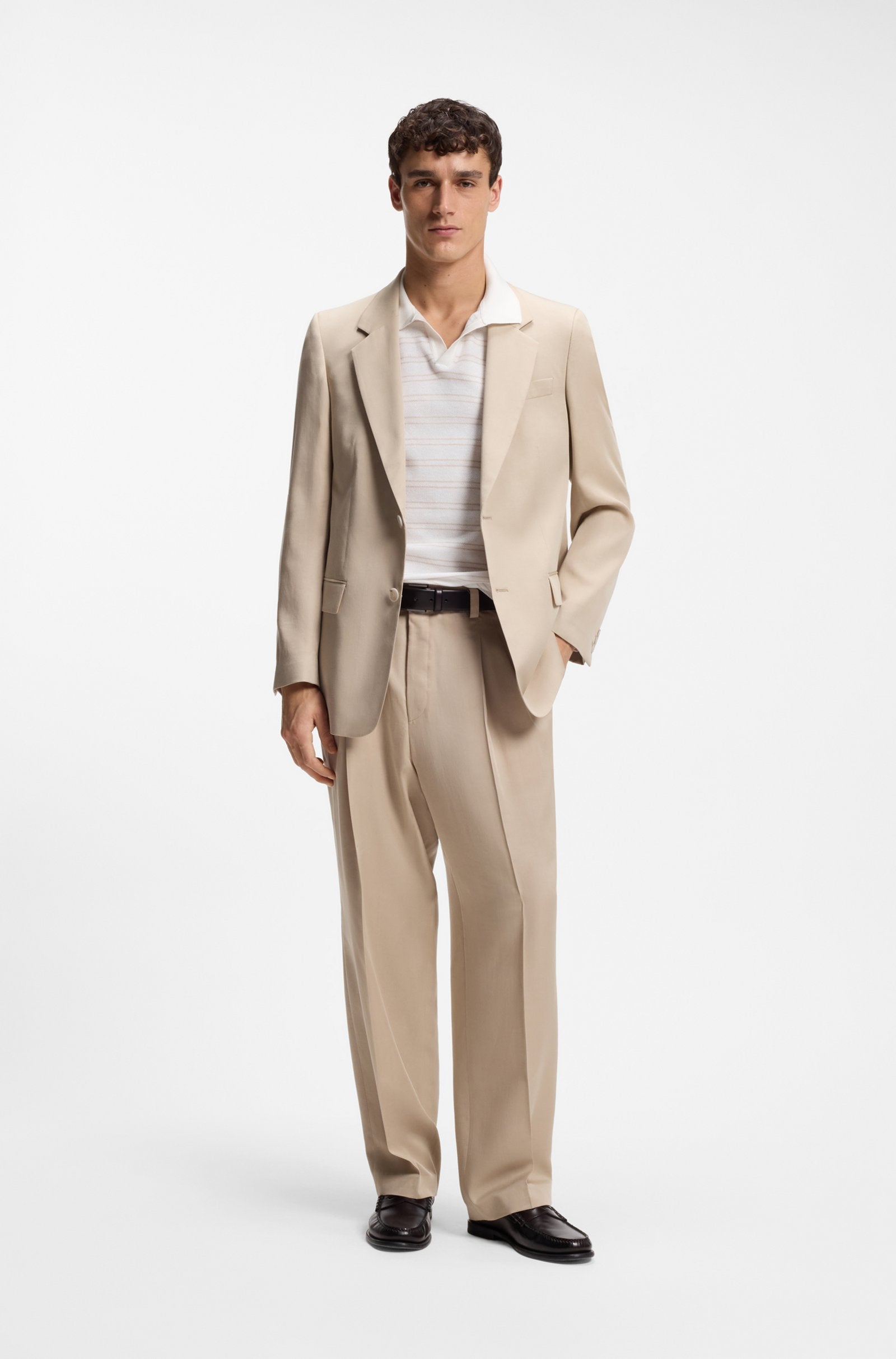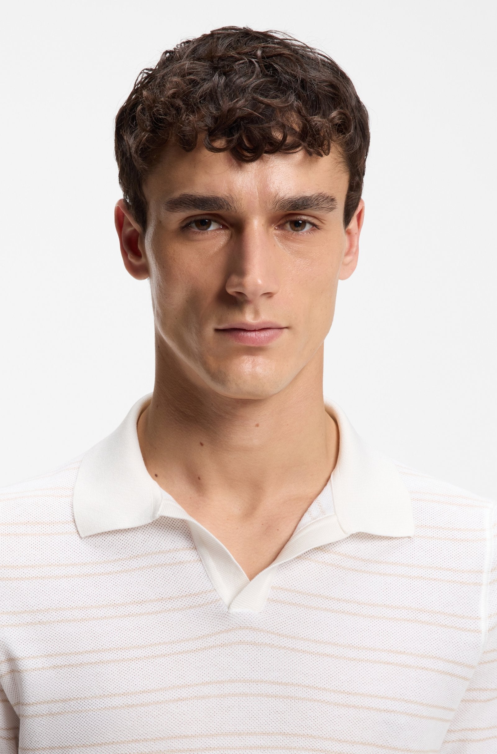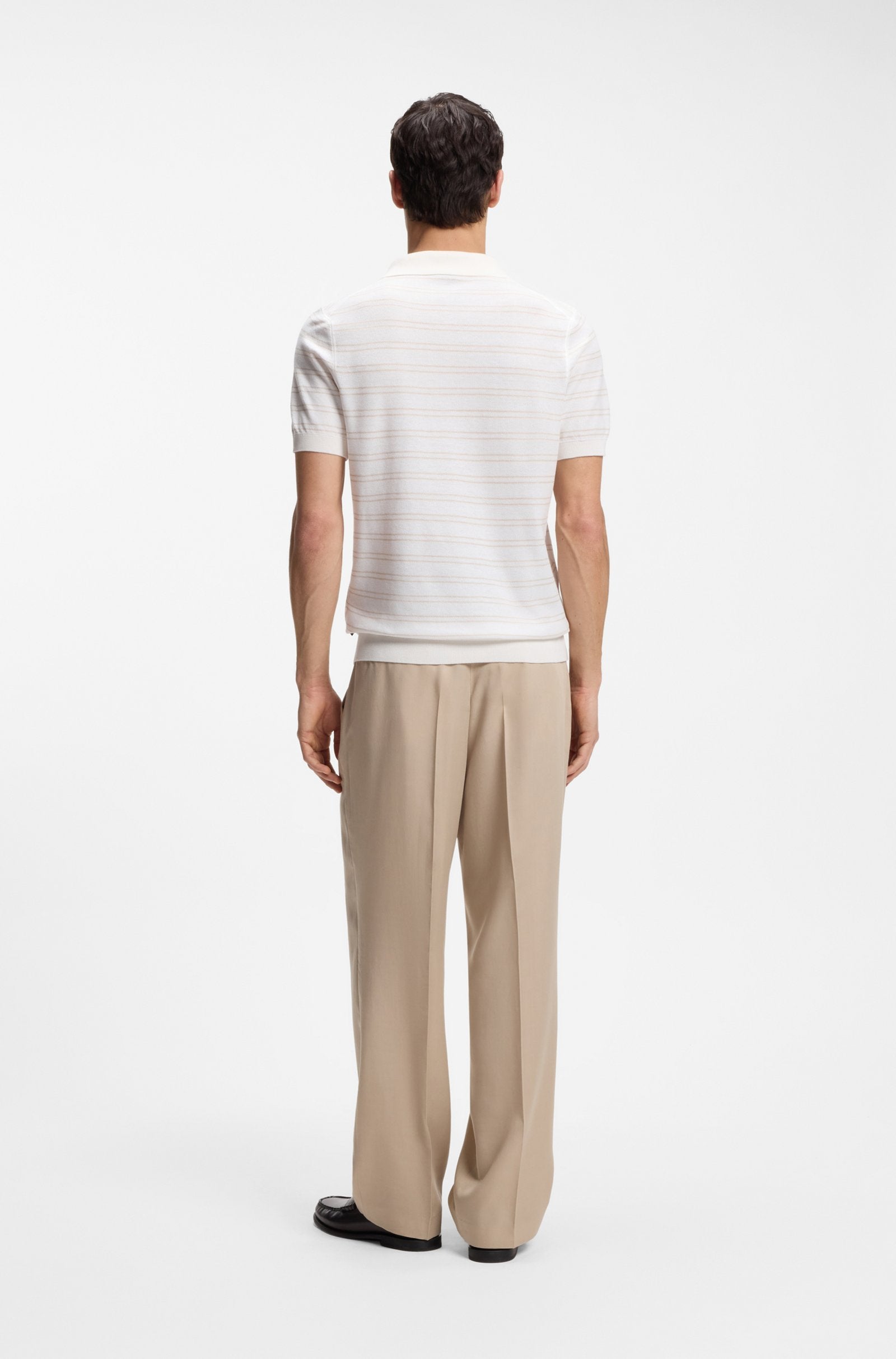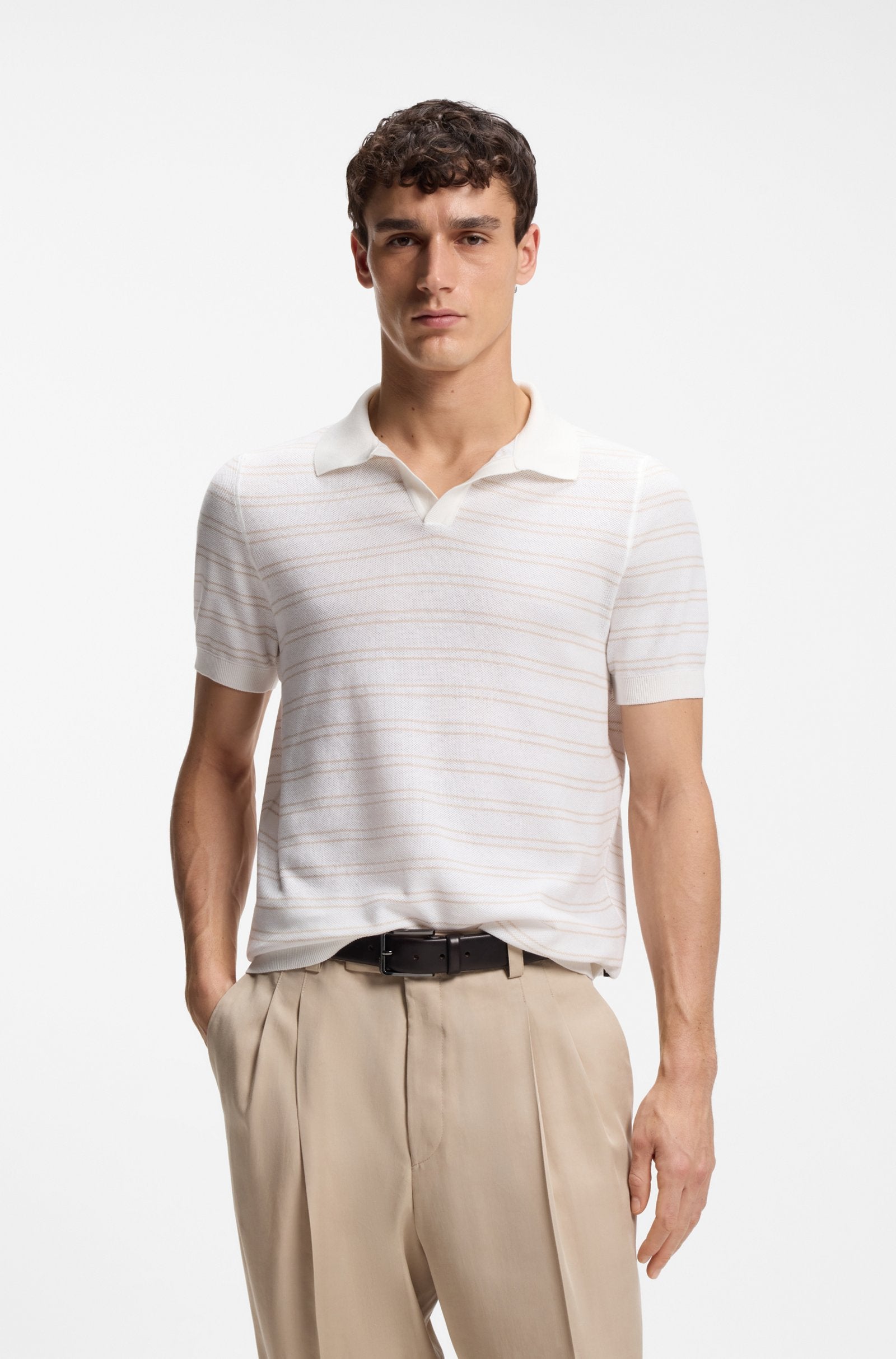 With a polo collar and clean horizontal stripe, this BOSS Menswear short-sleeve knit is a timeless essential. Crafted from soft, cotton-blend yarn. Easy regular fit.