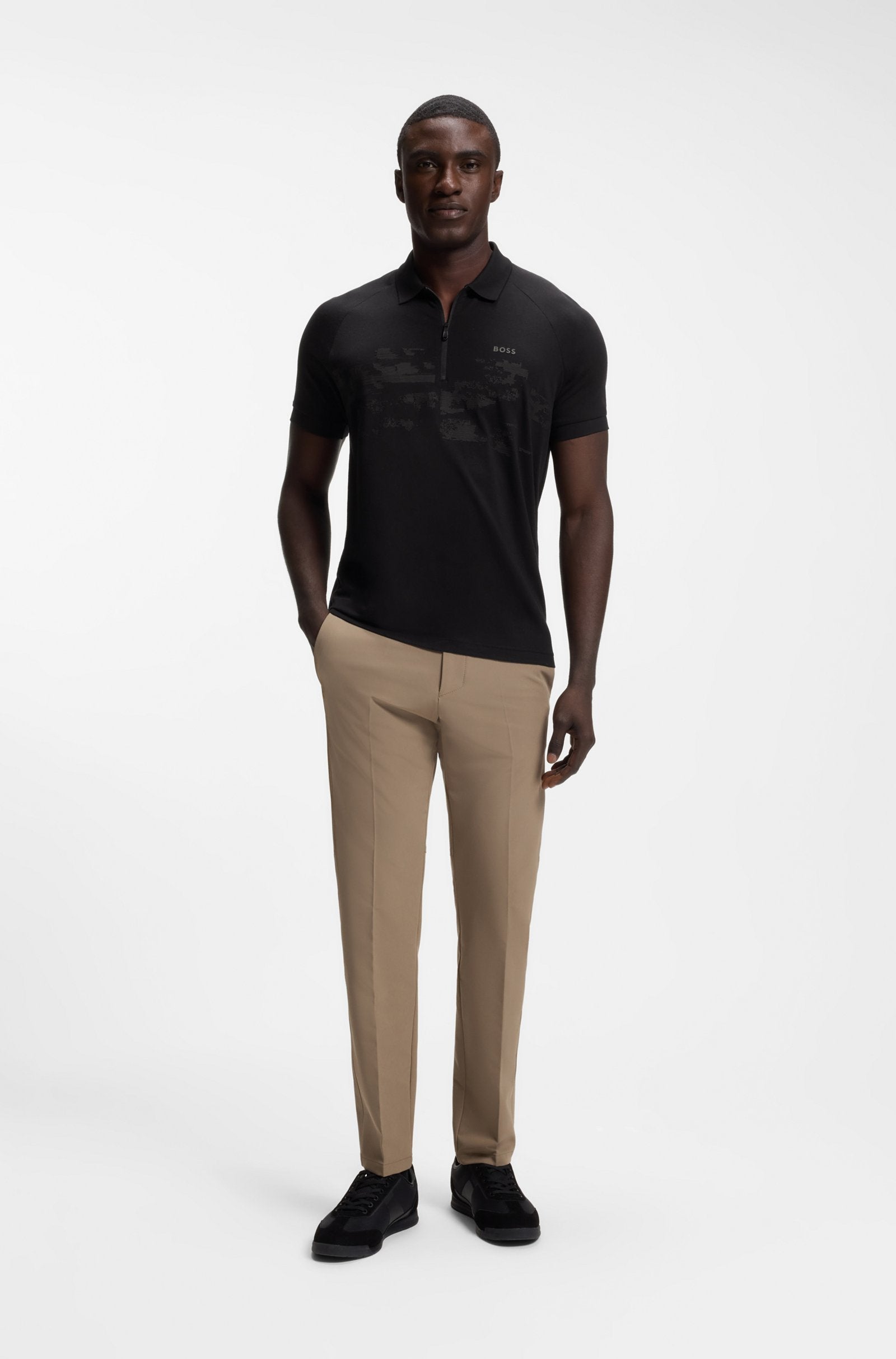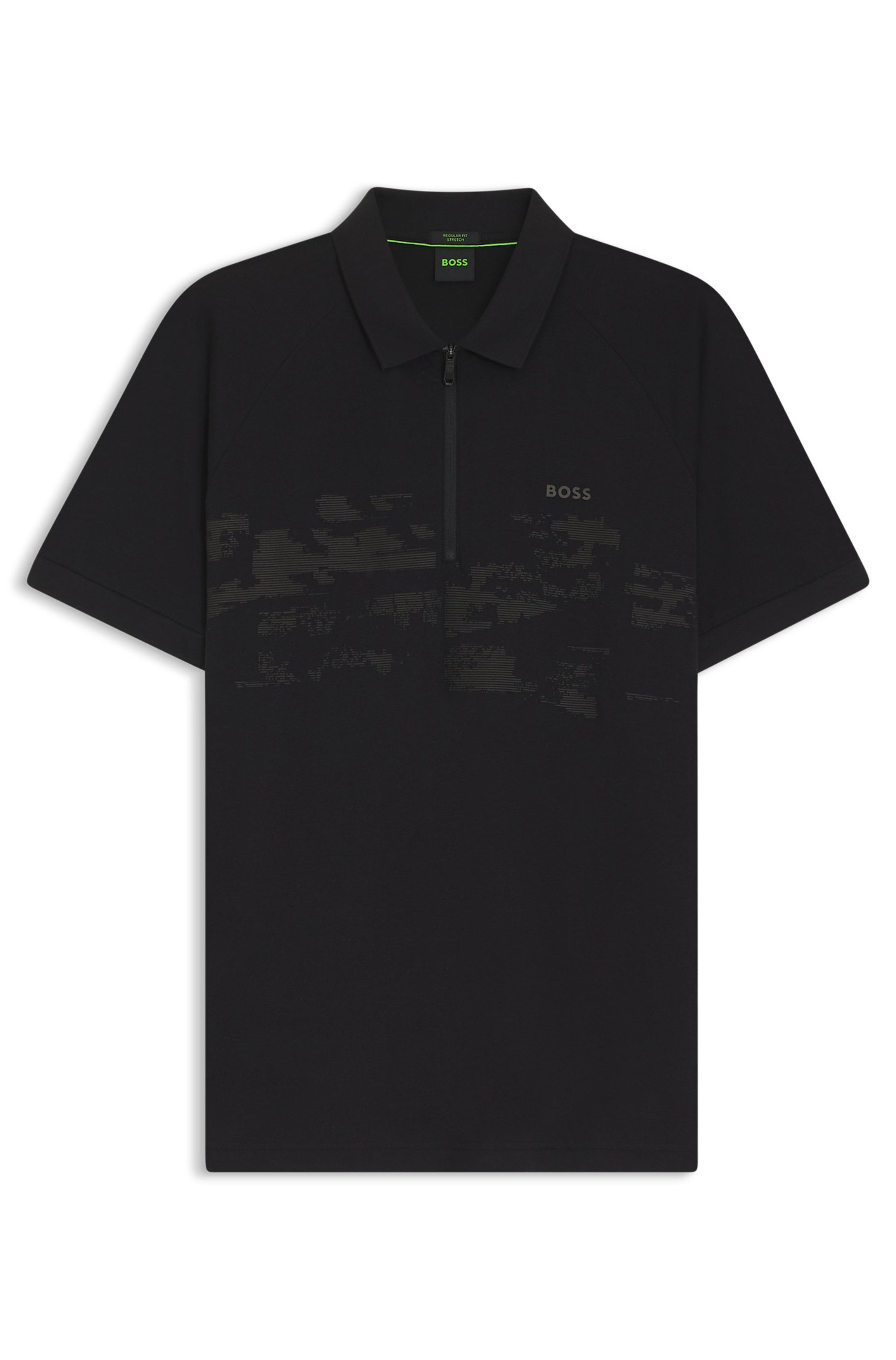 With its sporty zip and stretchy cotton blend, this regular-fit BOSS Menswear polo shirt will elevate any casual look. Decorative reflective branding and graphics.