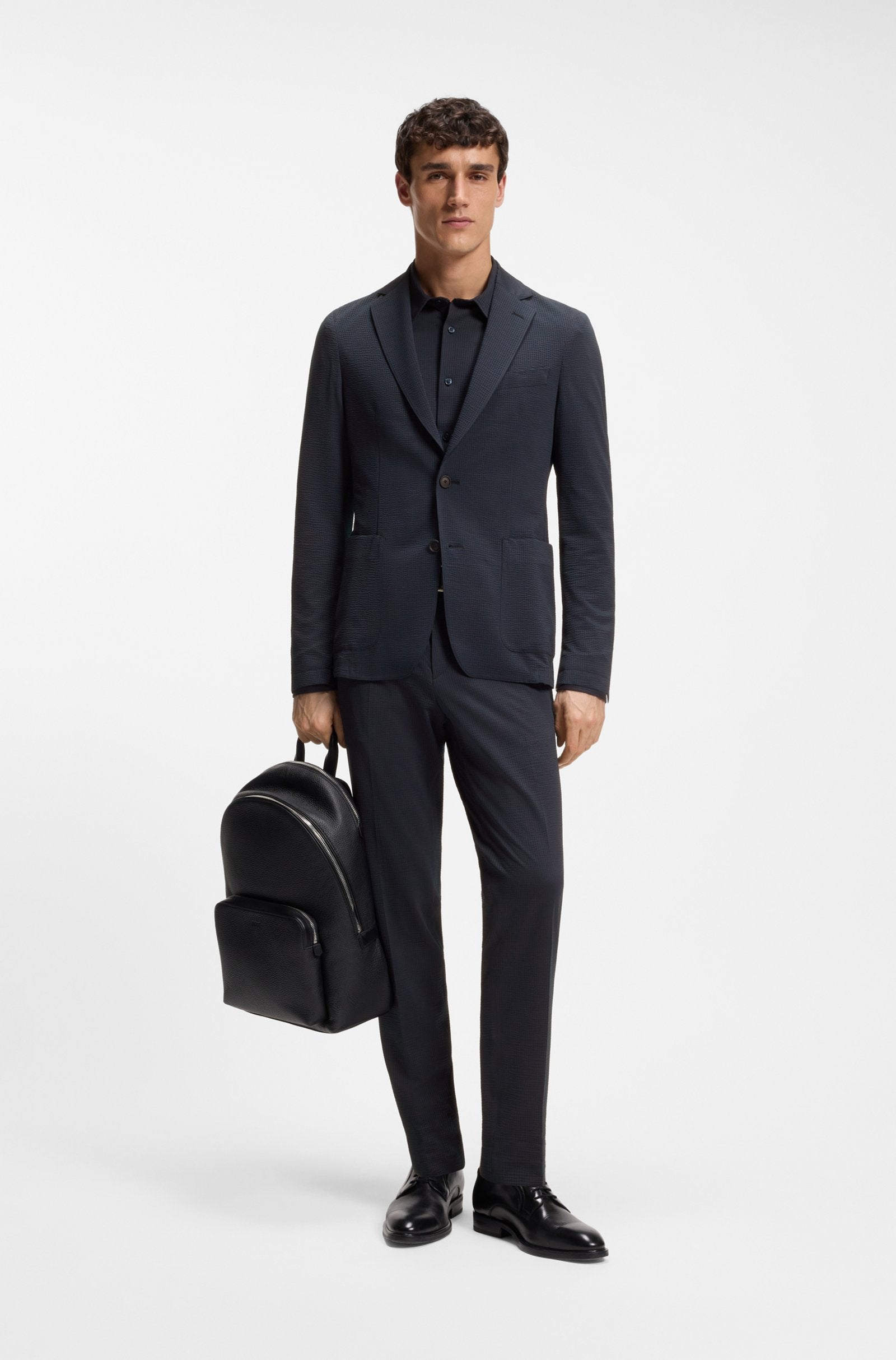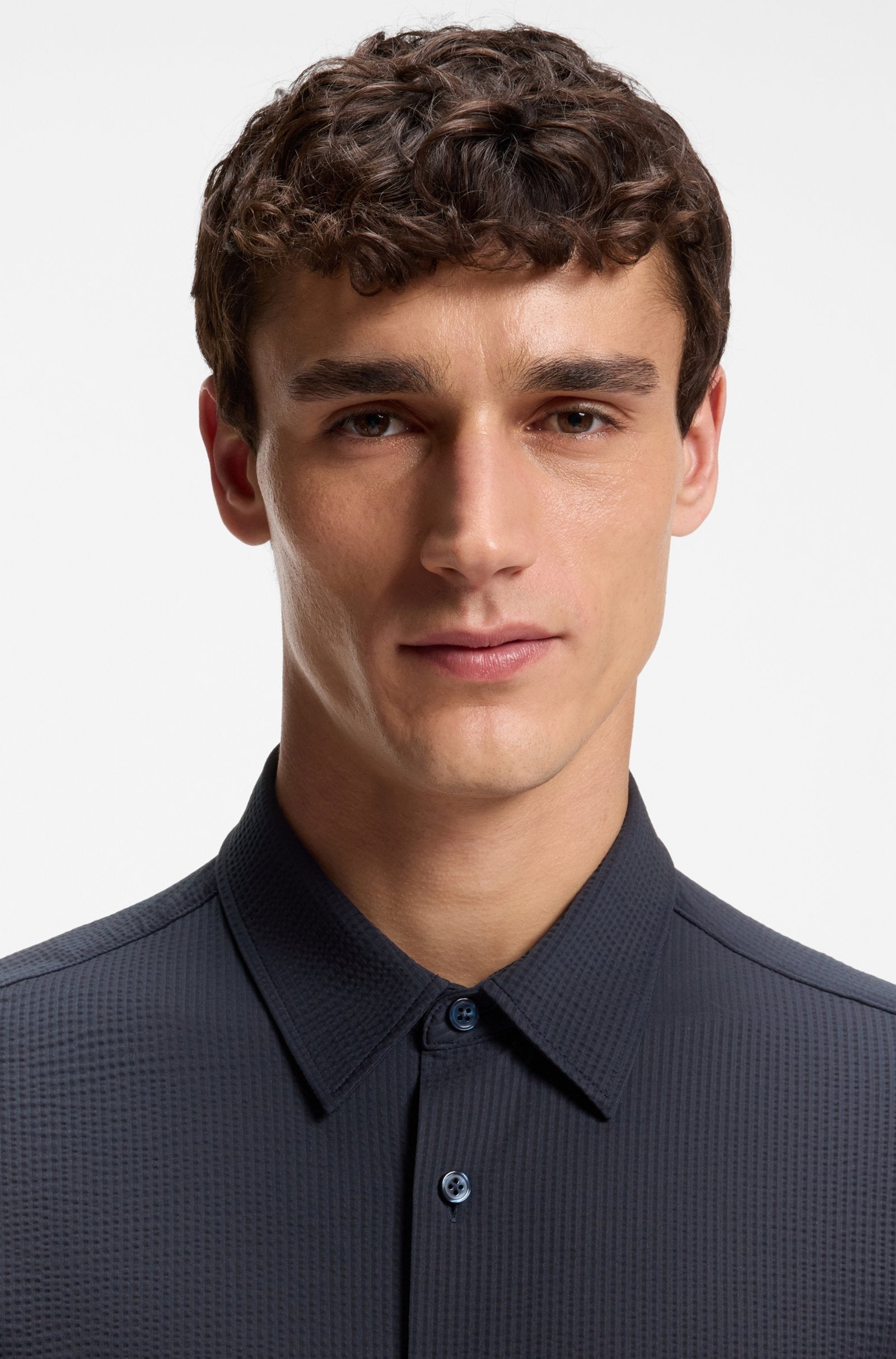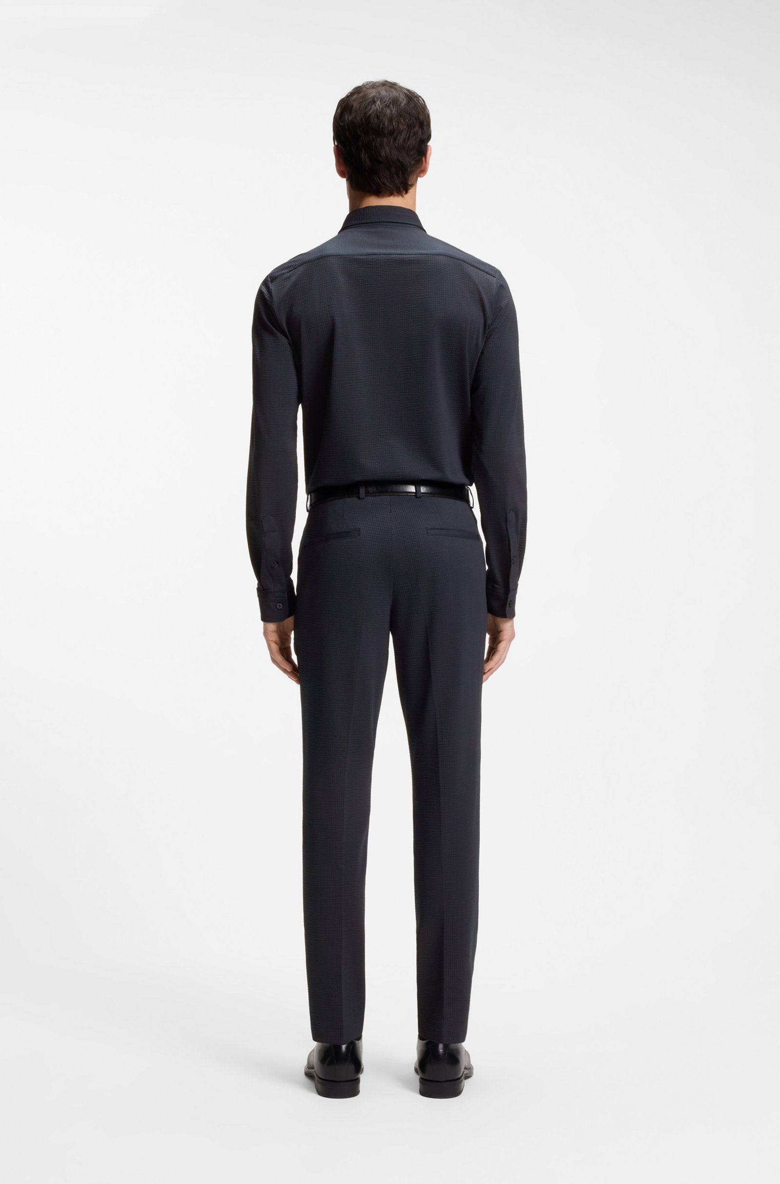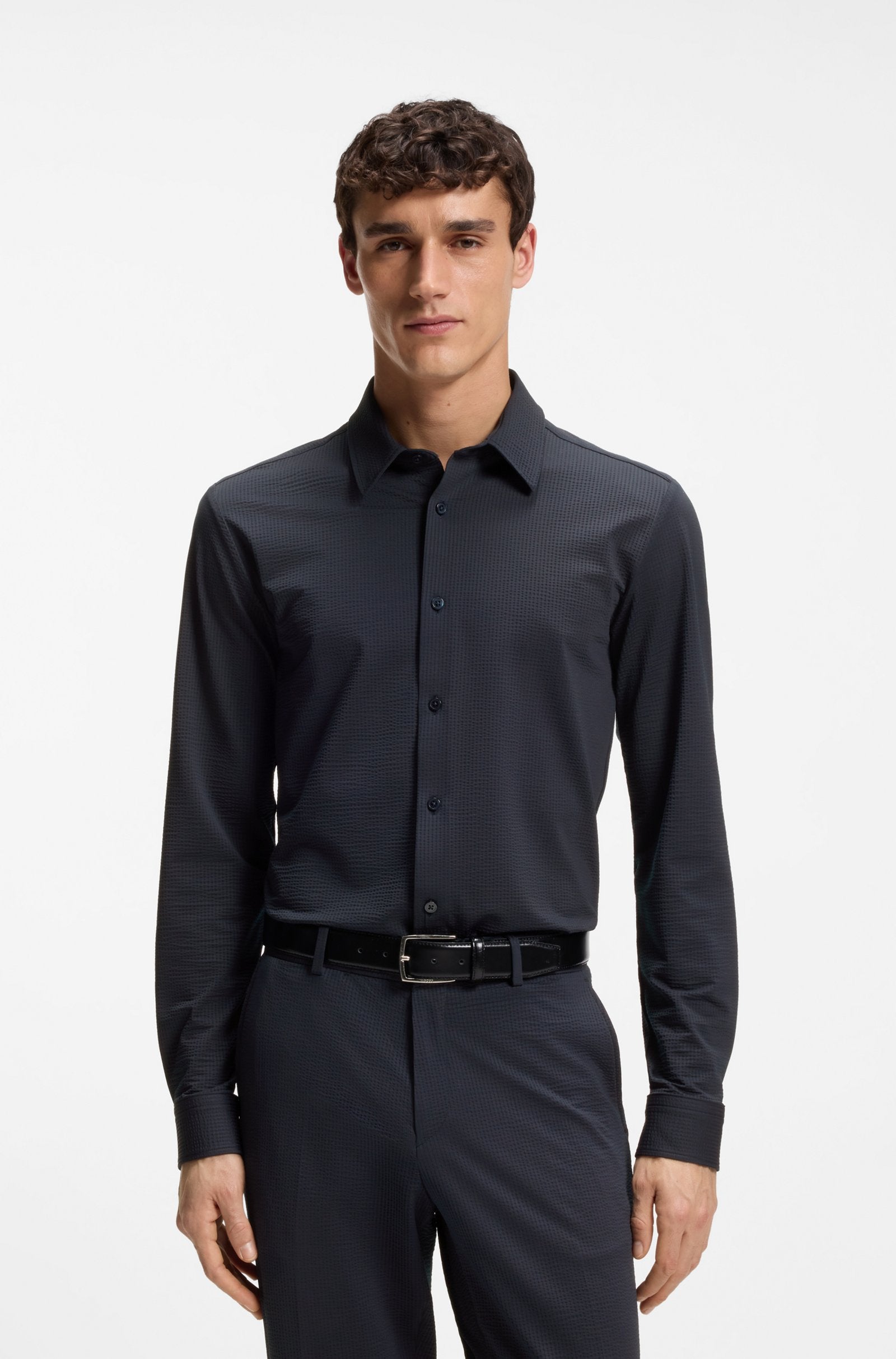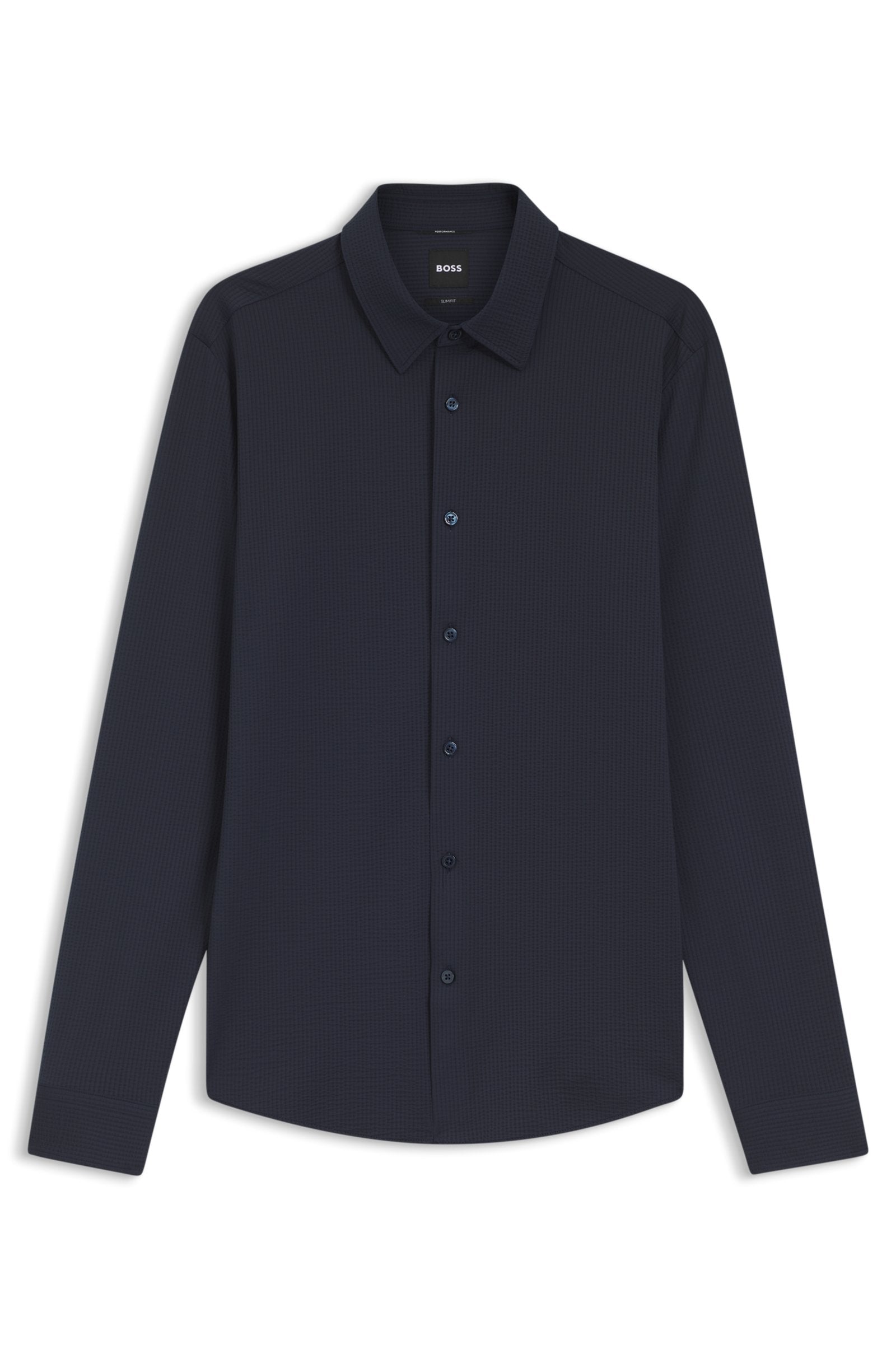 In Italian-crafted seersucker fabric with super-flex performance, this comfortable BOSS Menswear shirt offers breathability and moisture management. Cut to a clean slim fit.