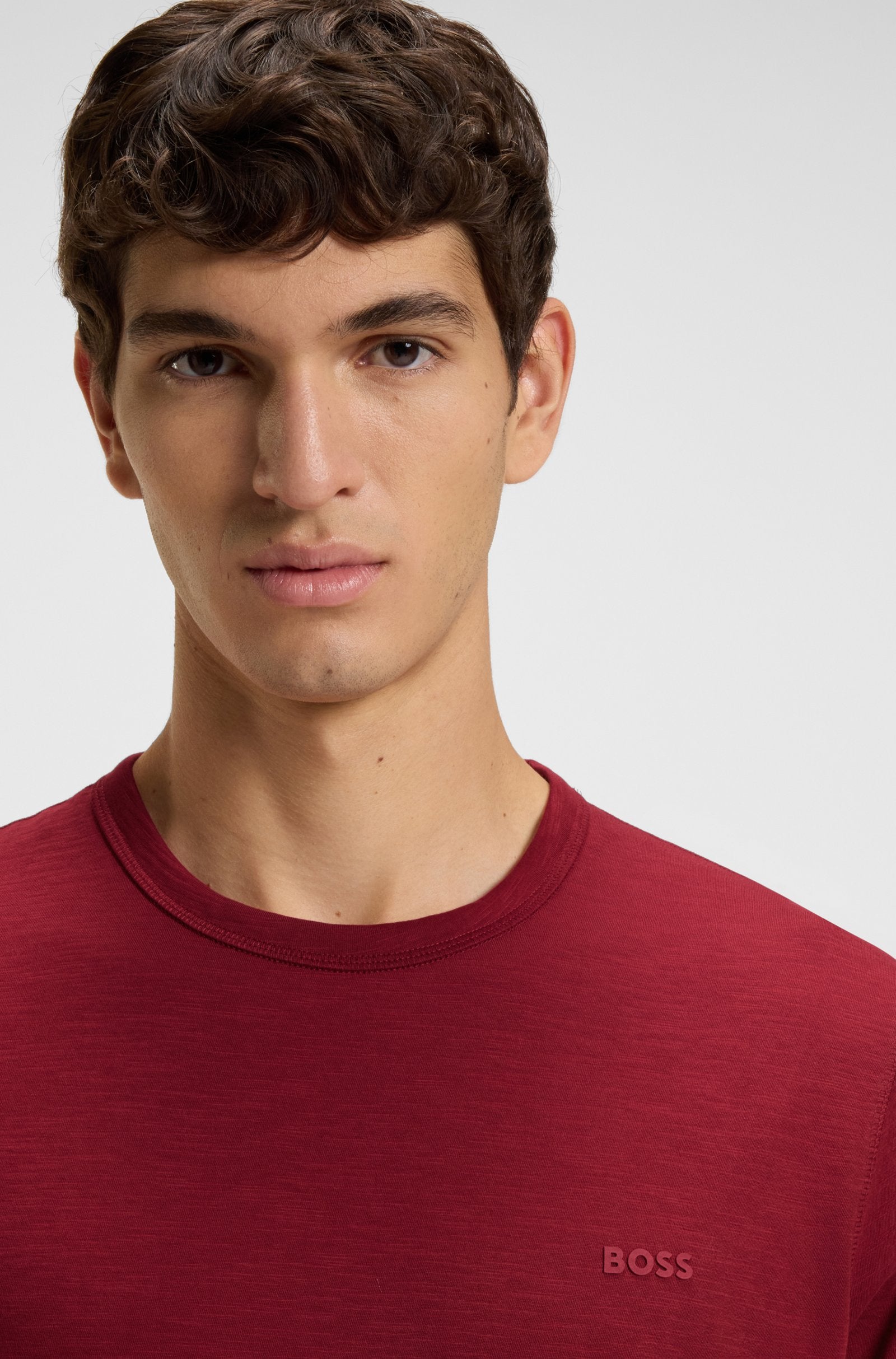 An essential T-shirt by BOSS Menswear. Featuring a logo at the left chest, this regular-fit top is crafted in soft slub-cotton jersey.