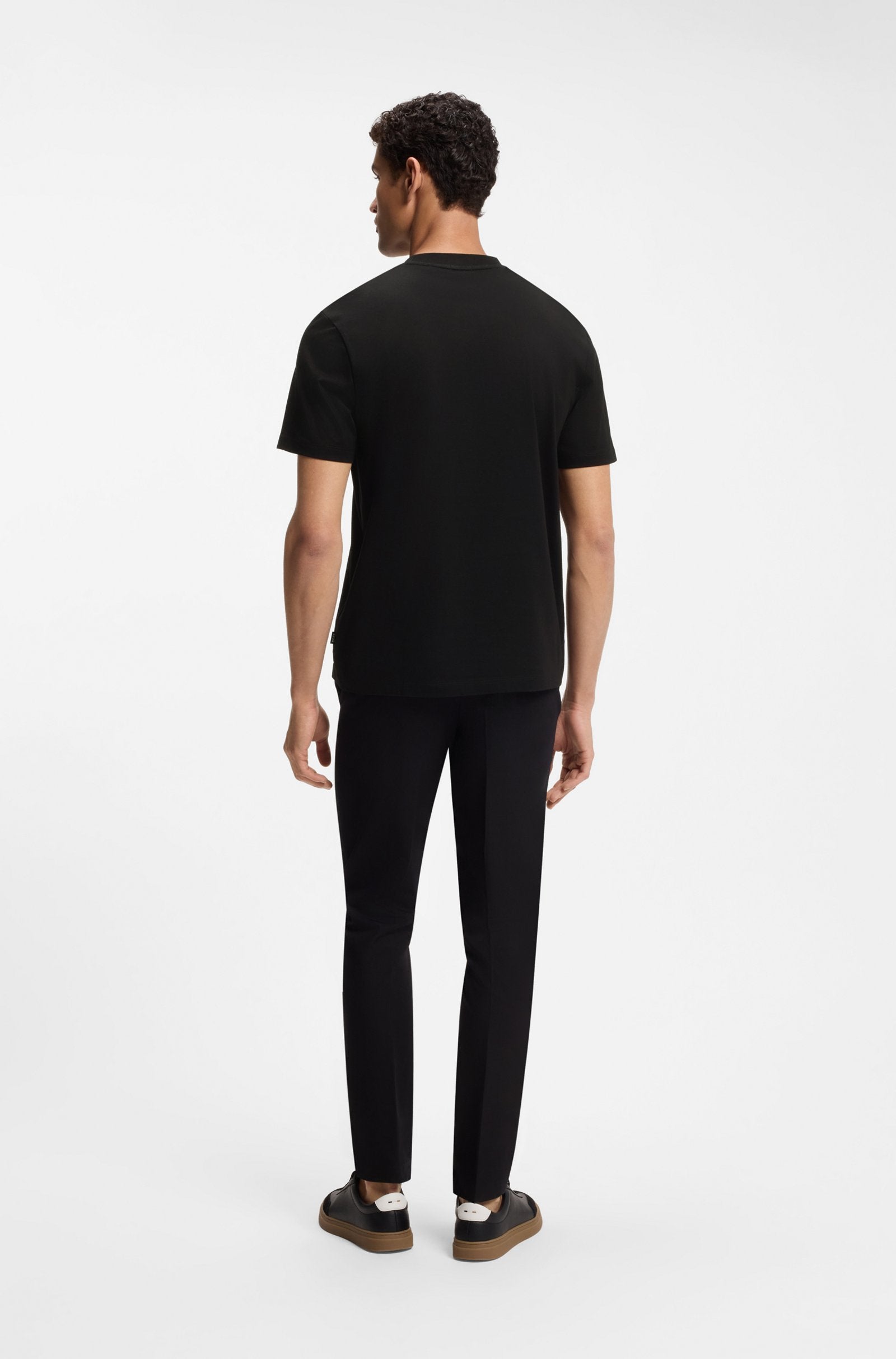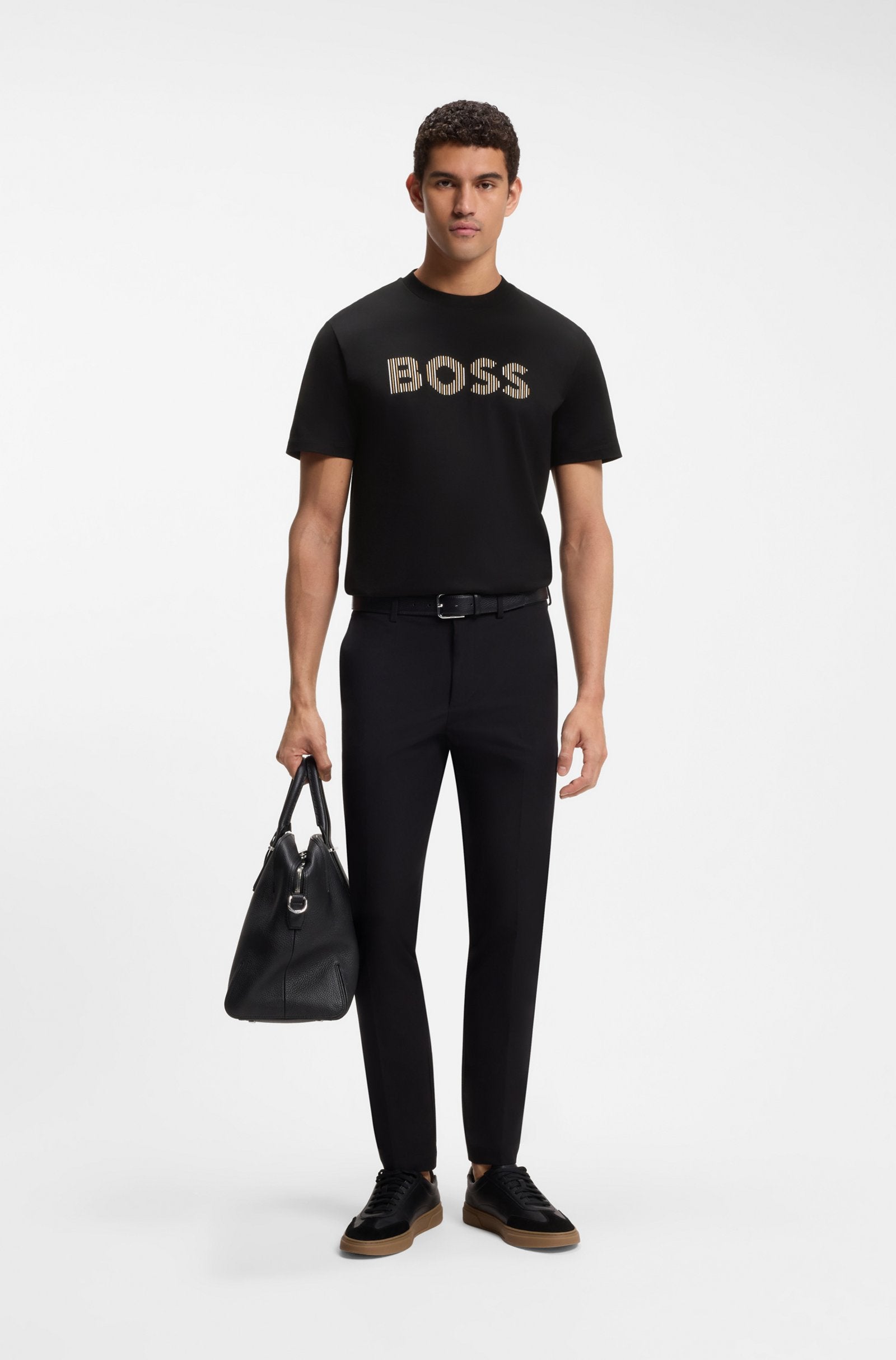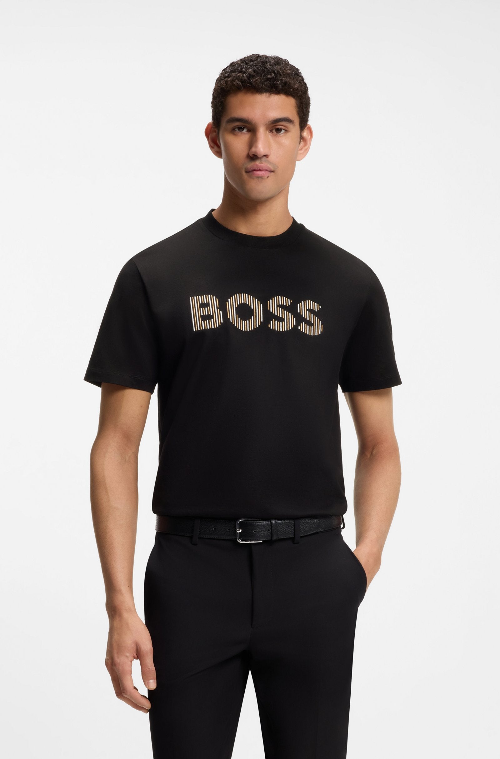 With mixed-media stripe artwork at the chest, this BOSS Menswear T-shirt will add character to your casual looks. Regular fit. Soft cotton jersey.