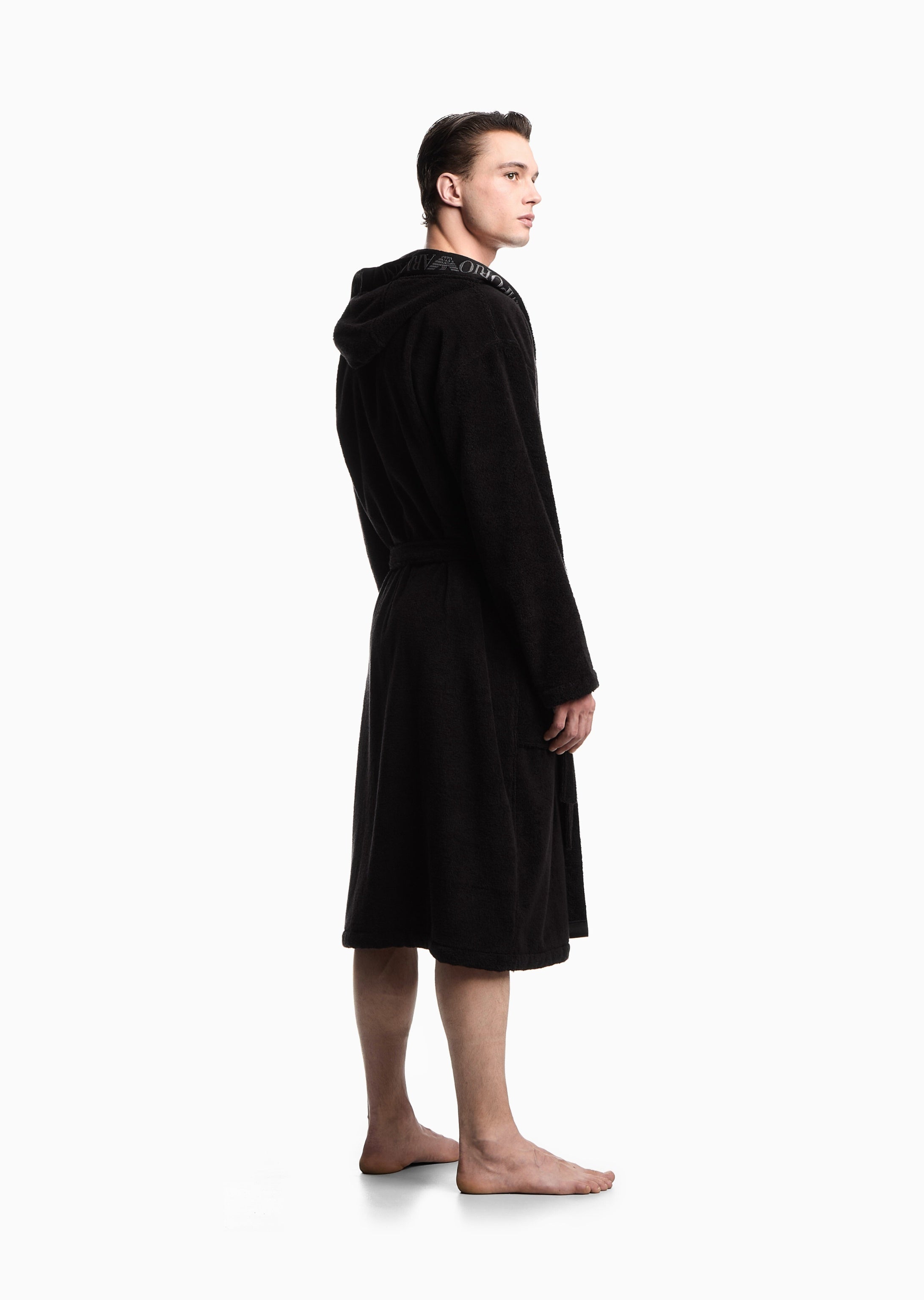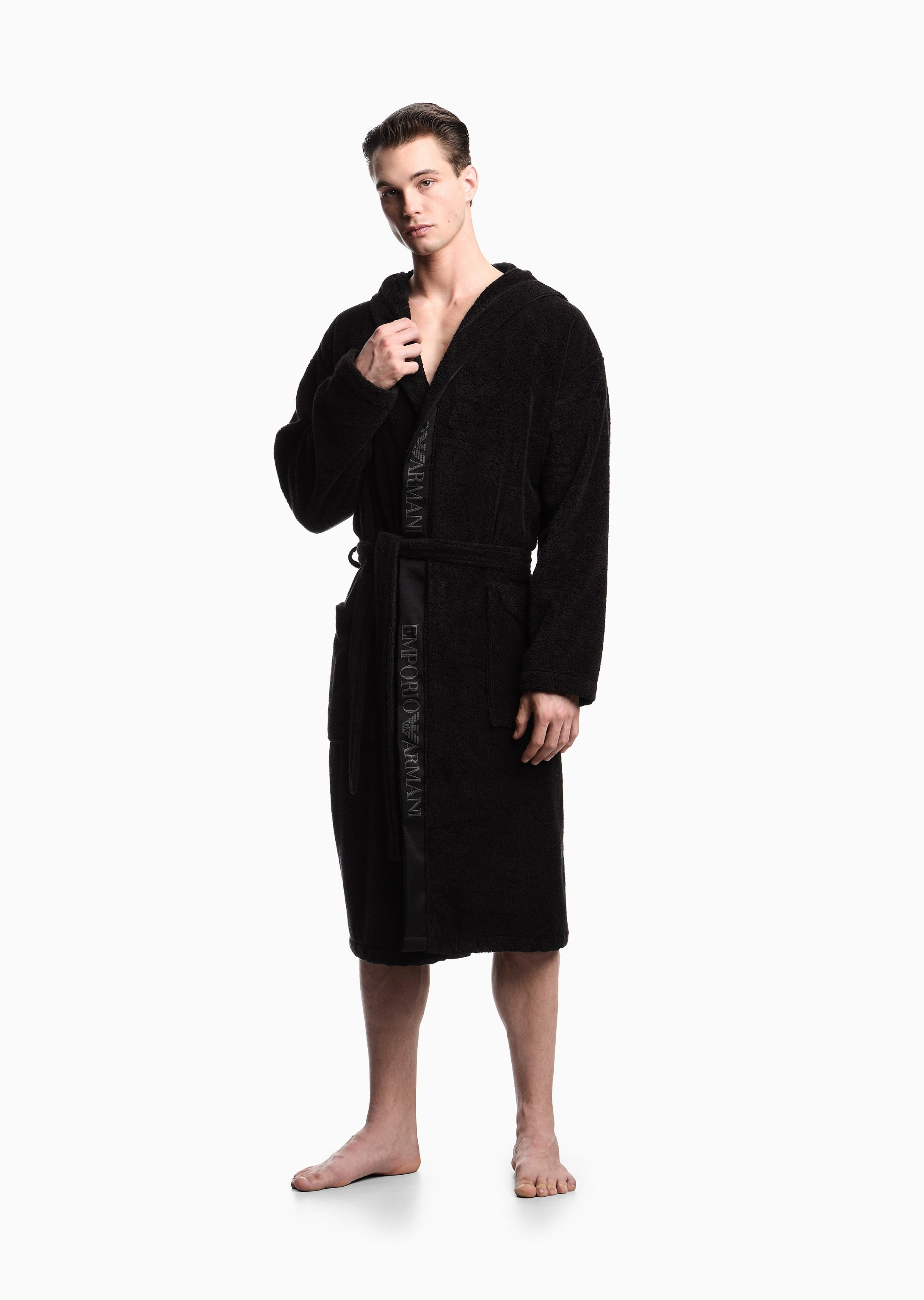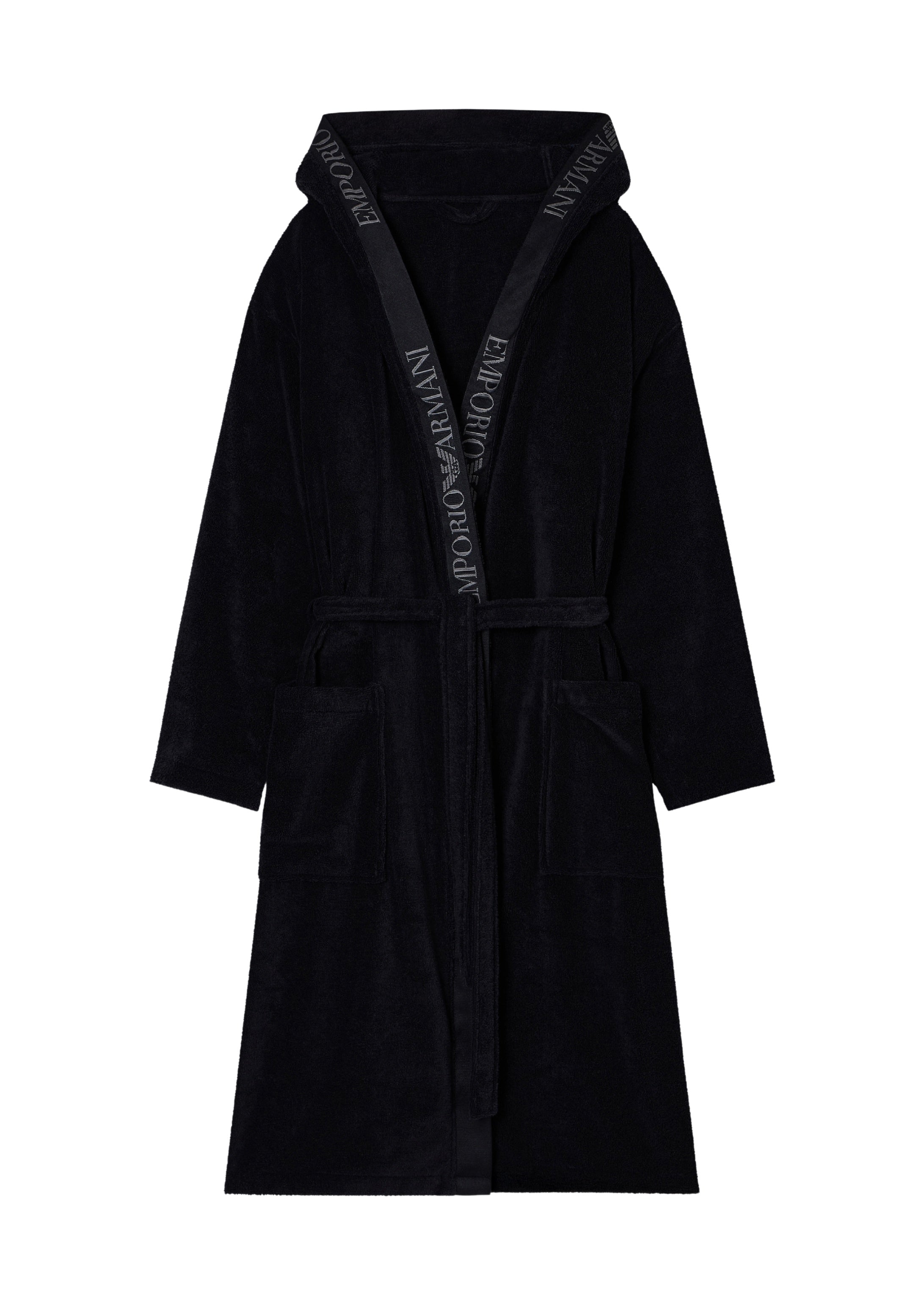 Pure cotton terrycloth bathrobe with hood and matching belt at the waist. Jacquard logo trim.