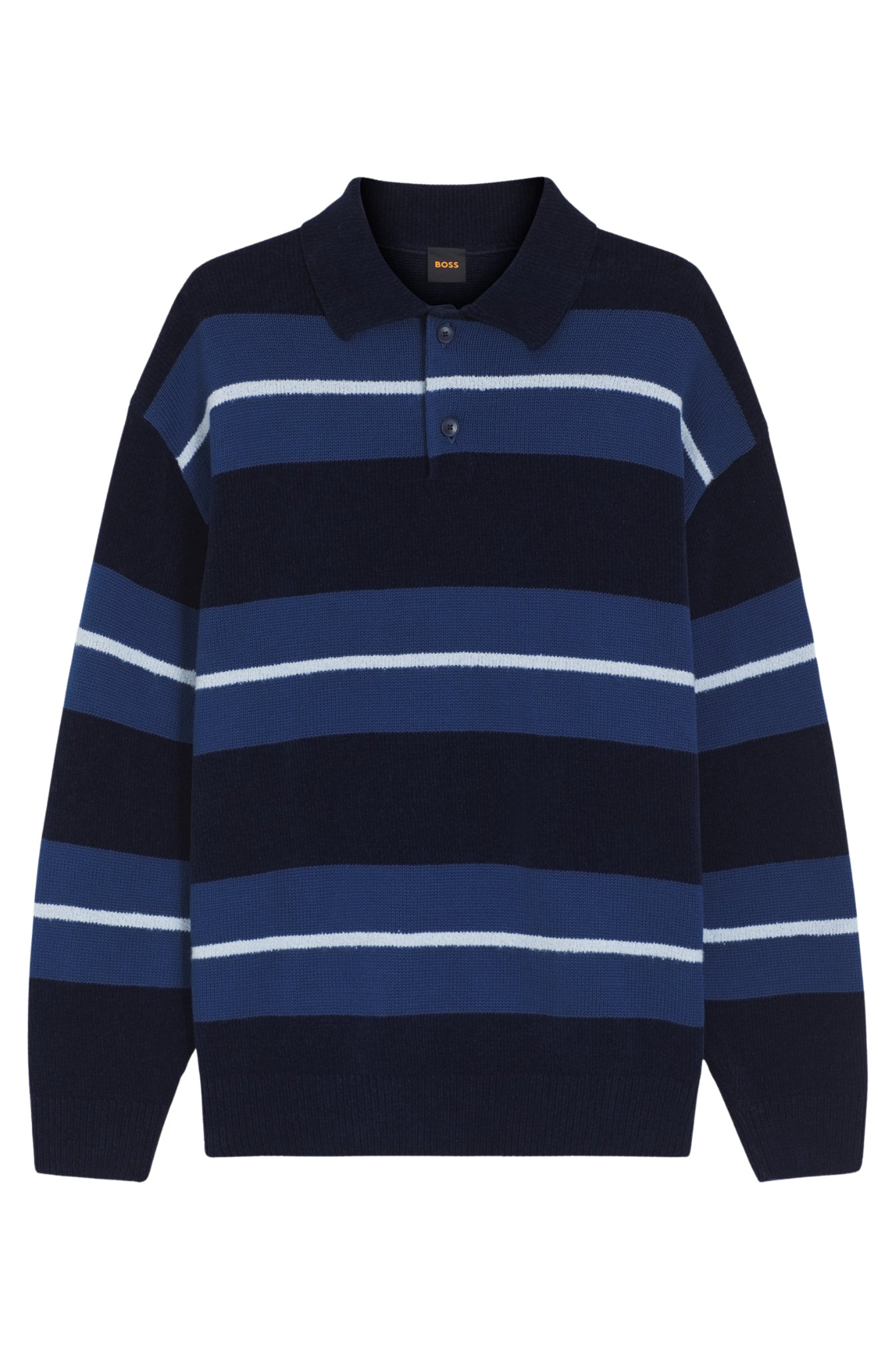 Crafted with structured block stripes, this BOSS Menswear knit polo is a timeless layer. Easy-wear relaxed fit. Cosy cotton-rich blend with wool.