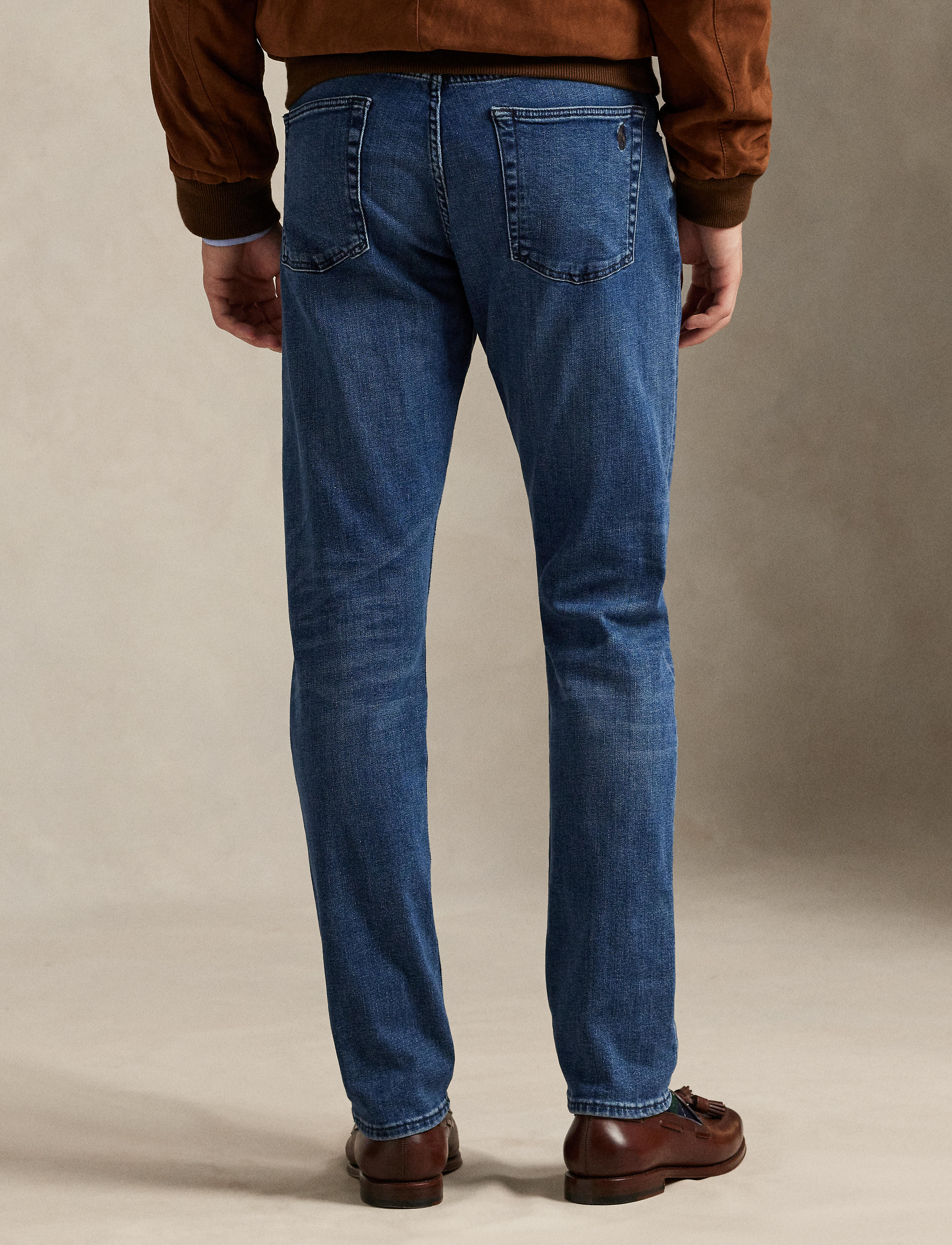 - Five-pocket styling. Metal rivets custom-developed with a “PRL 67” logo. Leather “Polo Ralph Lauren” patch at the back right waist.