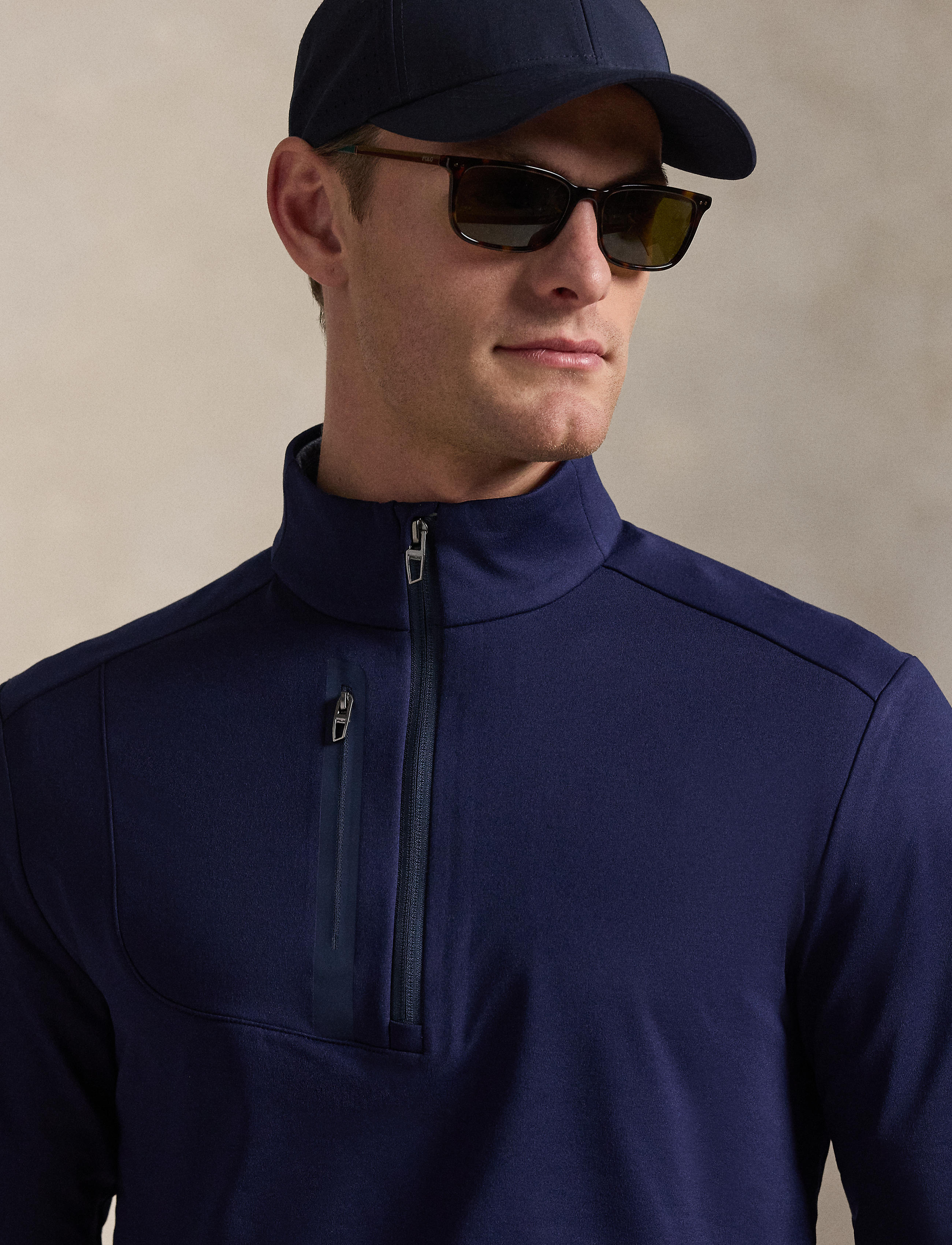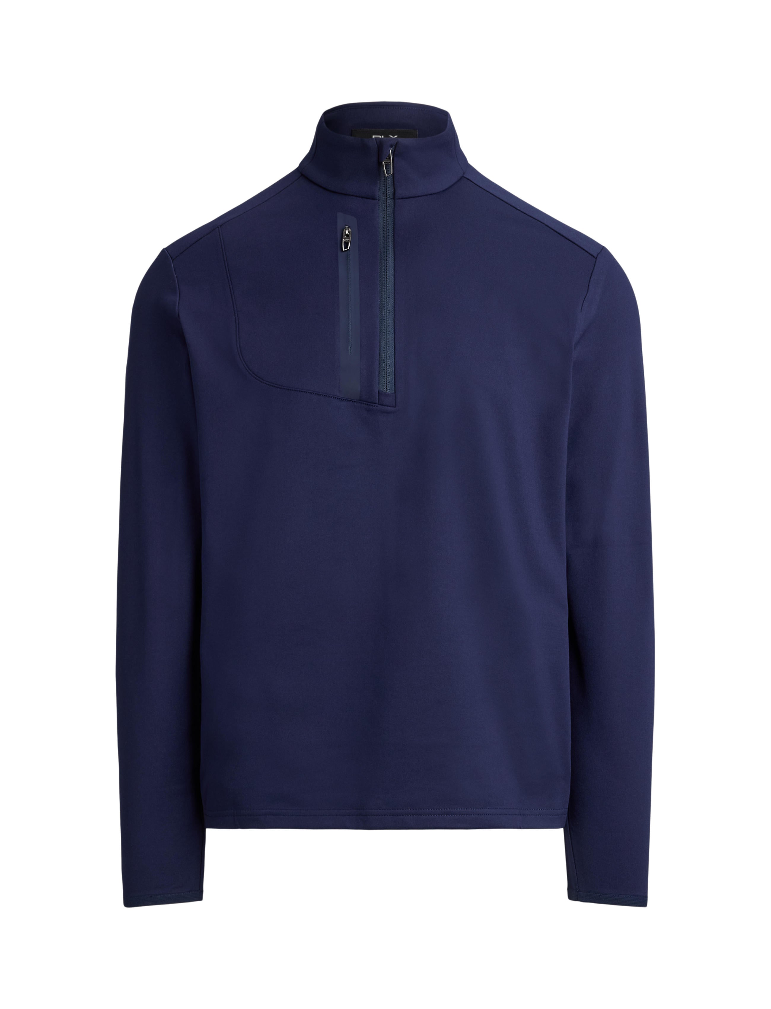 • Mockneck. Quarter-zip placket with a flap at the top that prevents chafing.