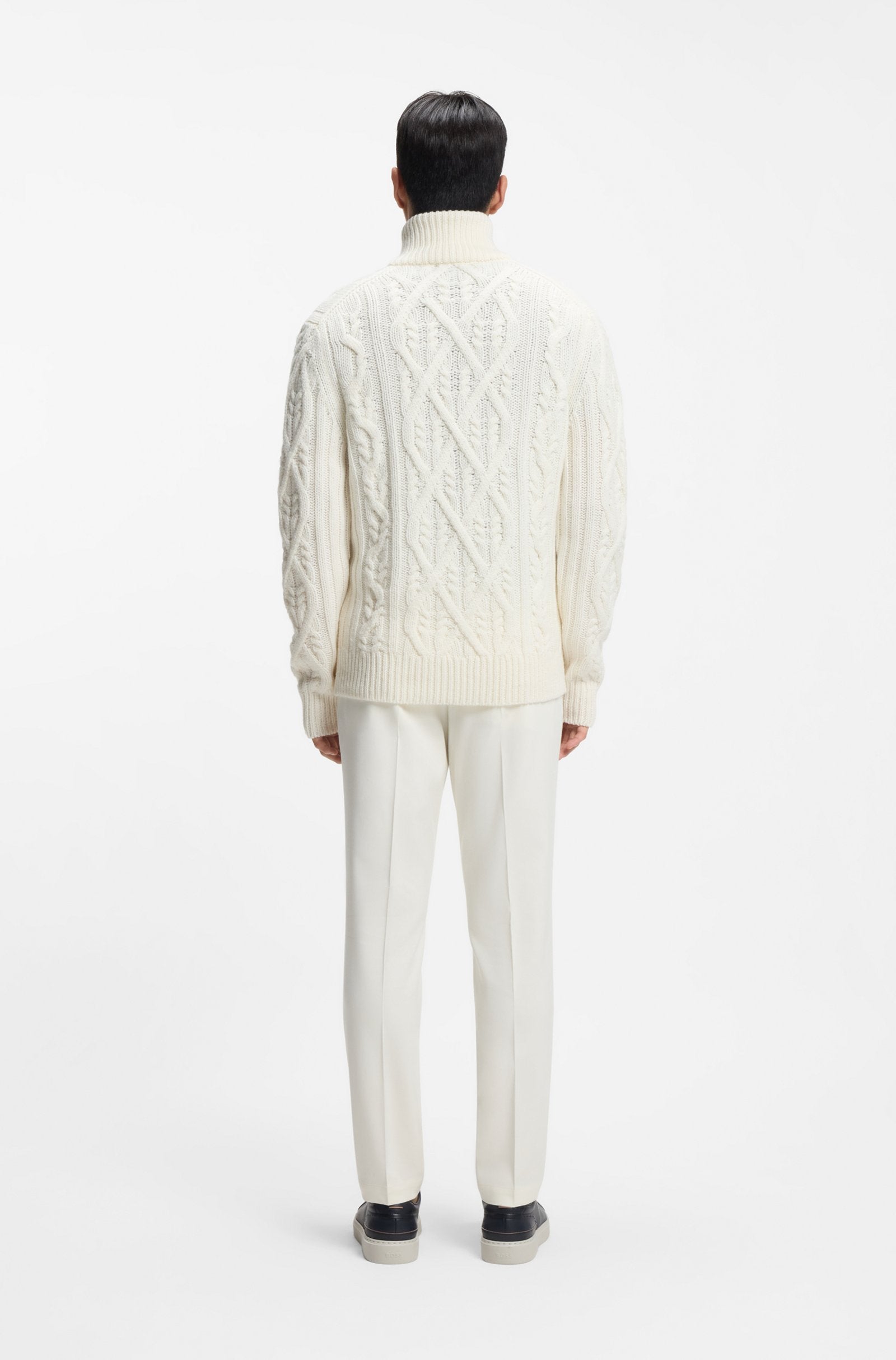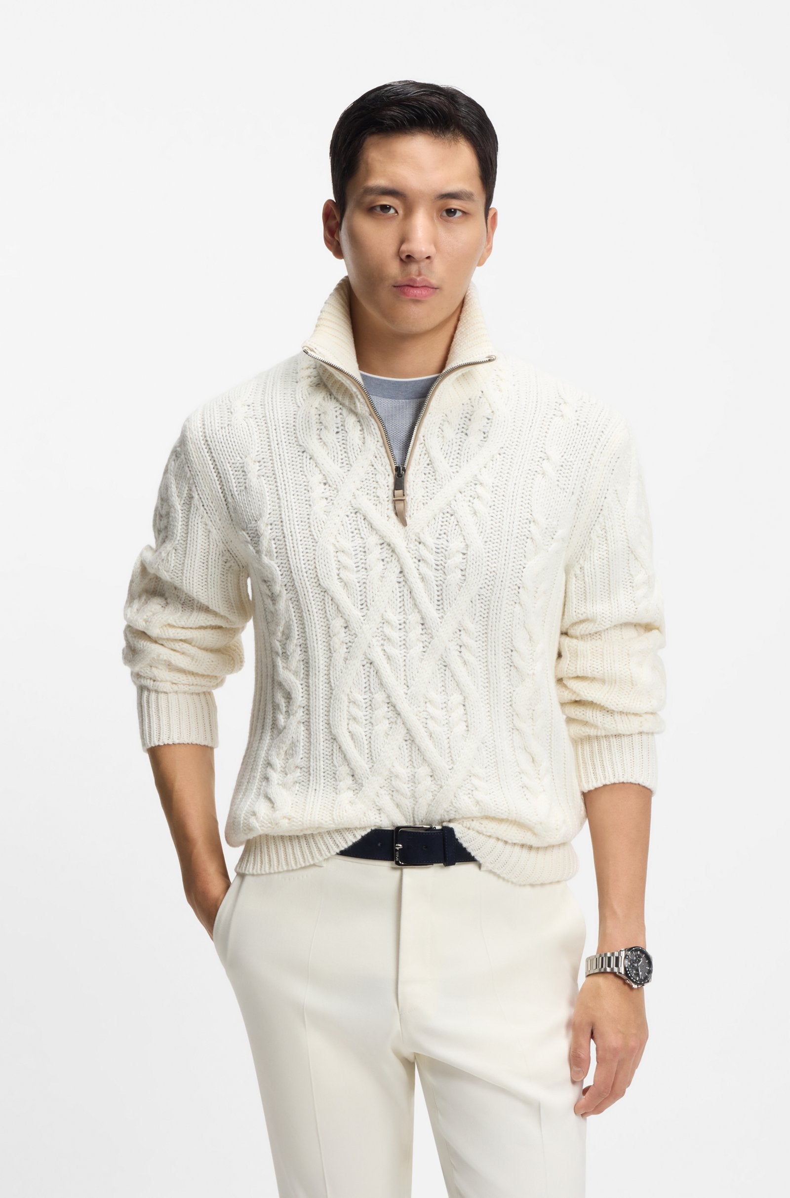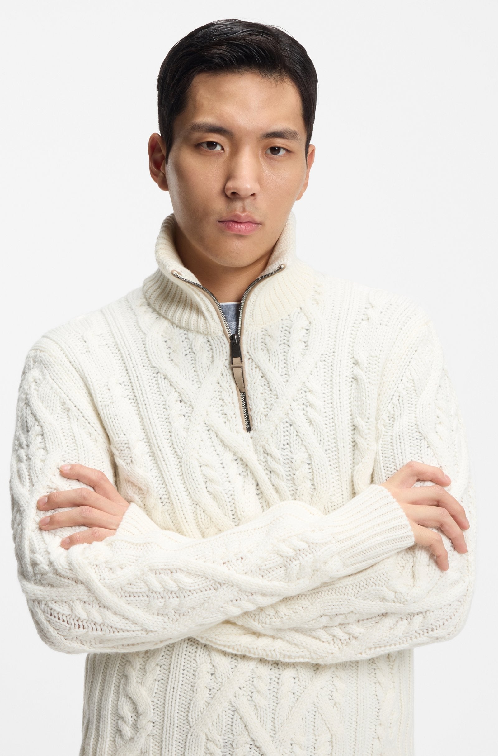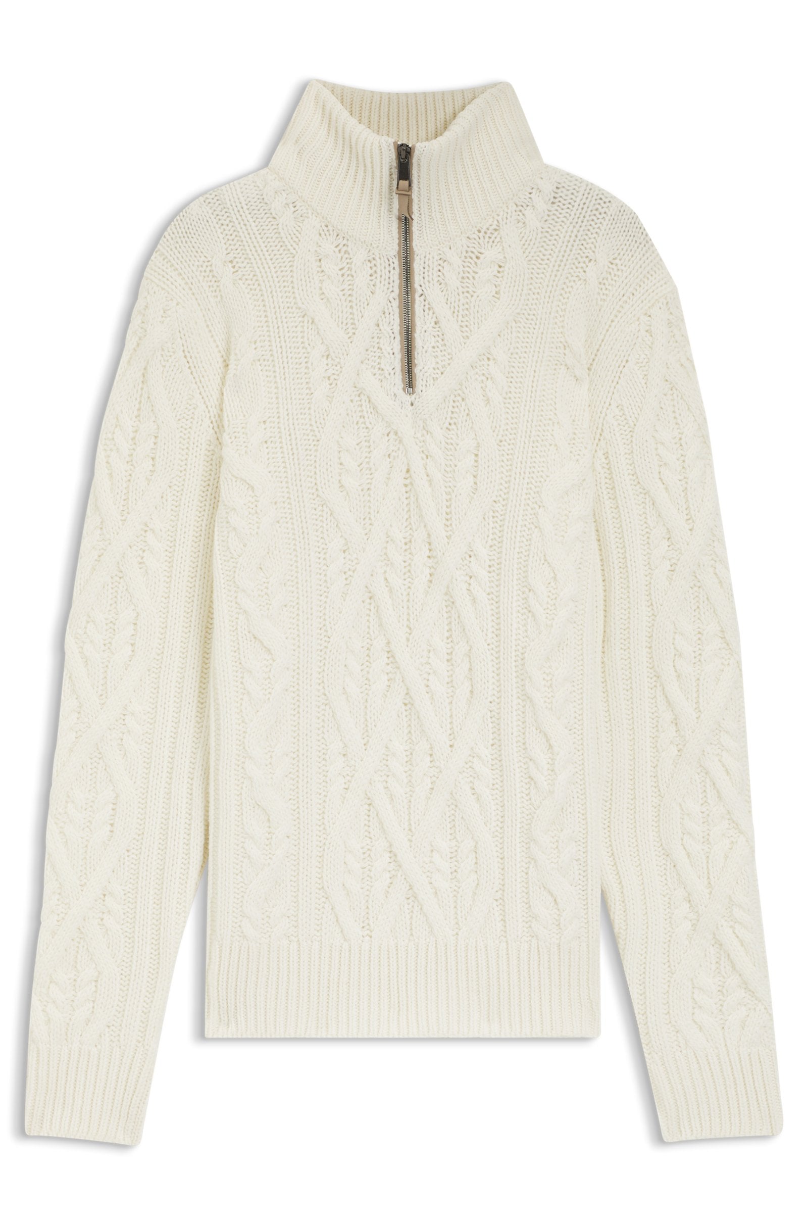 Knitted in rich yarns made from virgin wool and cashmere, this regular-fit BOSS Menswear sweater is a luxurious layer. Chunky cable structure. Zip neck.
