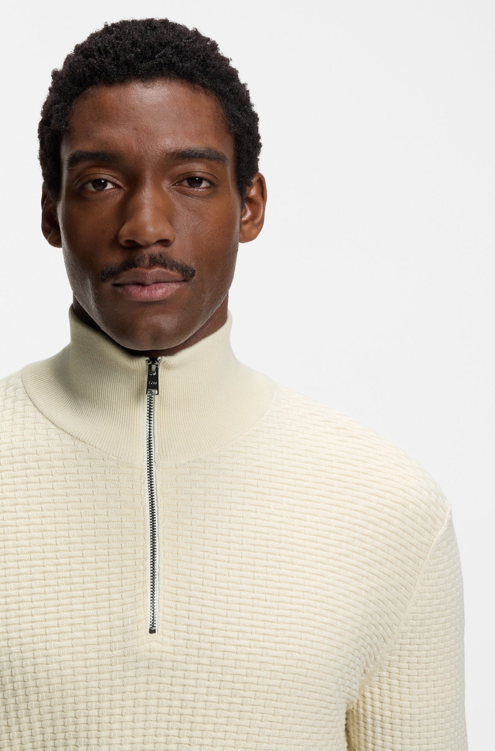 Great for layering in cooler weather, this BOSS Menswear sweater has a straight fit and quarter zip. Rich structure in soft cotton.