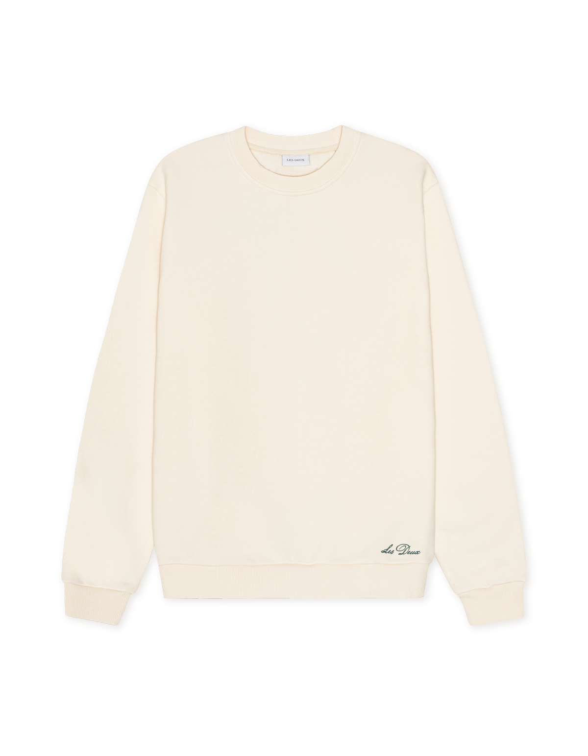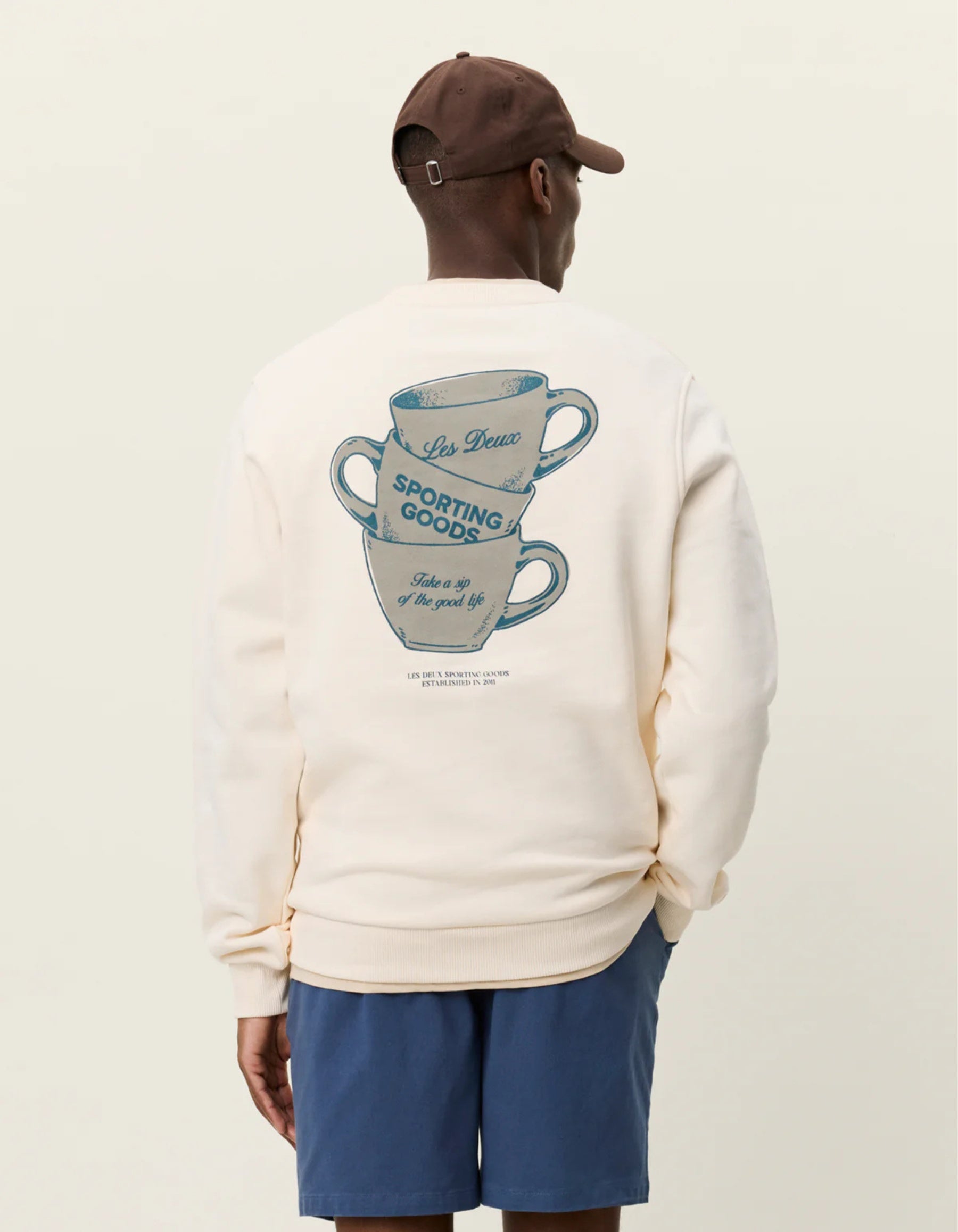 A regular crewneck with a soft brushed feel and a subtle graphic touch. It pairs a small contrast logo at the lower front with a café inspired cup print on the back in muted tones.