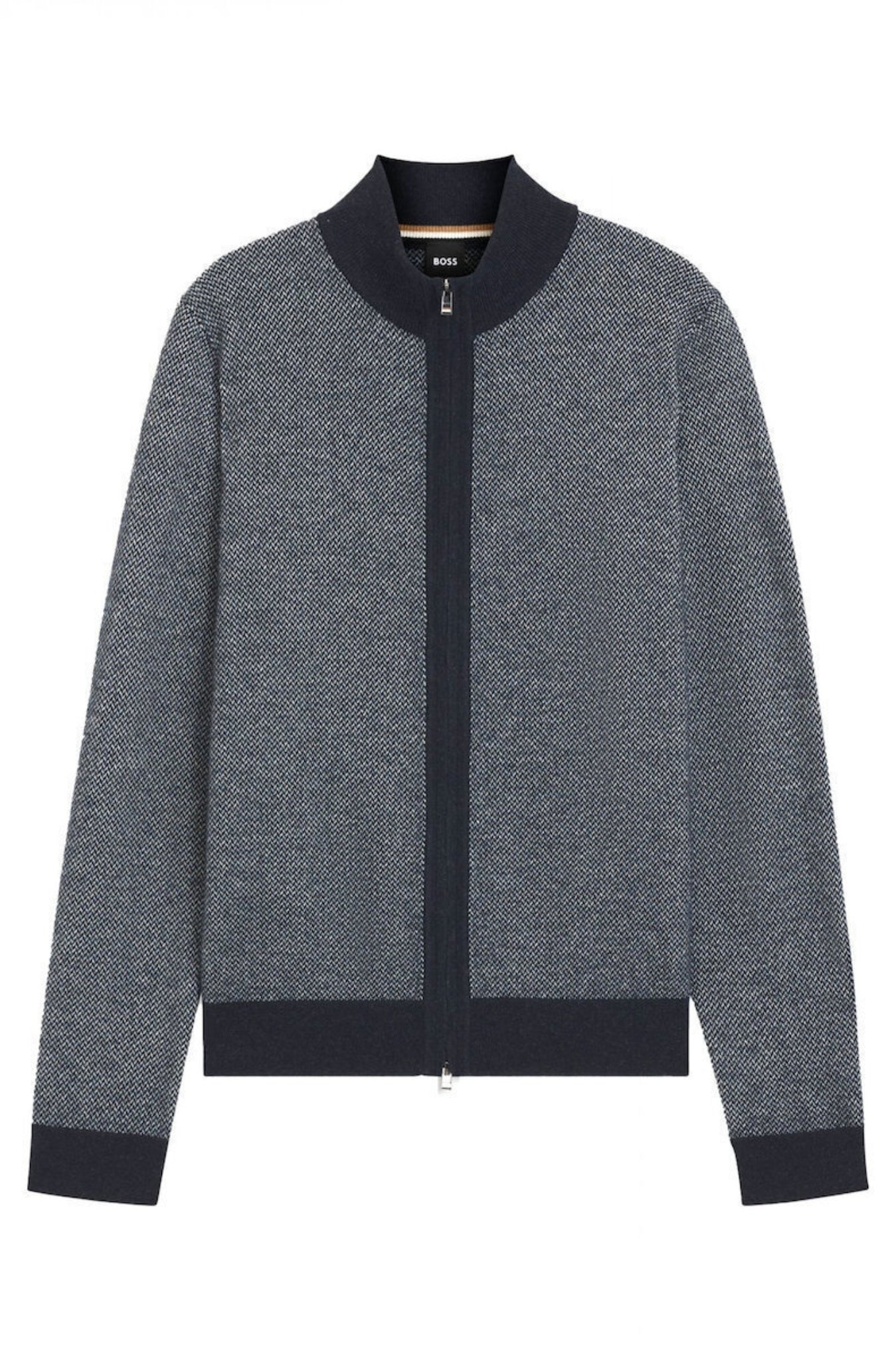 In a layerable fit, this BOSS Menswear sweater carries a rich knitted pattern in yarns made from wool and cotton. Solid trims. Creative zip detailing.