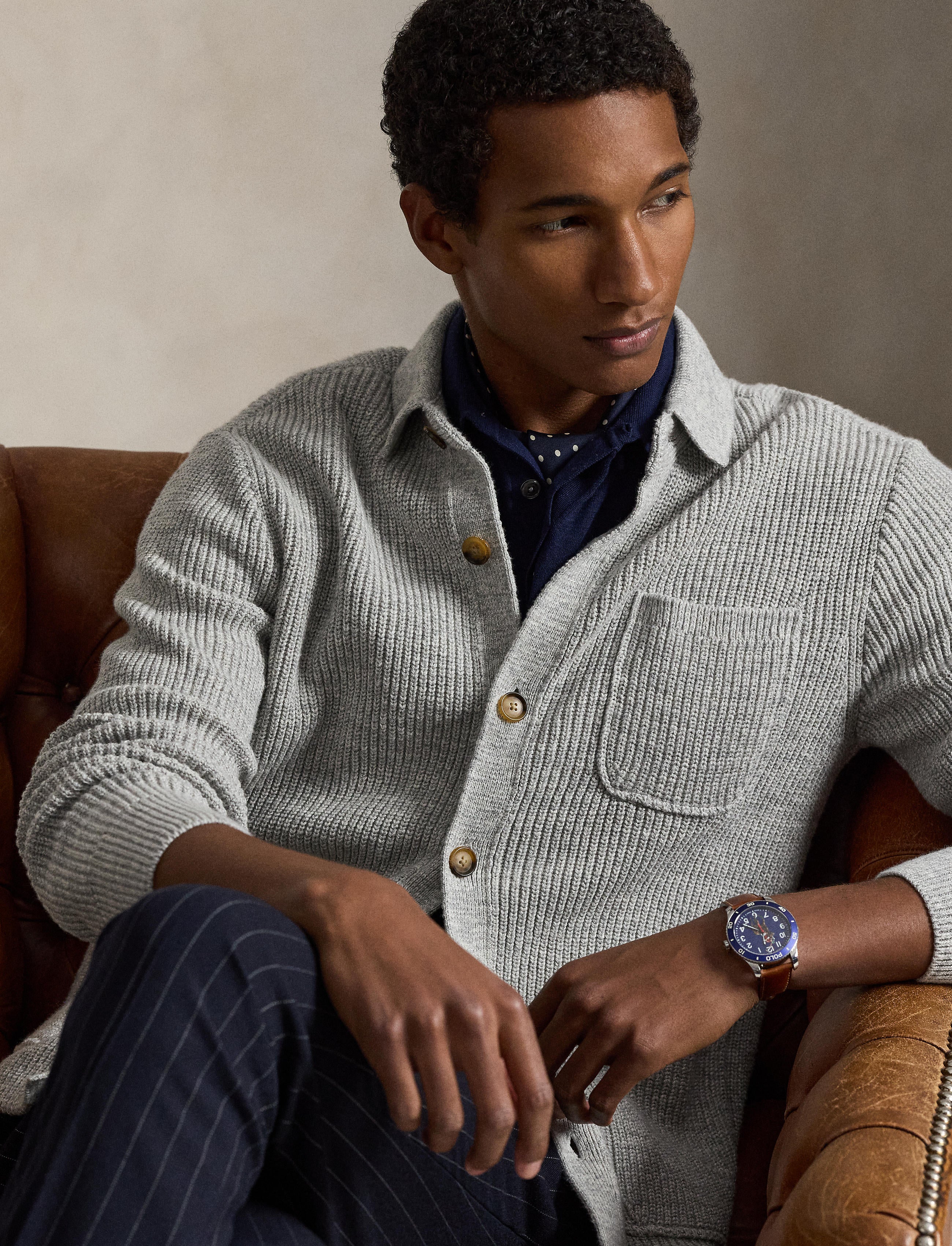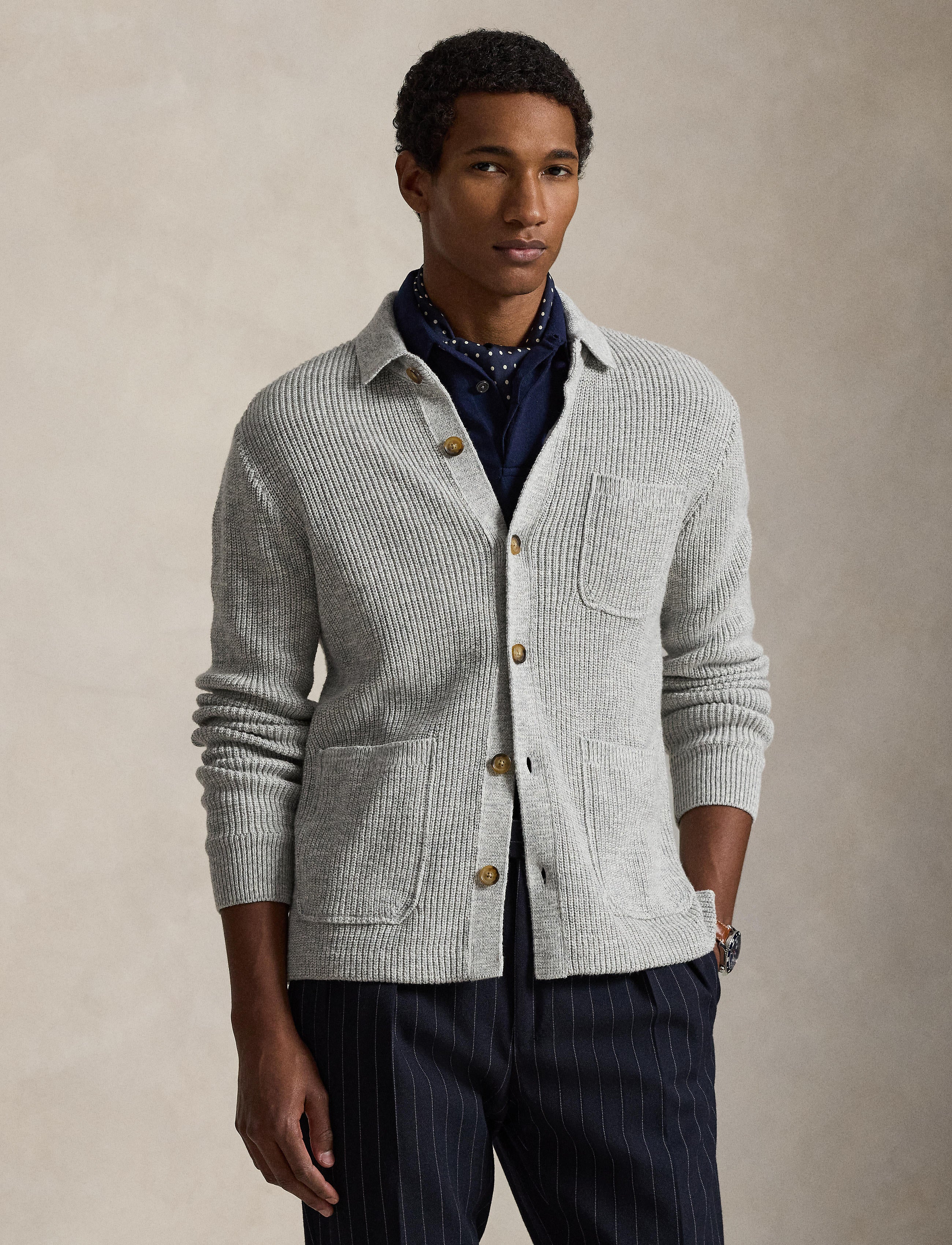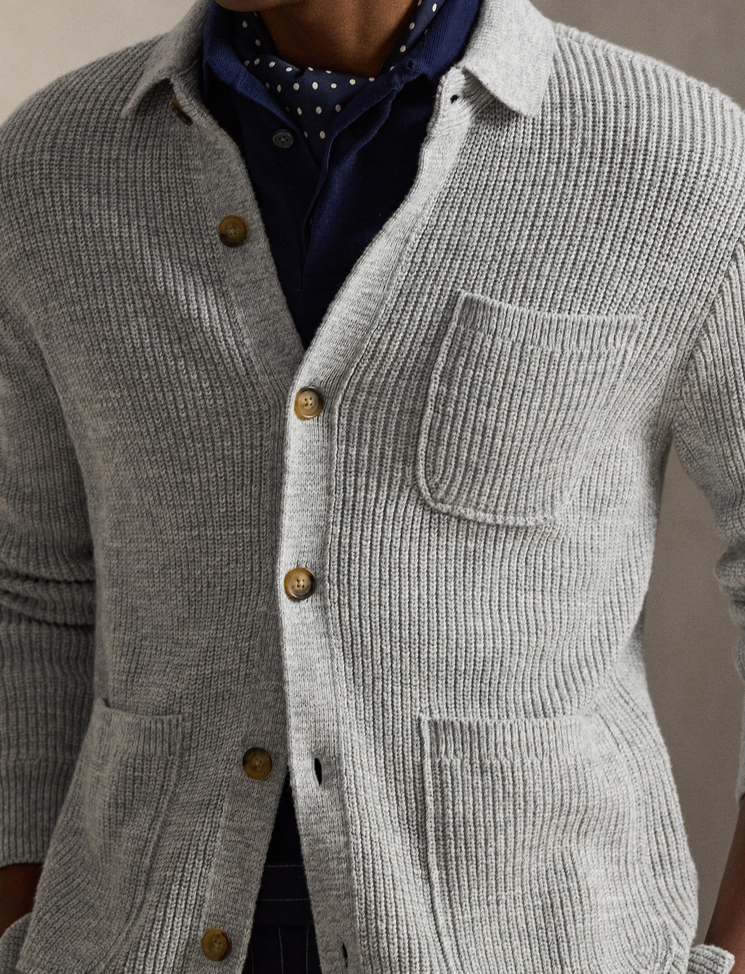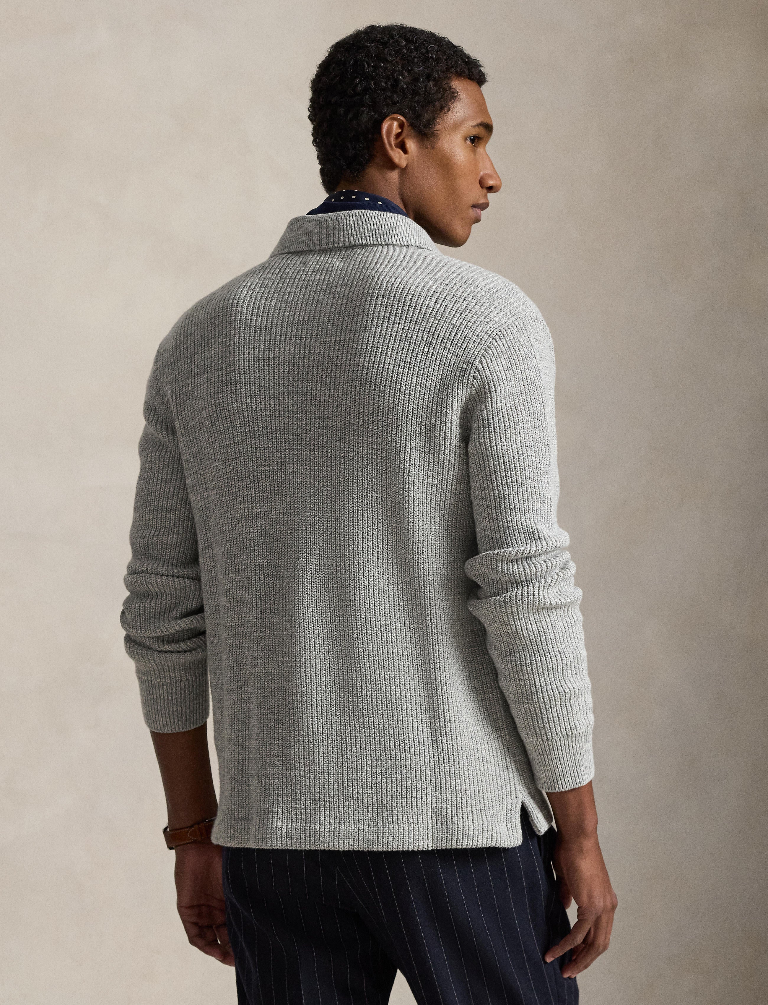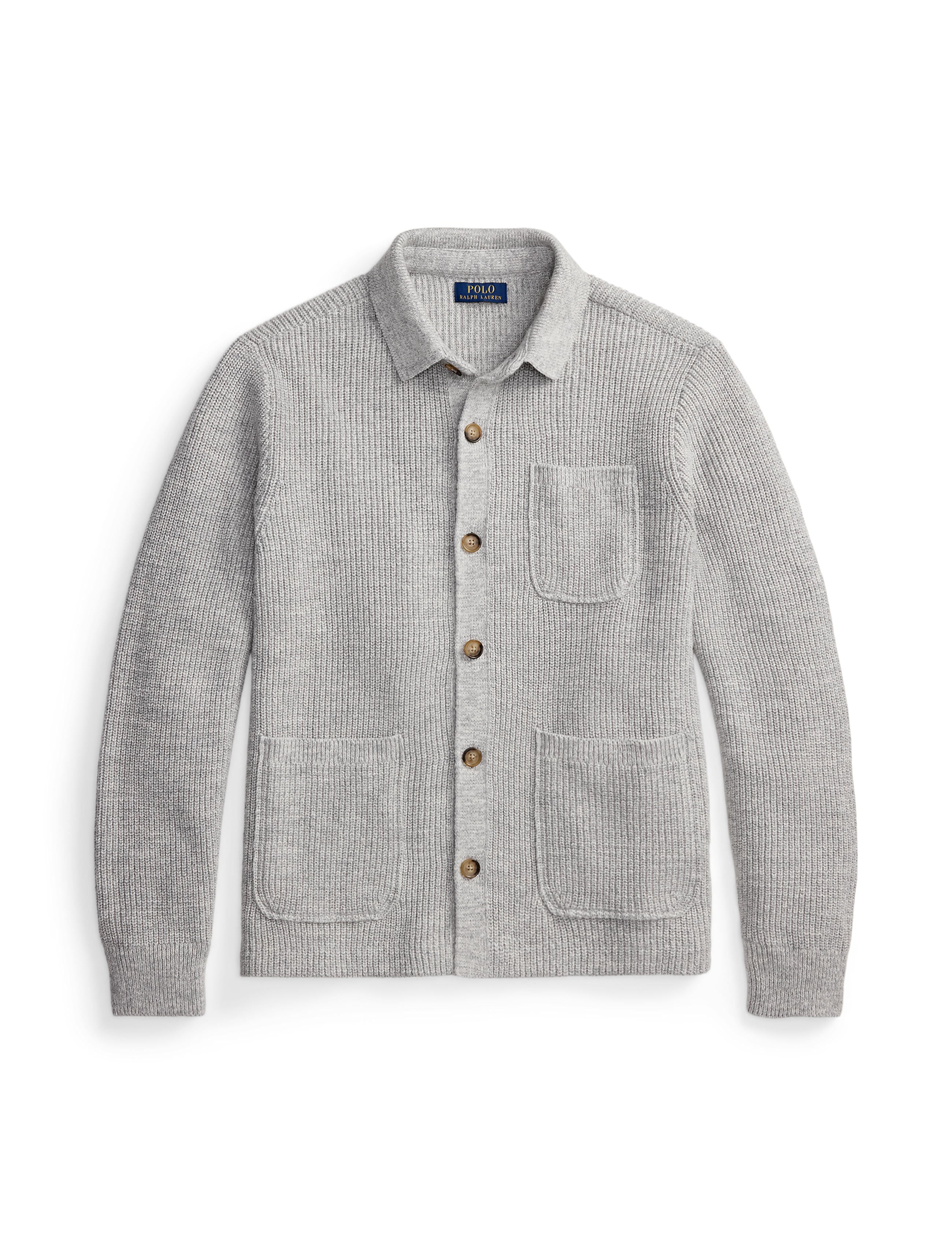 • Rib-knit Polo collar. Buttoned placket. Buttons custom-developed with an “RL Ralph Lauren” logo.