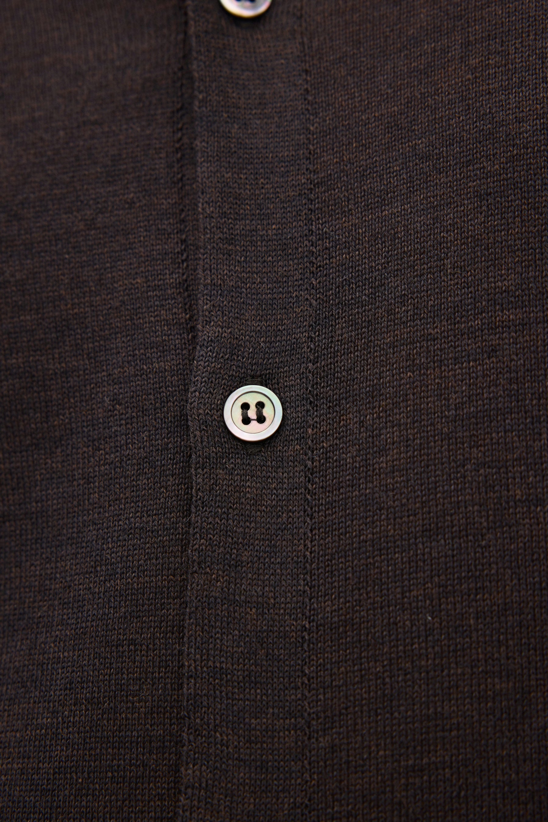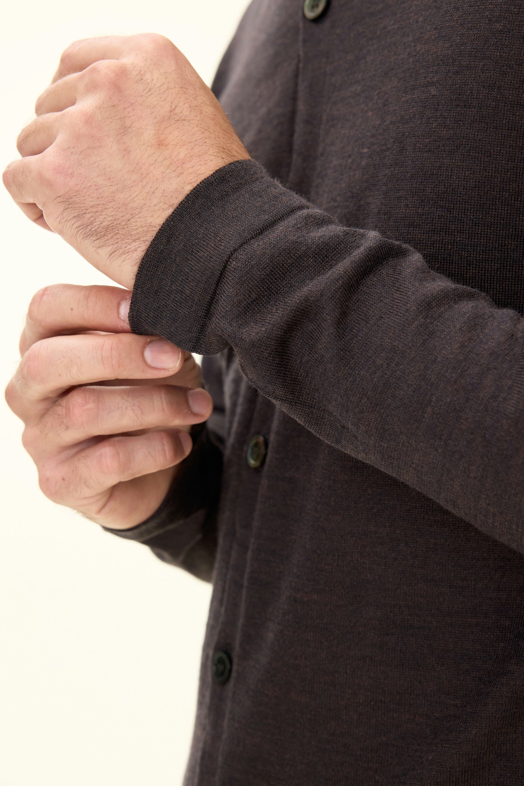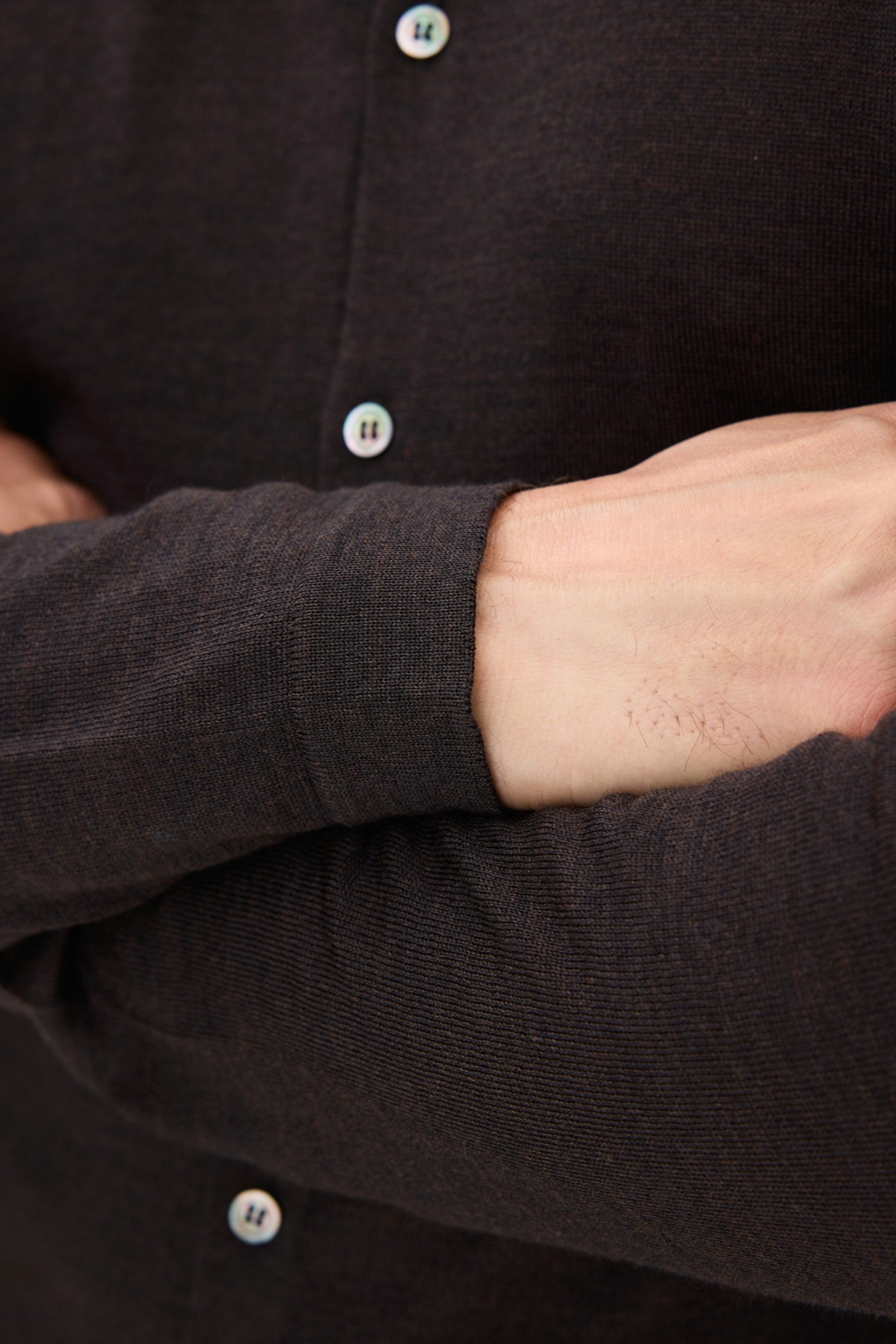 Cardigan in extra fine merino wool from Tollegno, Italy. Knitted in 14 gauge. The wool fibres are long, giving the garment a luxurious and slightly shiny surface. Sewn-on collar in a classic style that gives the garment an elegant look. Suitable for wearing over a T-shirt or under a jacket. Mother-of-pearl buttons.