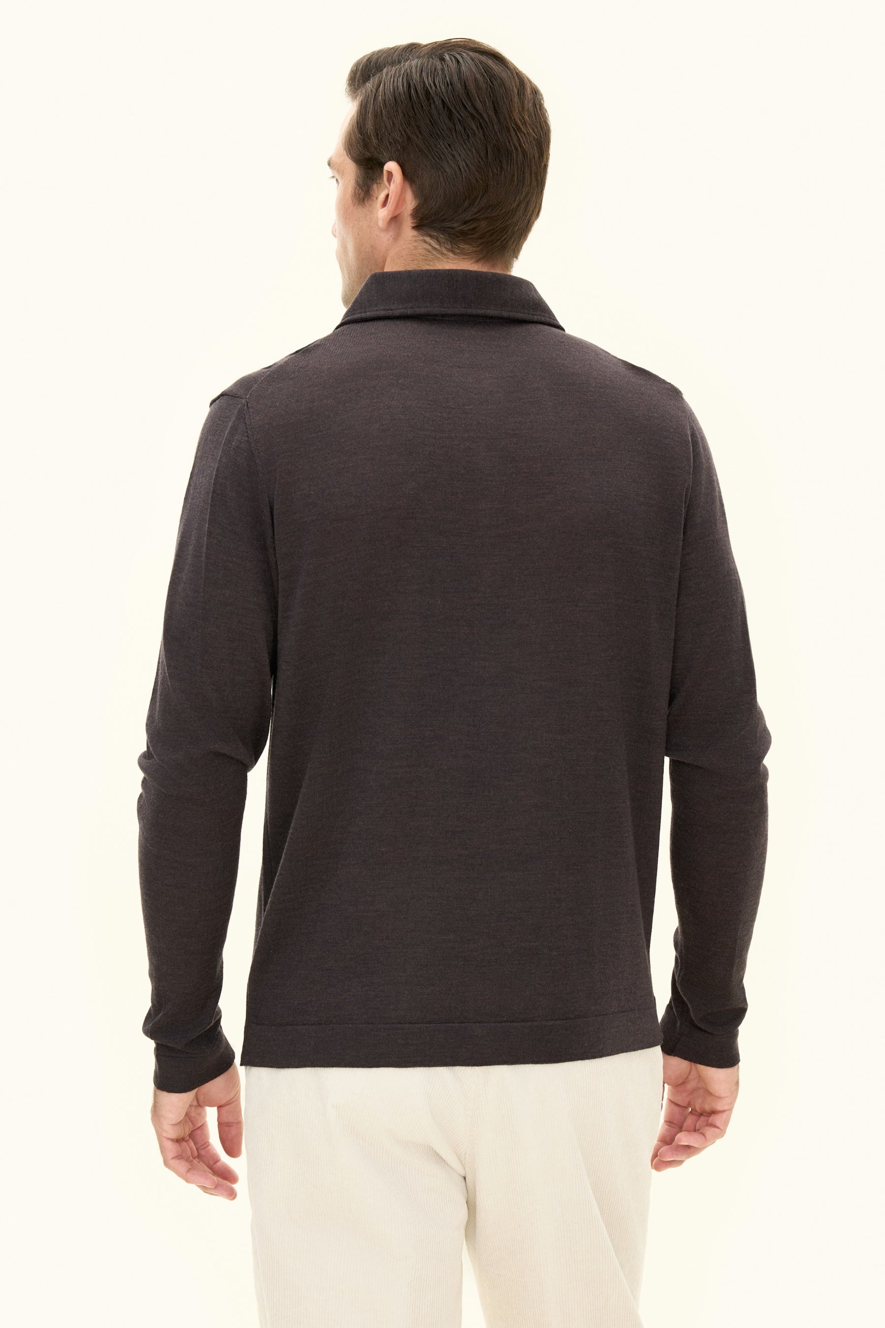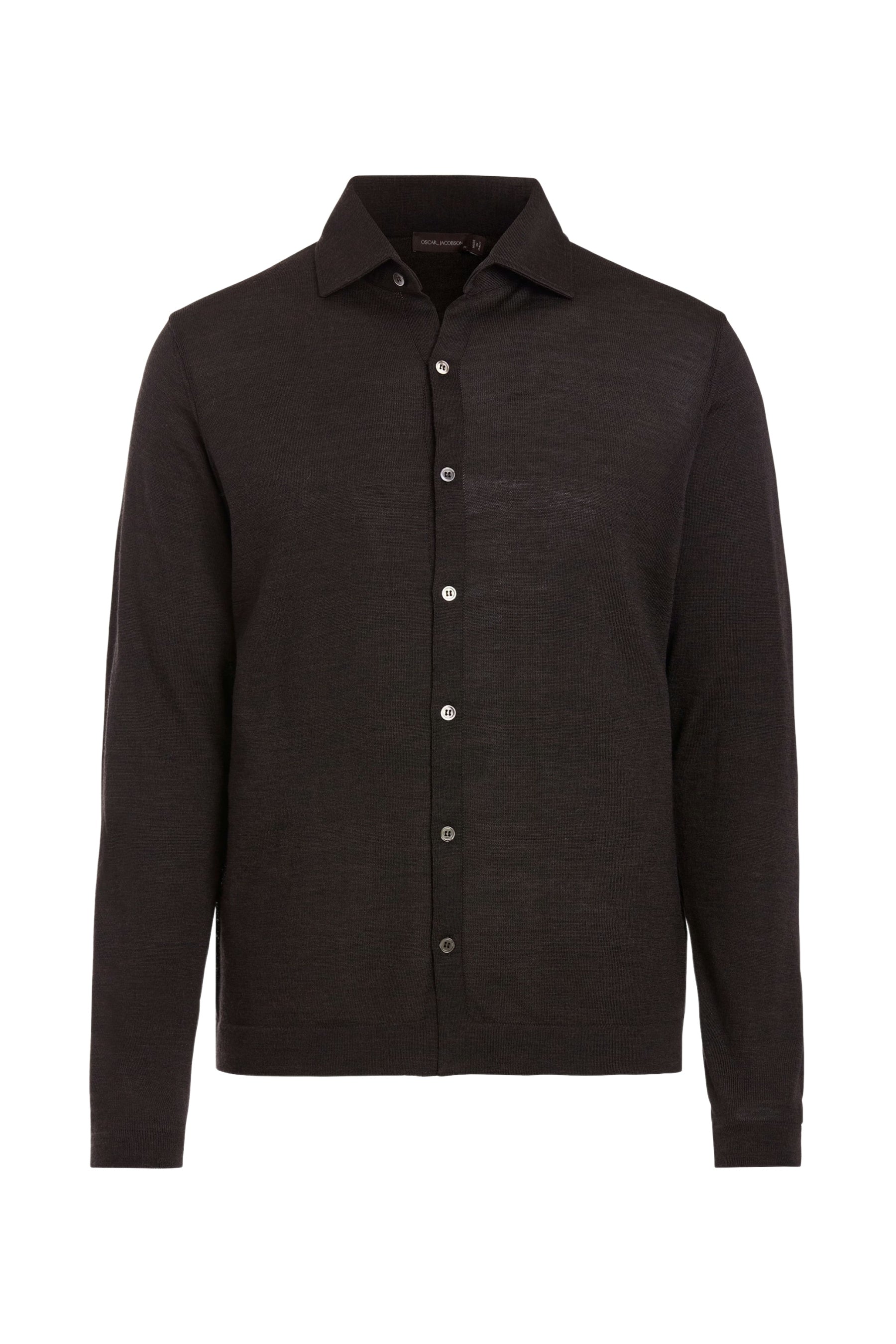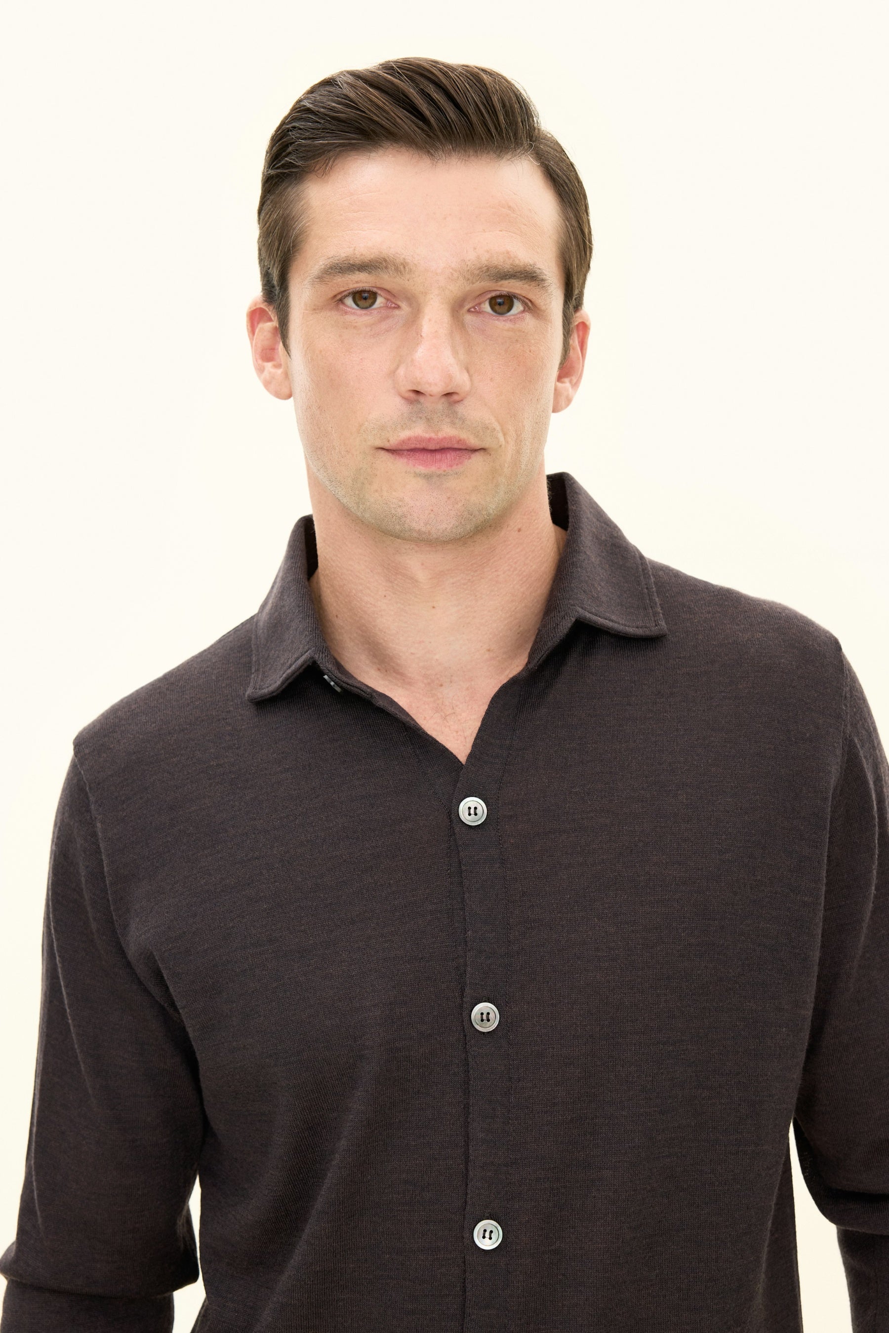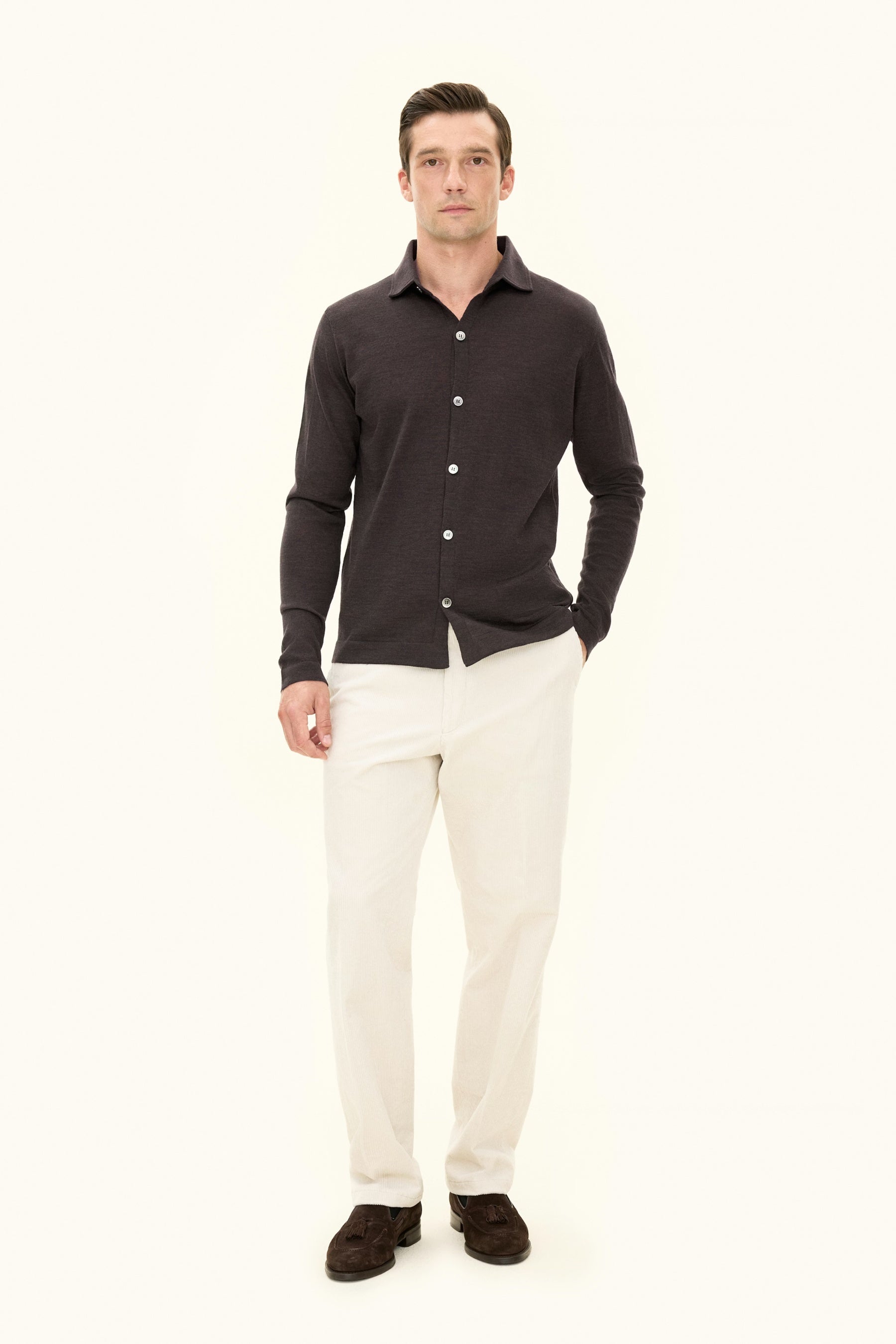 Cardigan in extra fine merino wool from Tollegno, Italy. Knitted in 14 gauge. The wool fibres are long, giving the garment a luxurious and slightly shiny surface. Sewn-on collar in a classic style that gives the garment an elegant look. Suitable for wearing over a T-shirt or under a jacket. Mother-of-pearl buttons.
