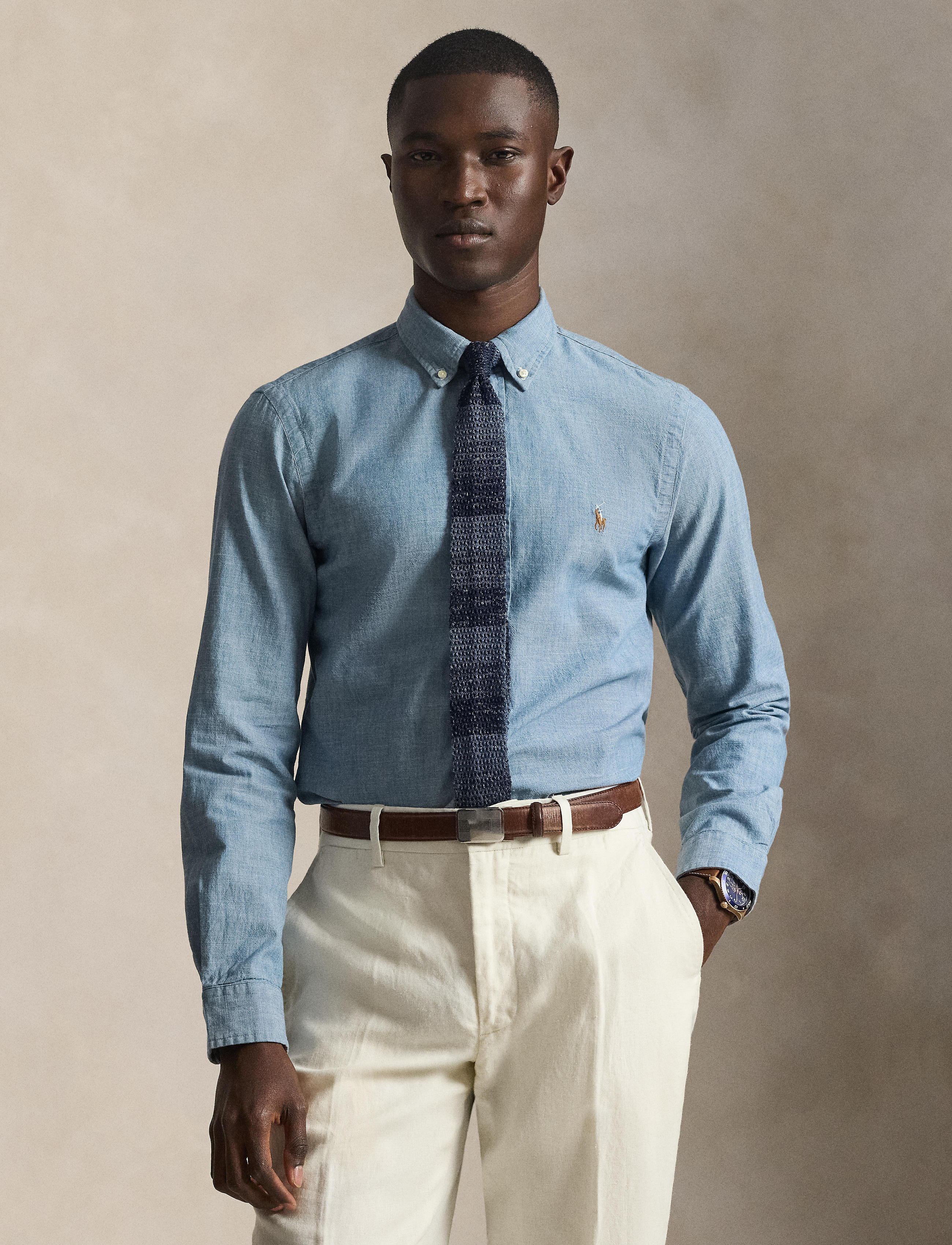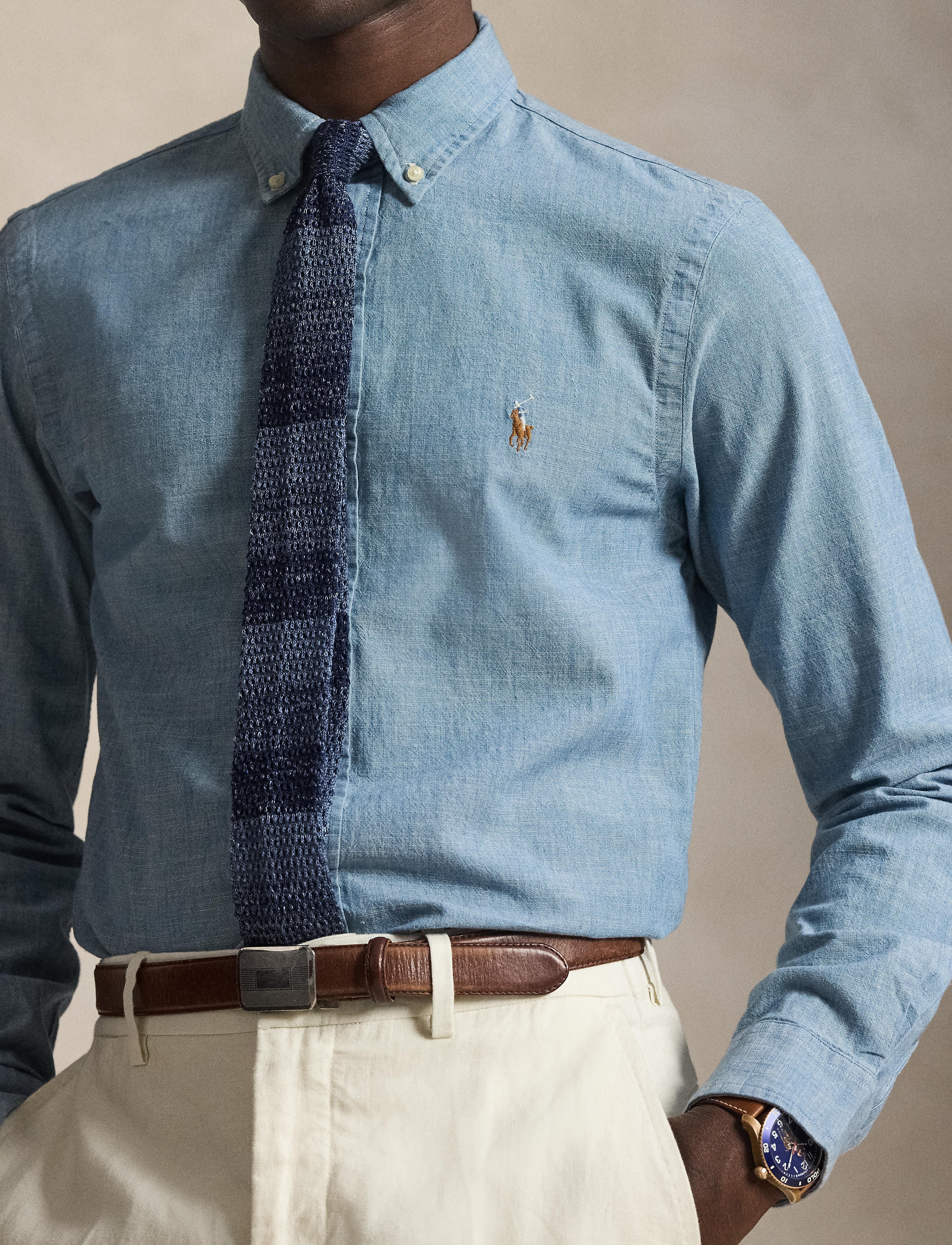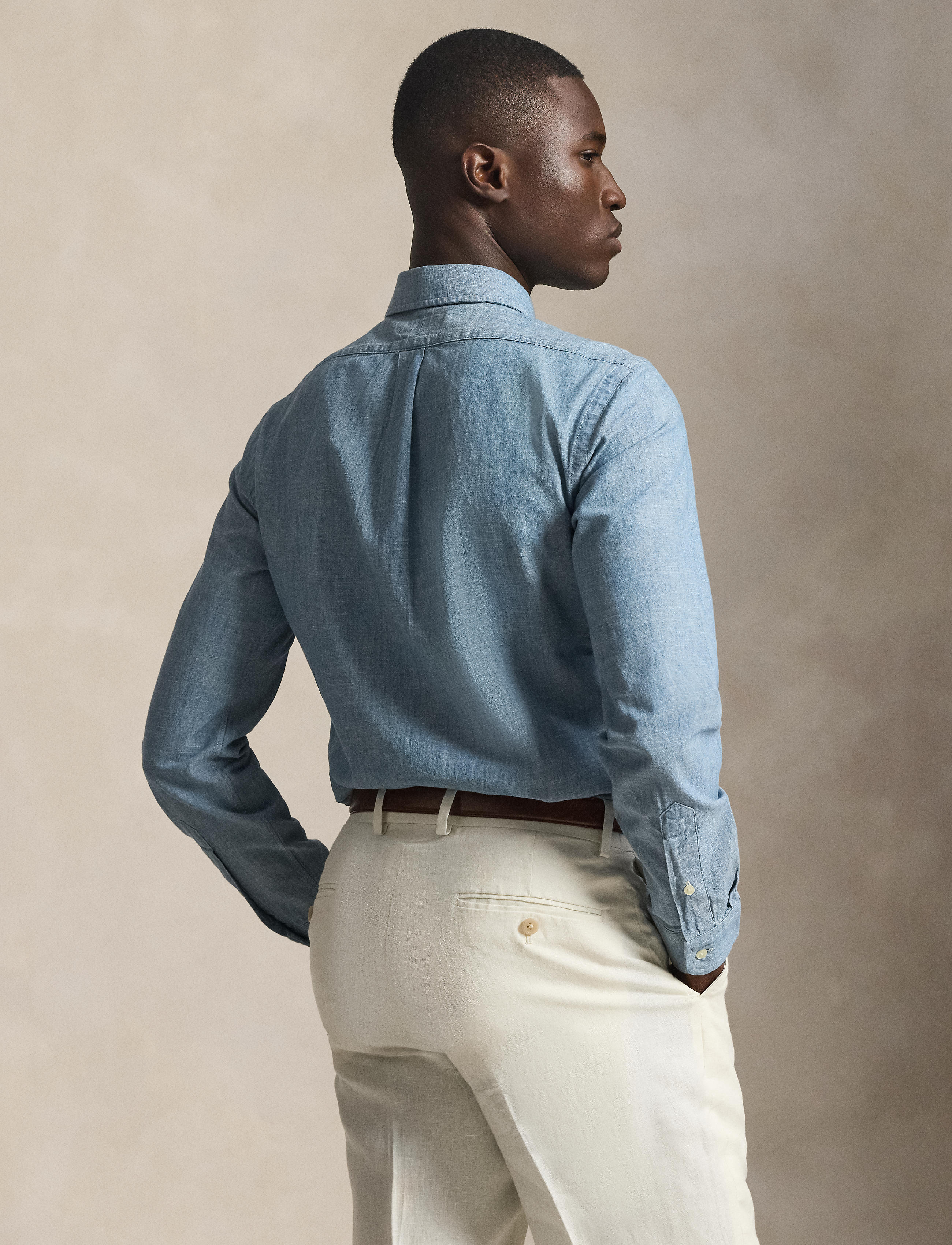 Our indigo-dyed cotton shirt is cut close to the body and stonewashed to give the lightweight fabric a weathered, lived-in look.