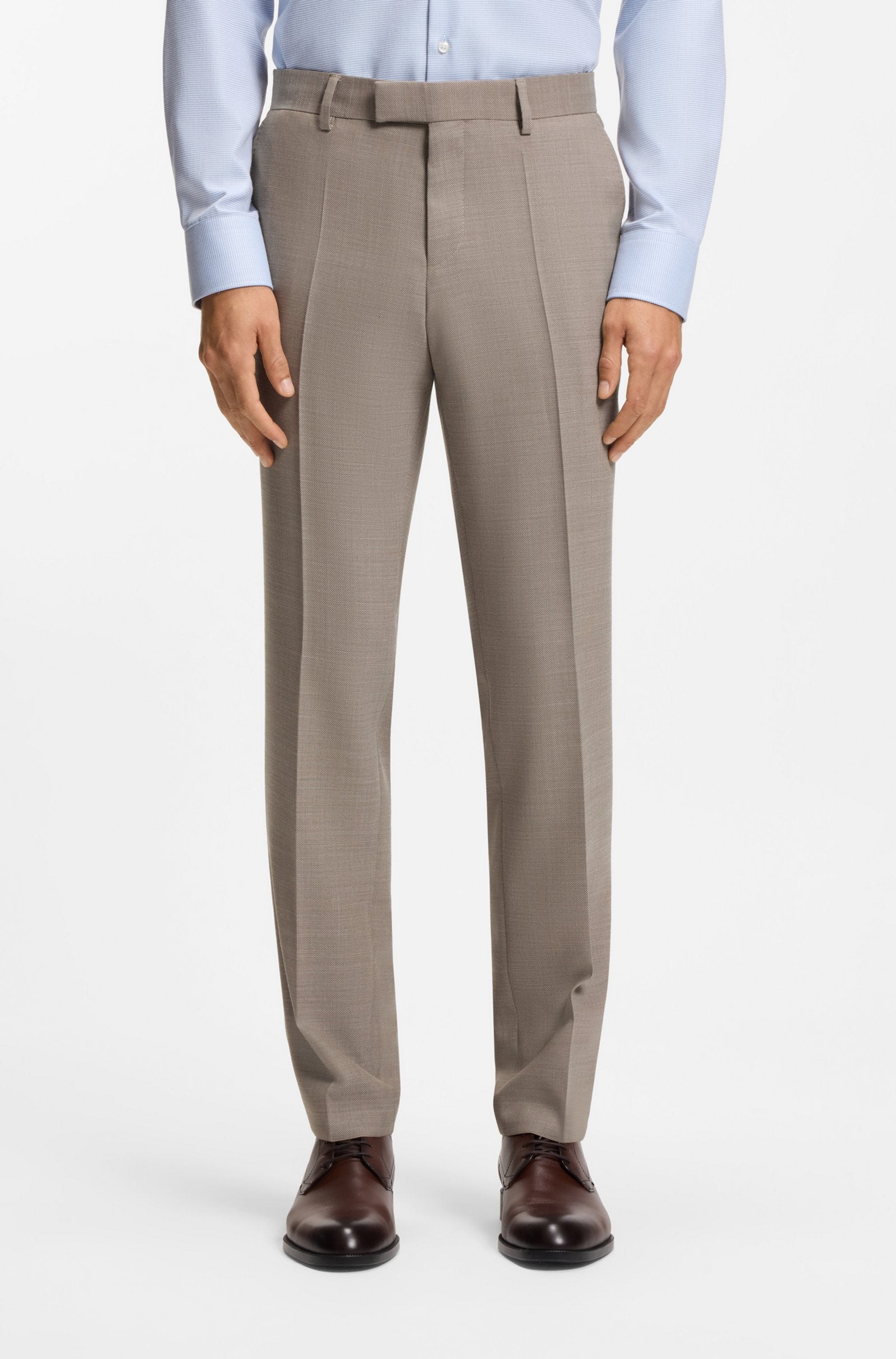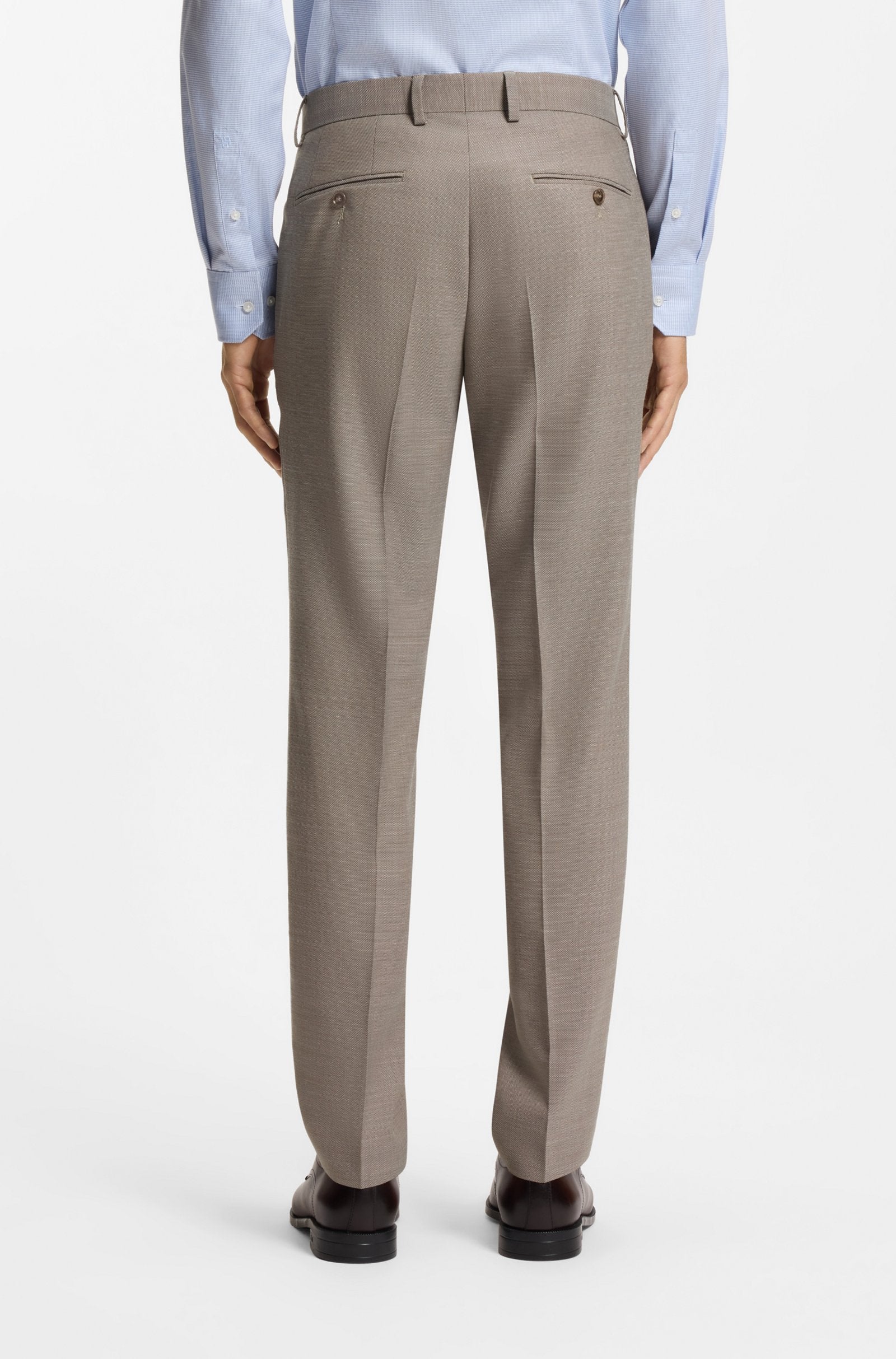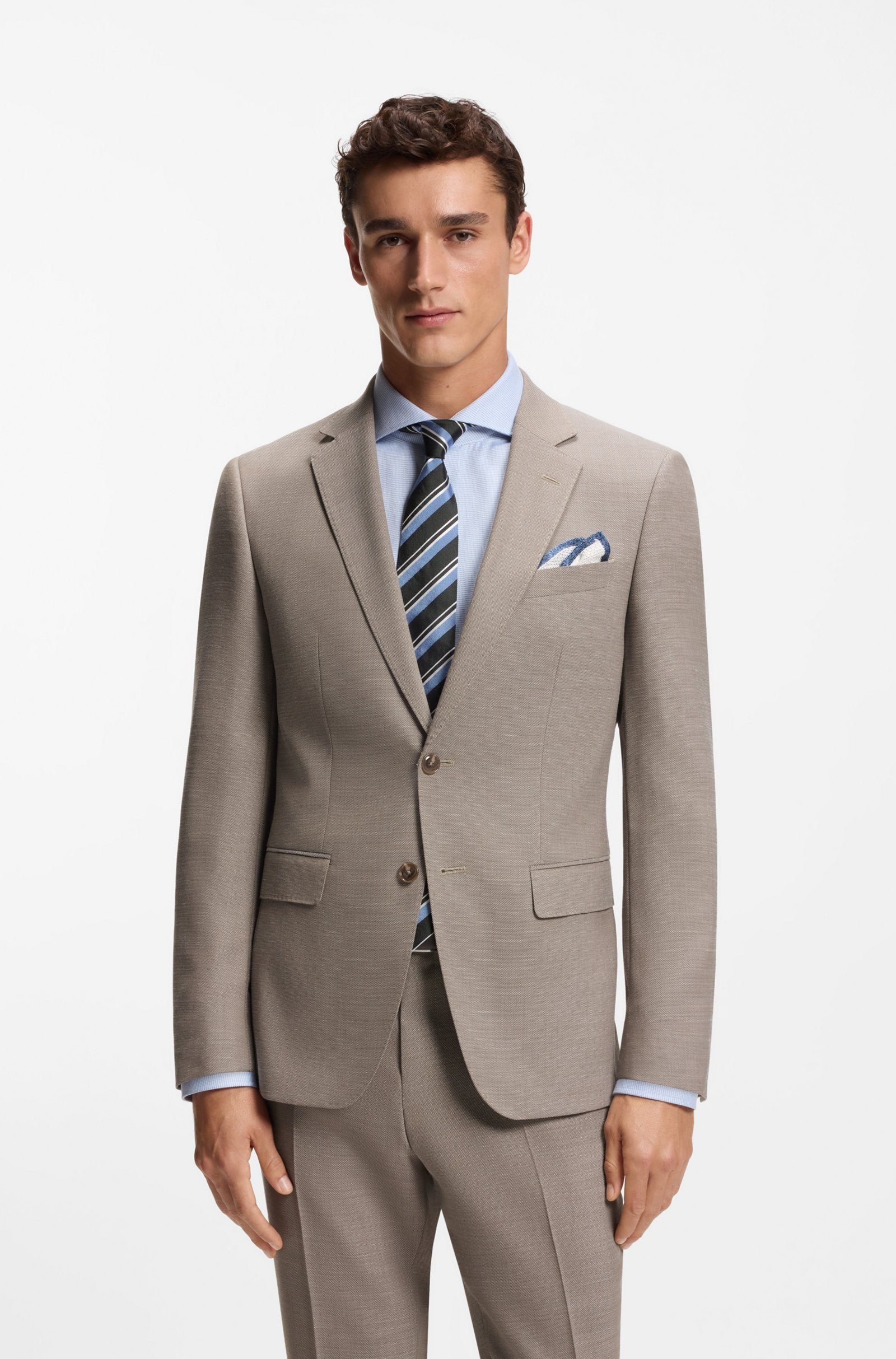 Give your formal rotation some fresh input with this two-piece BOSS Menswear suit. Tailored to a modern streamlined fit, this suit is crafted in performance-stretch cloth with virgin wool for easy movement with a rich look. Constructed shoulders and notch lapels underline the contemporary cut.
