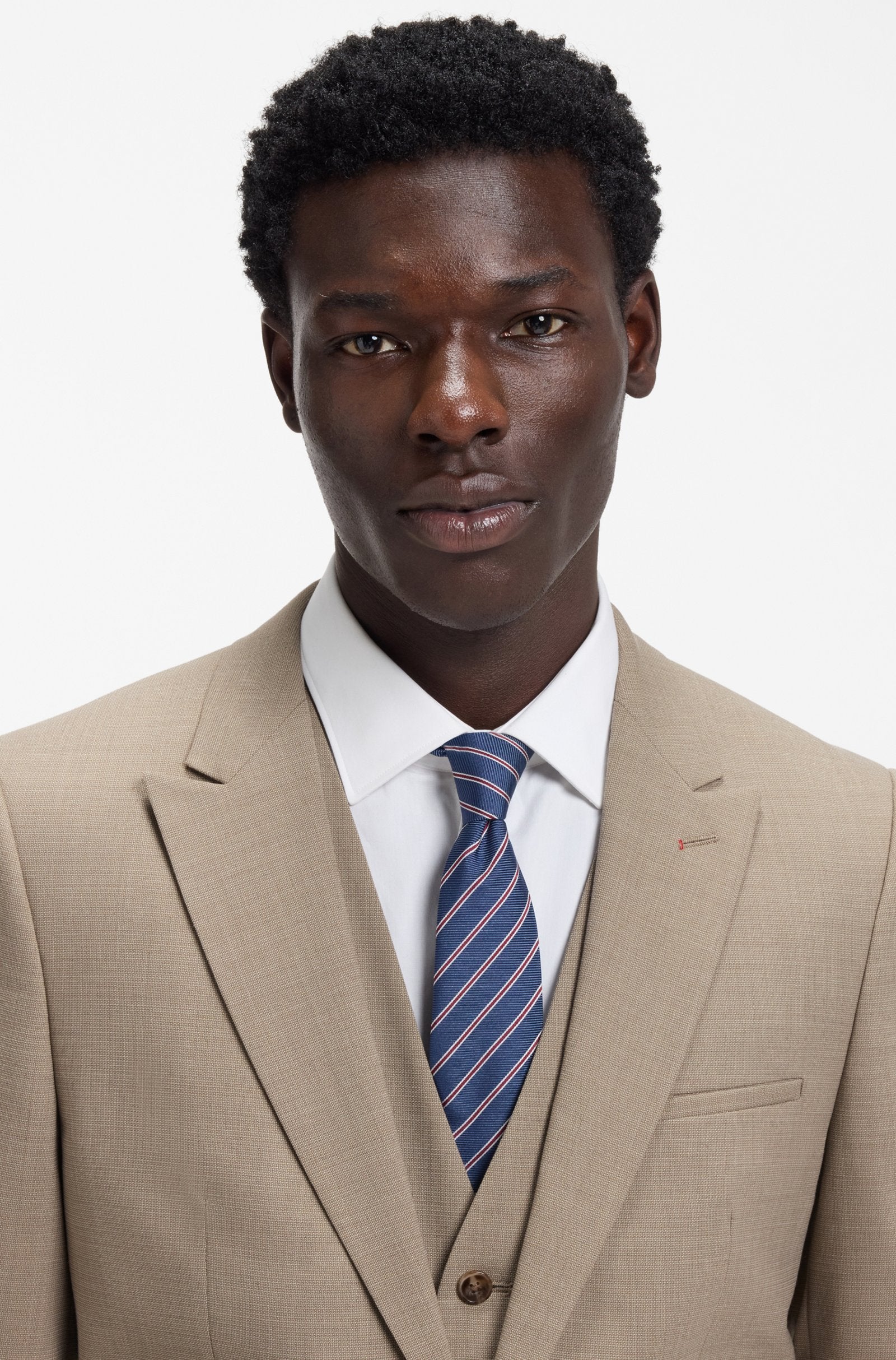 Be ready for any formal event with the extra-slim cut of this three-piece HUGO Menswear suit. Stretch dobby with rich virgin wool.