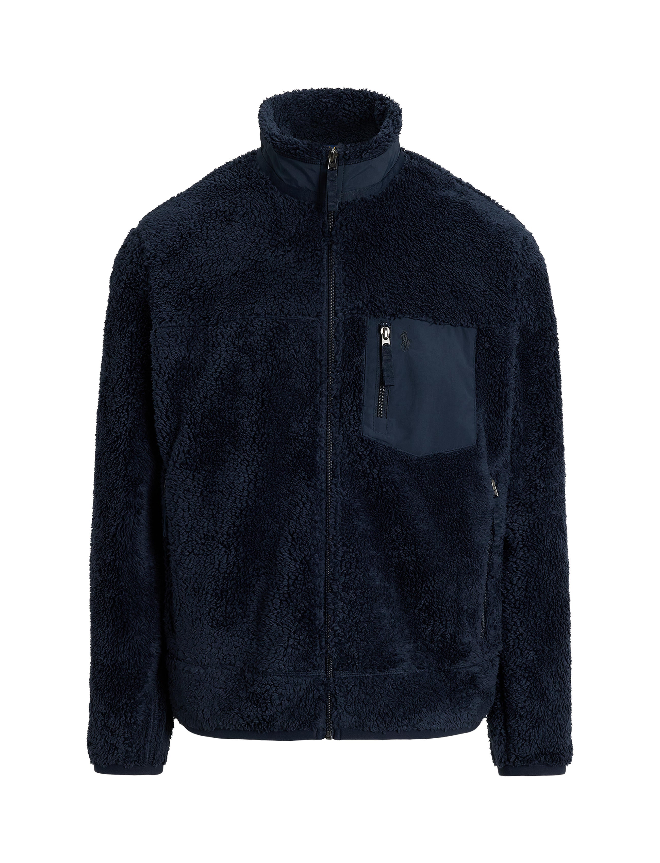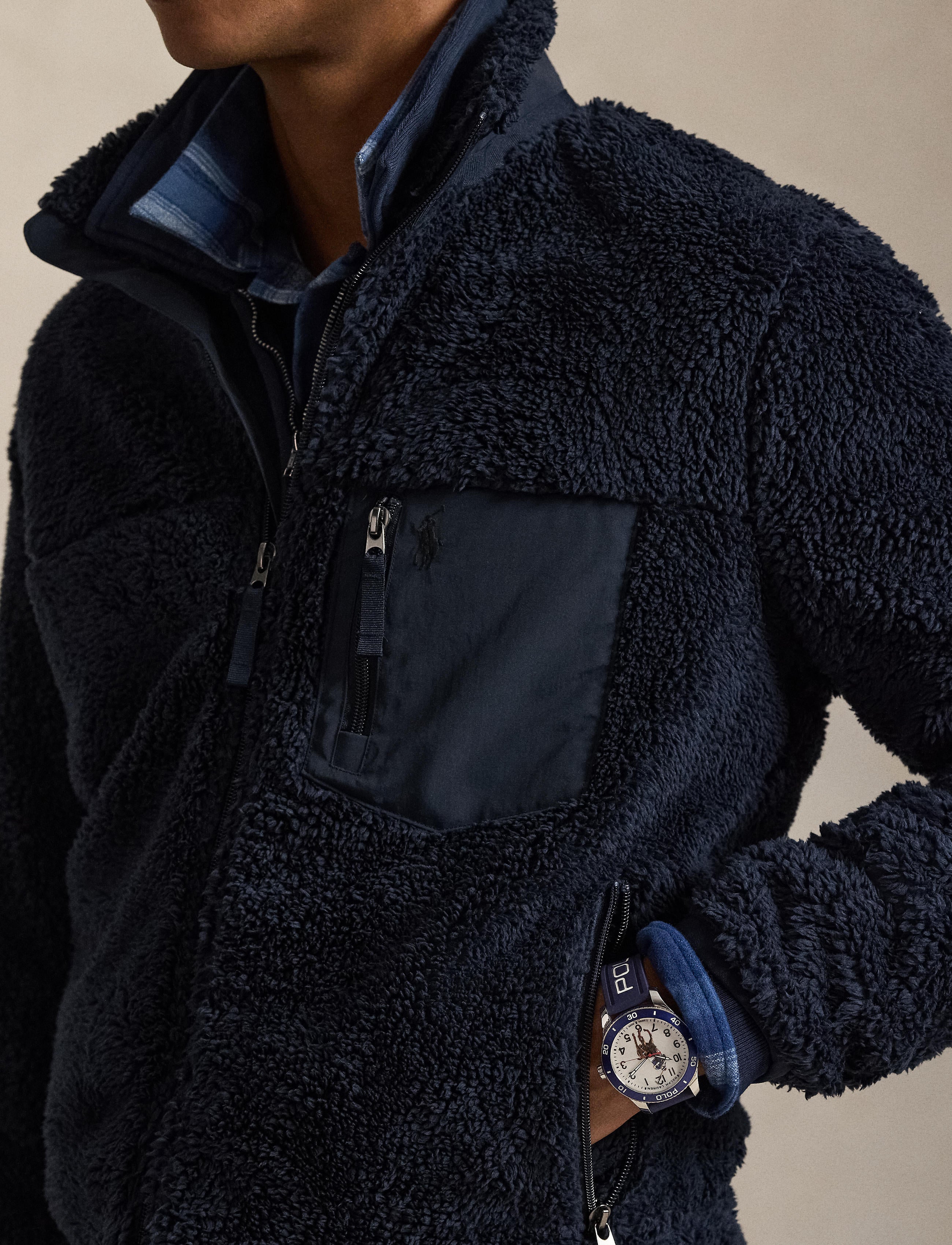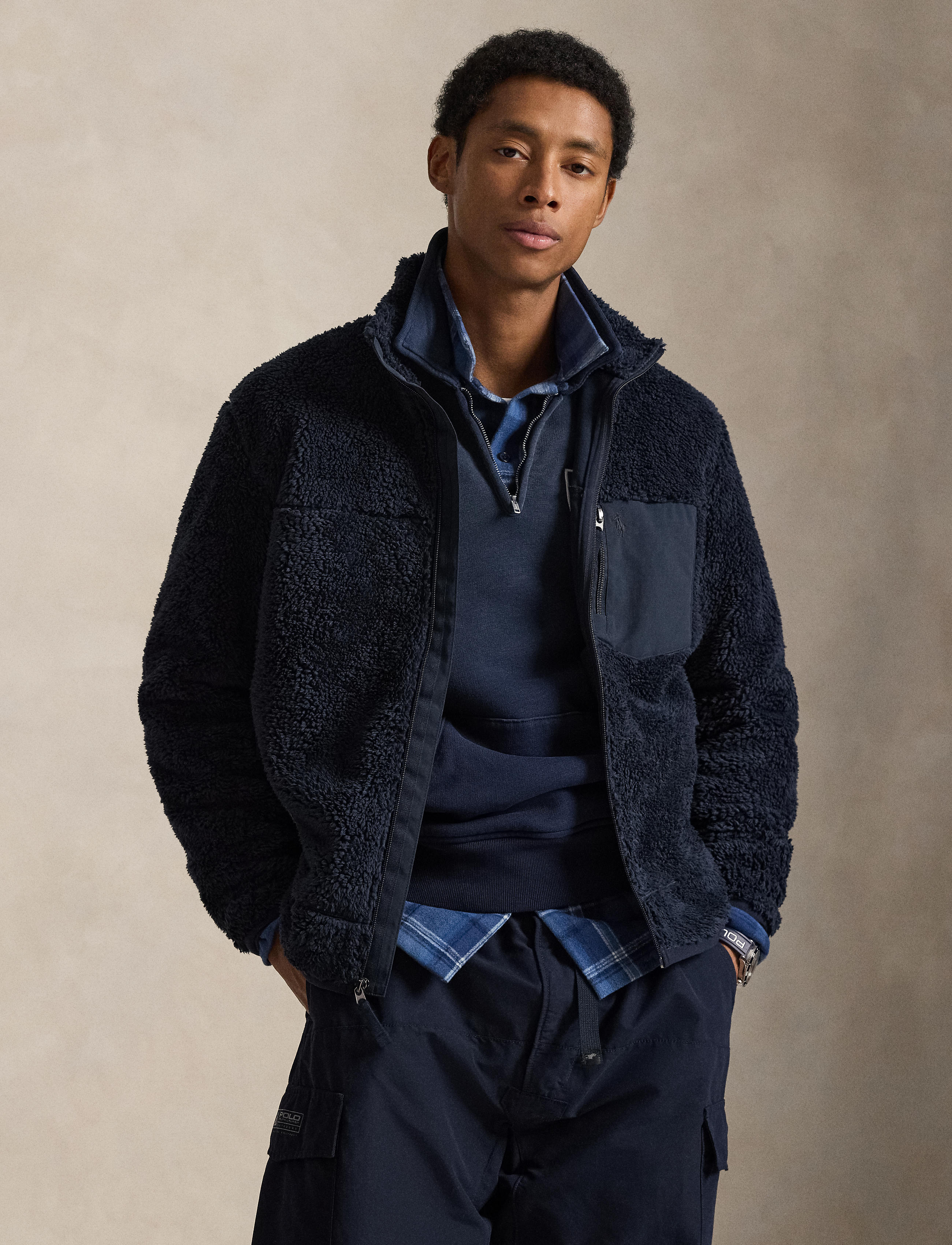This jacket is crafted from high-pile fleece that is bonded to a textured mesh fabric at the interior. Durable woven piecing adds a rugged, outdoorswear-inspired look.