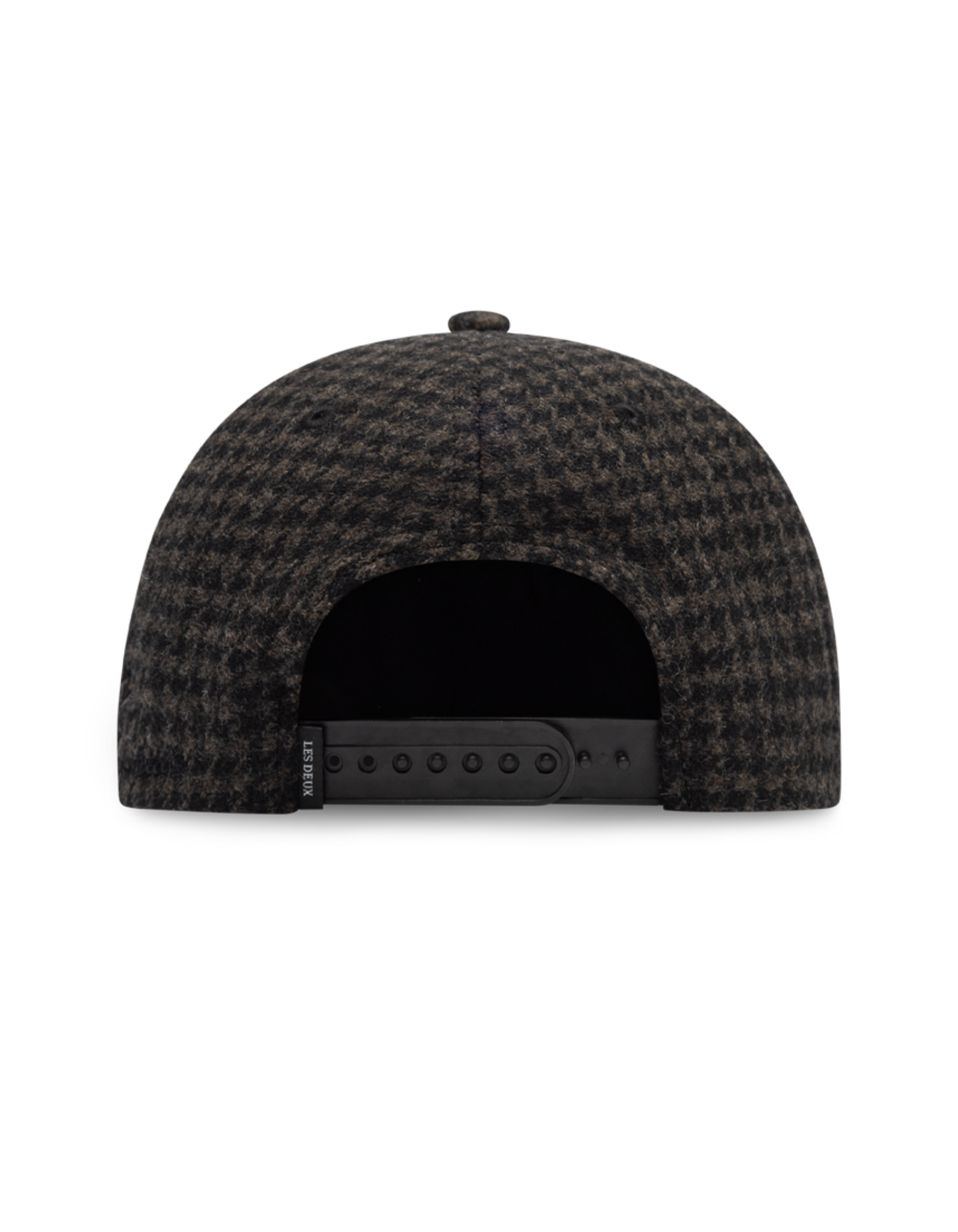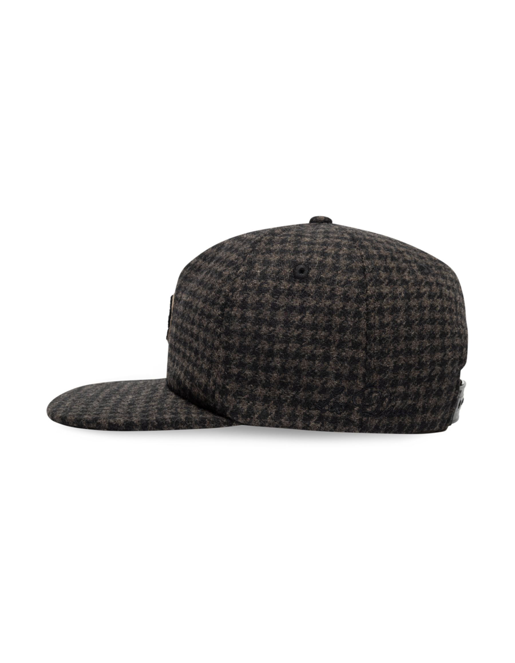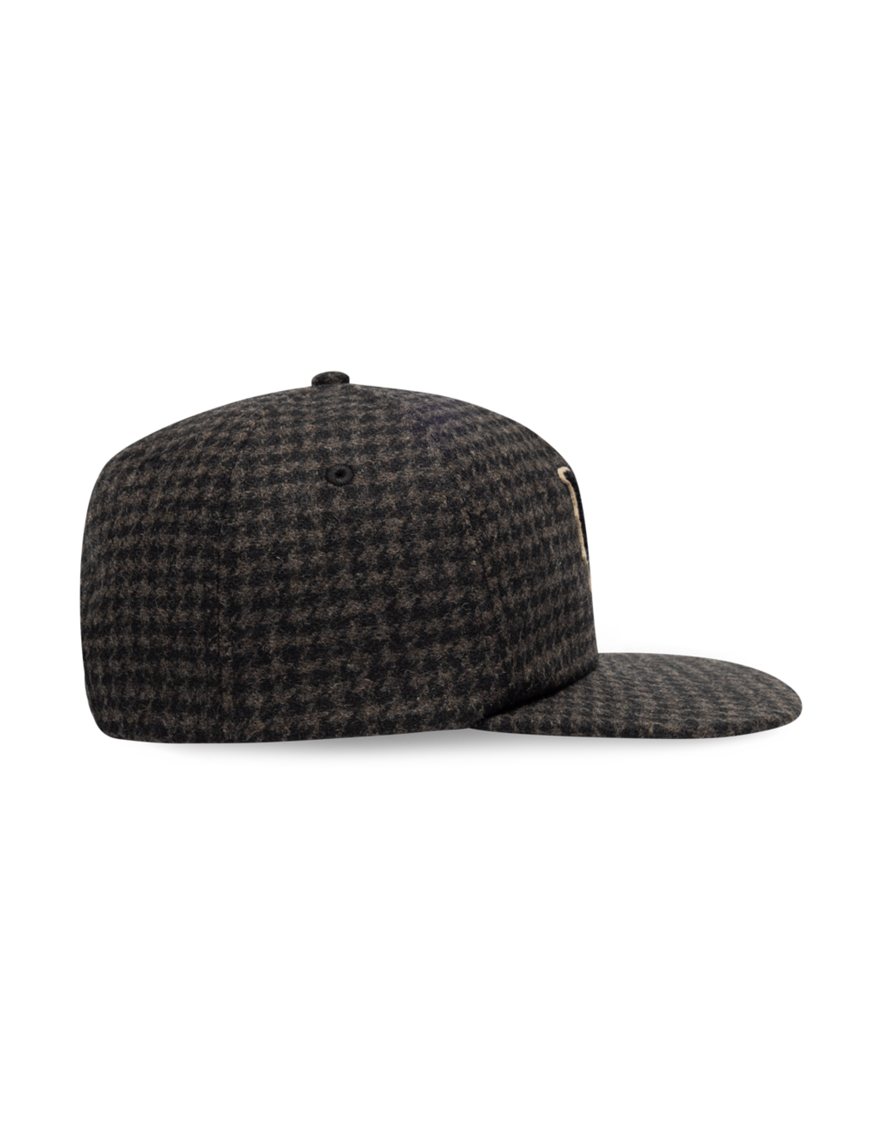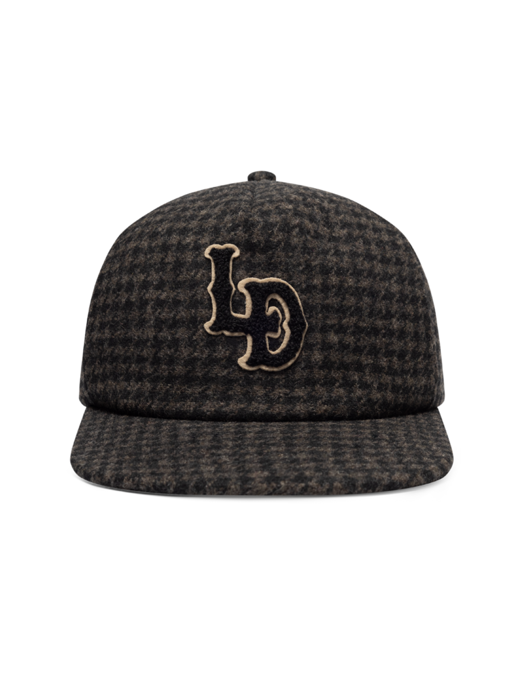 A vintage-inspired cap crafted from a wool blend in a classic houndstooth pattern. Finished with moss-stitched LD embroidery at the front and logo lettering at the side.