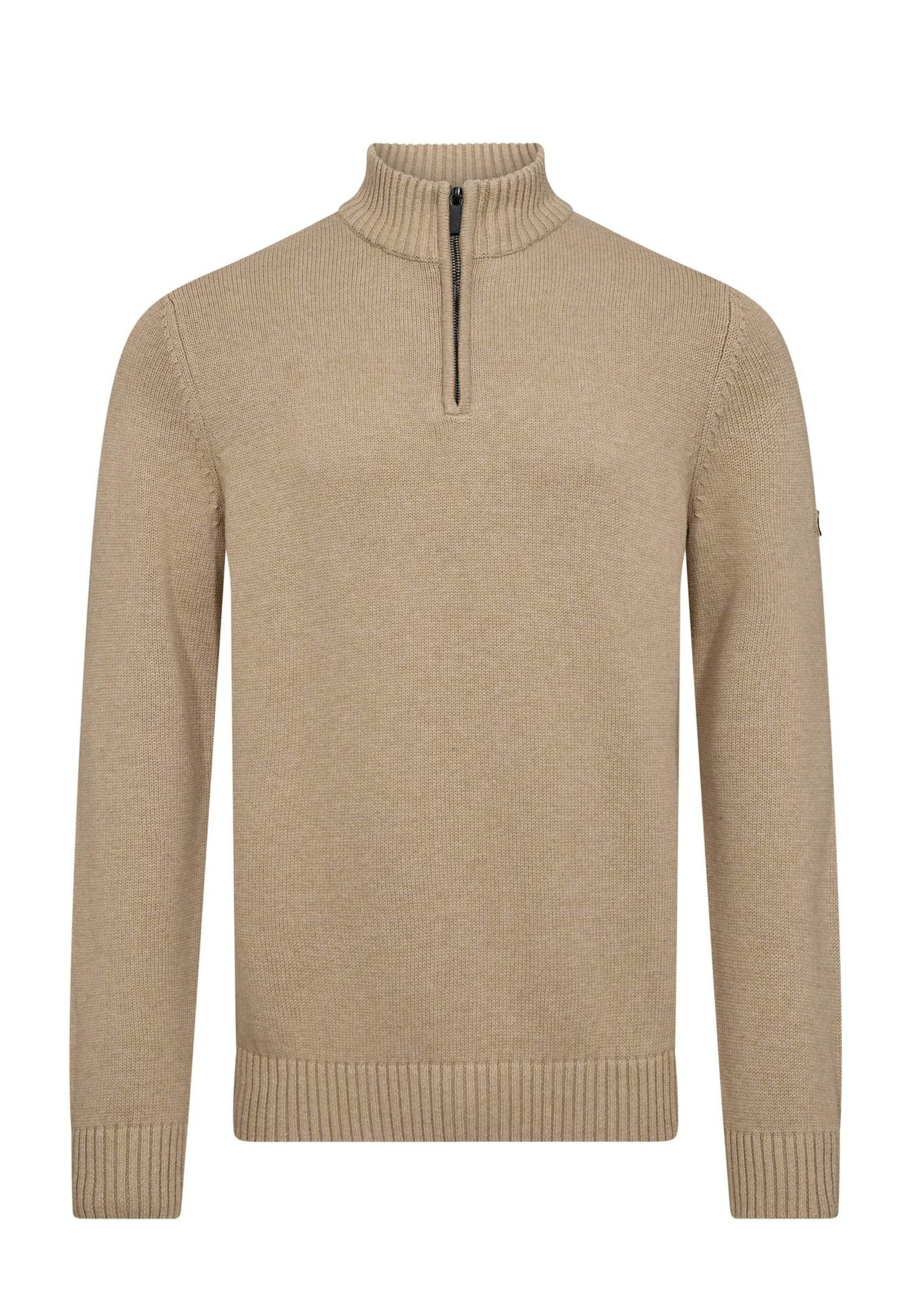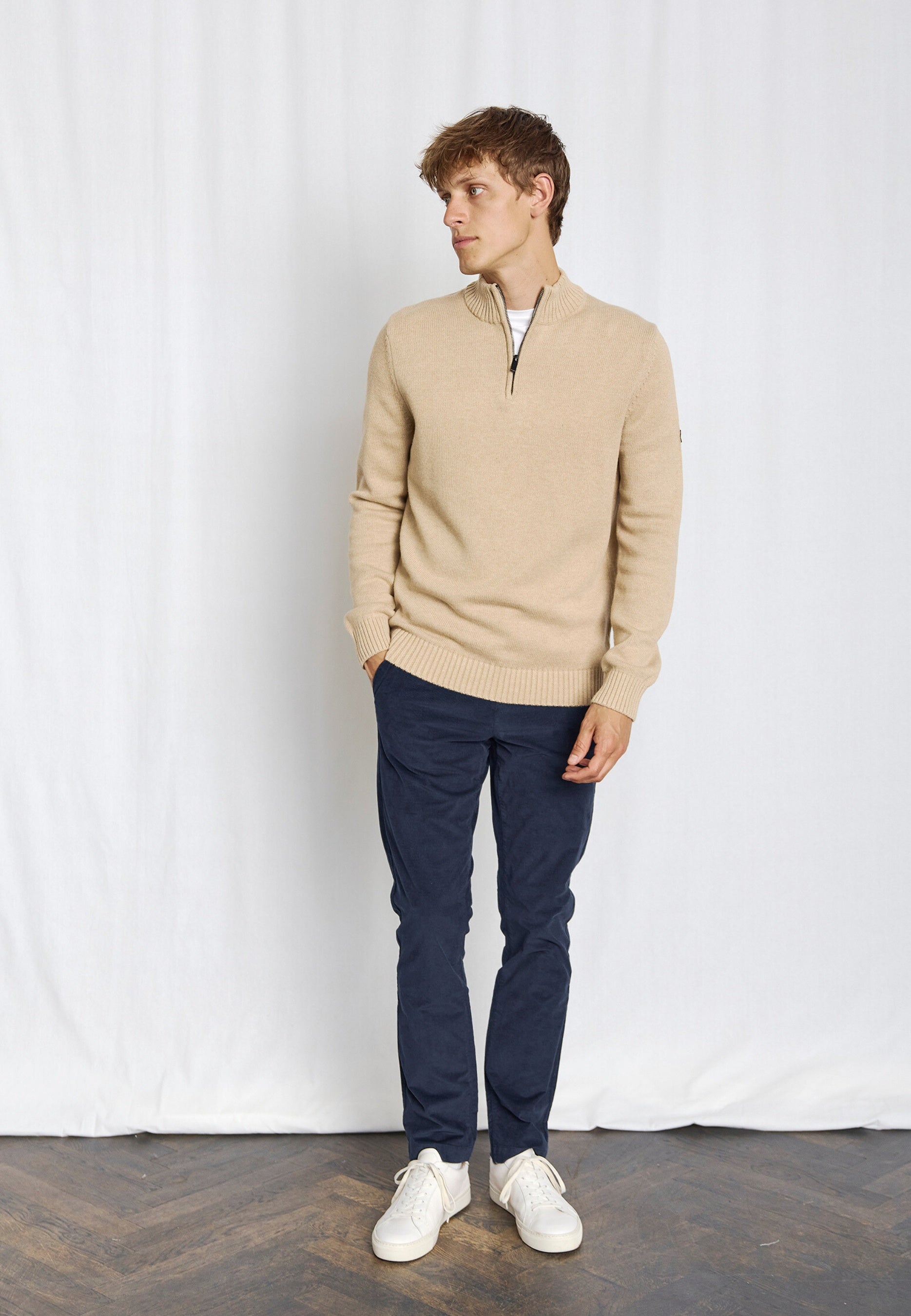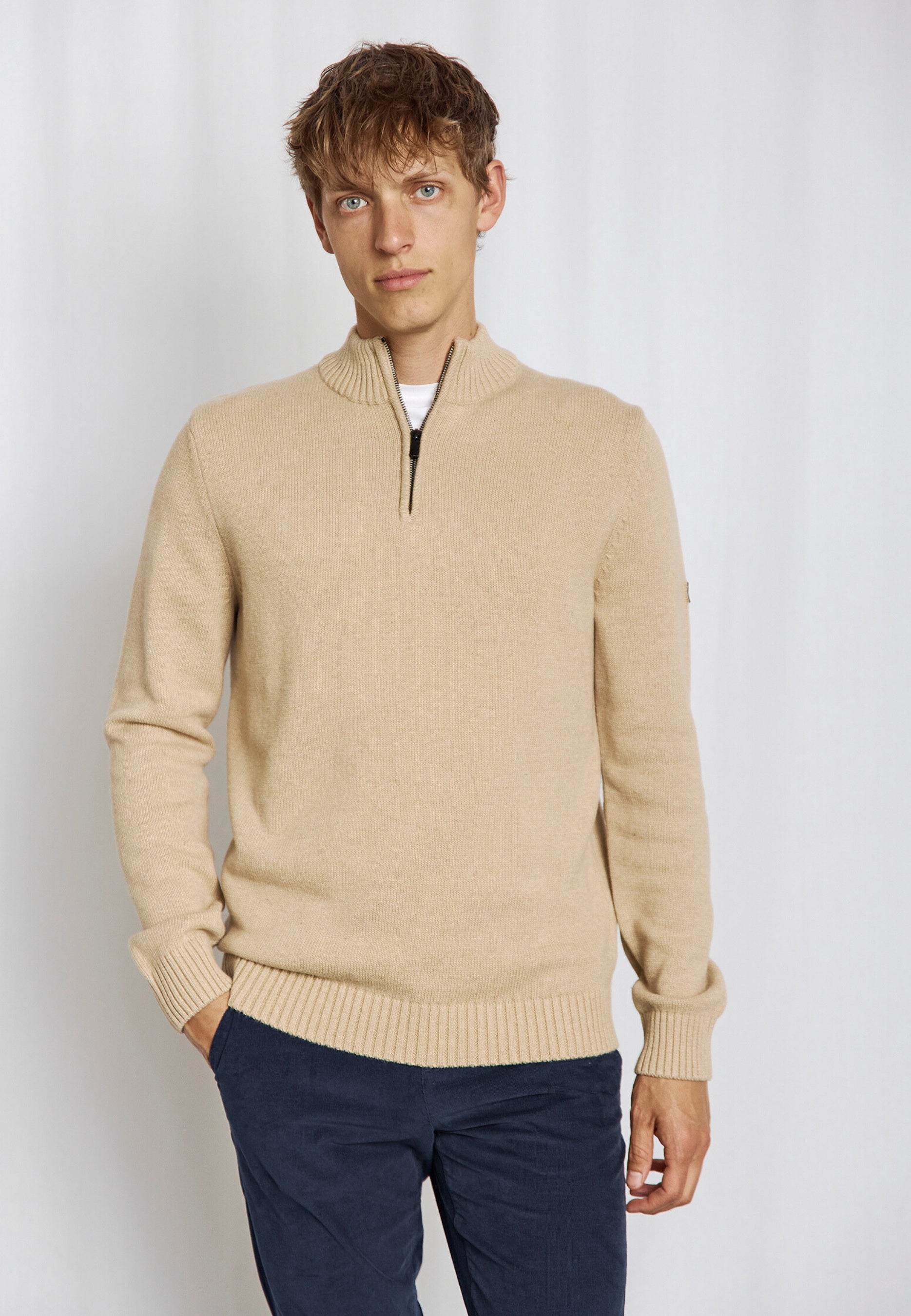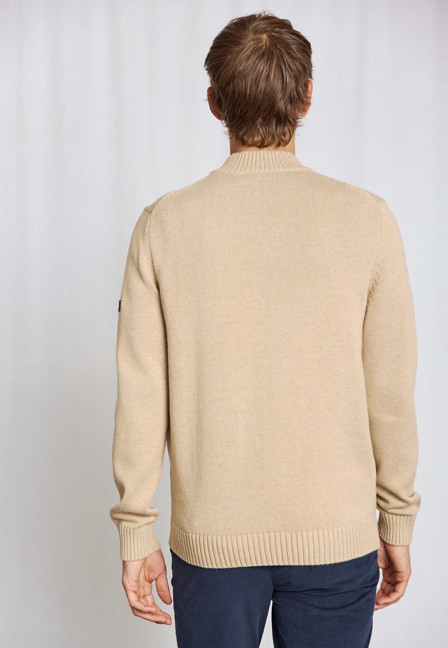 Heavy-knit half-zip sweater for men in 100% cotton. Designed with a high collar and discreet rubber logo on the sleeve – a versatile addition to your wardrobe, perfect for both everyday and leisure.