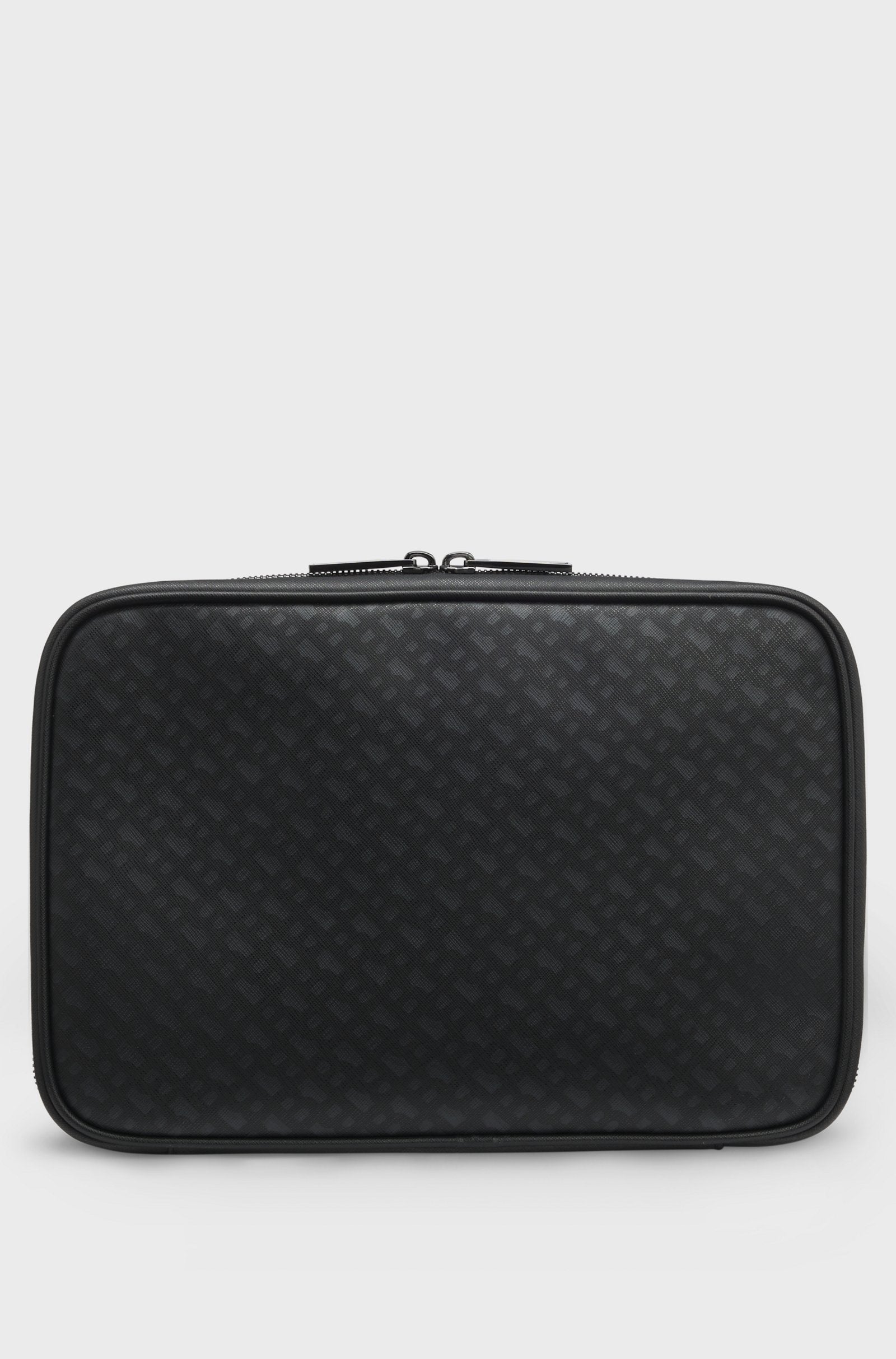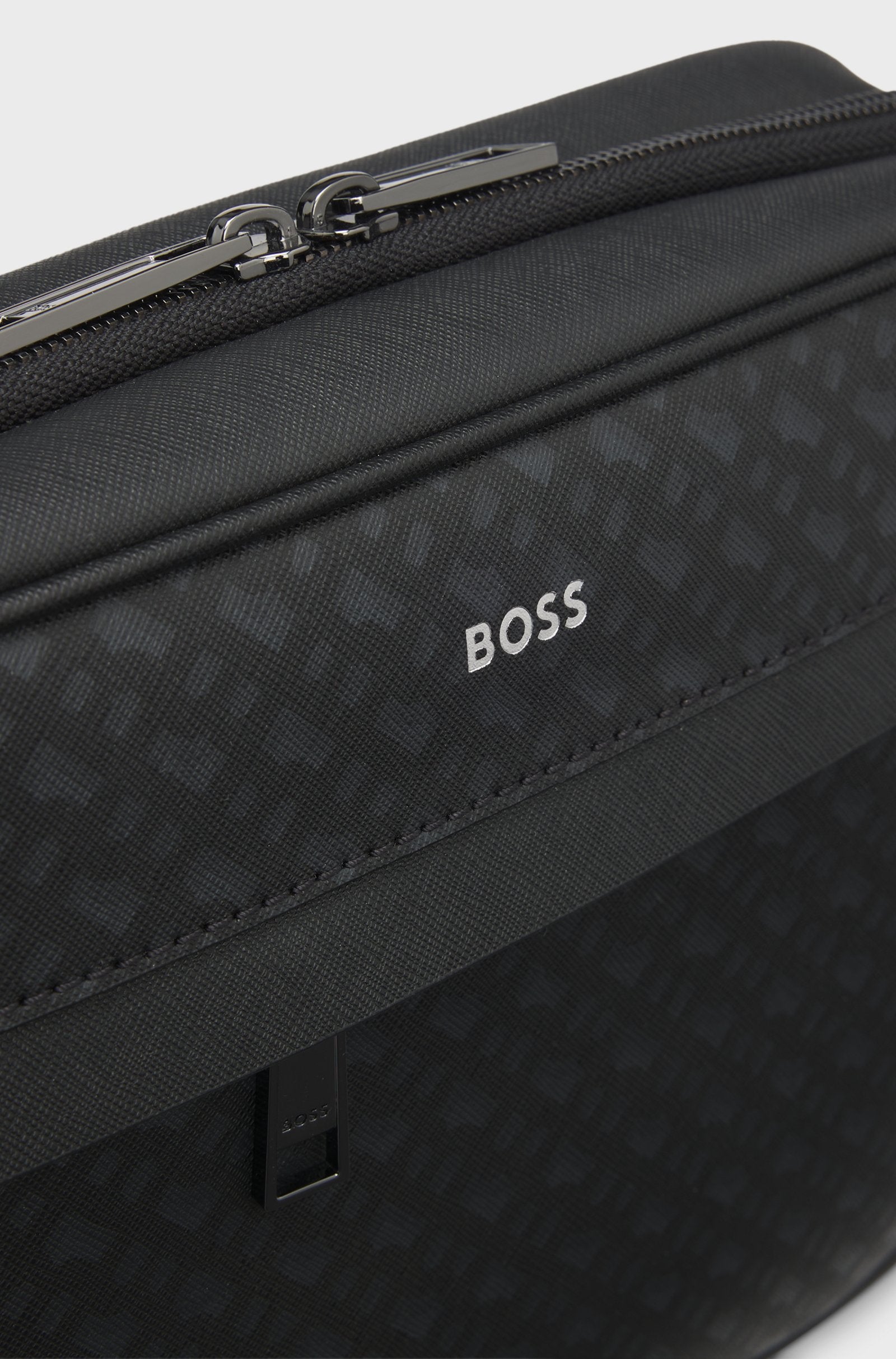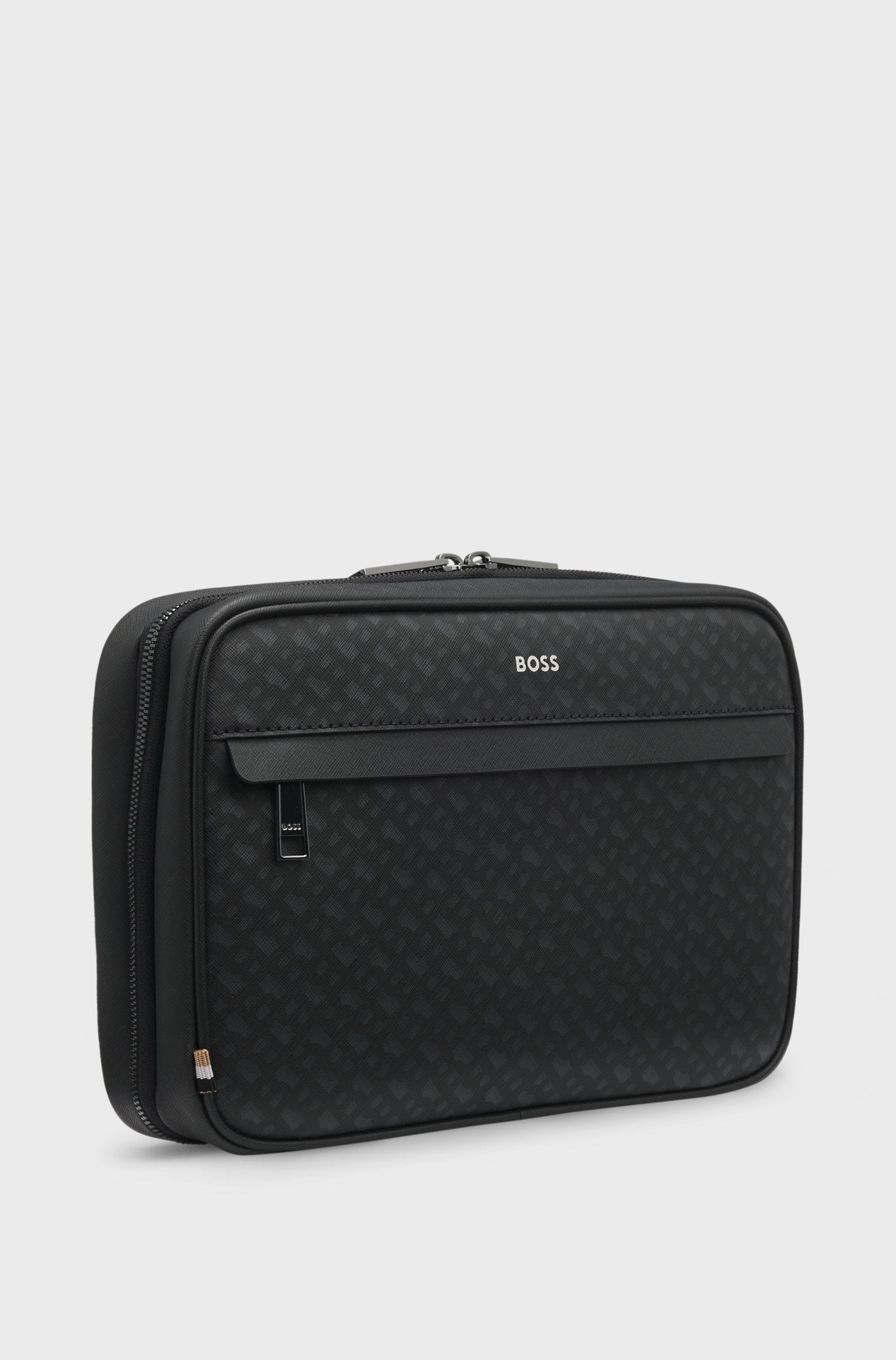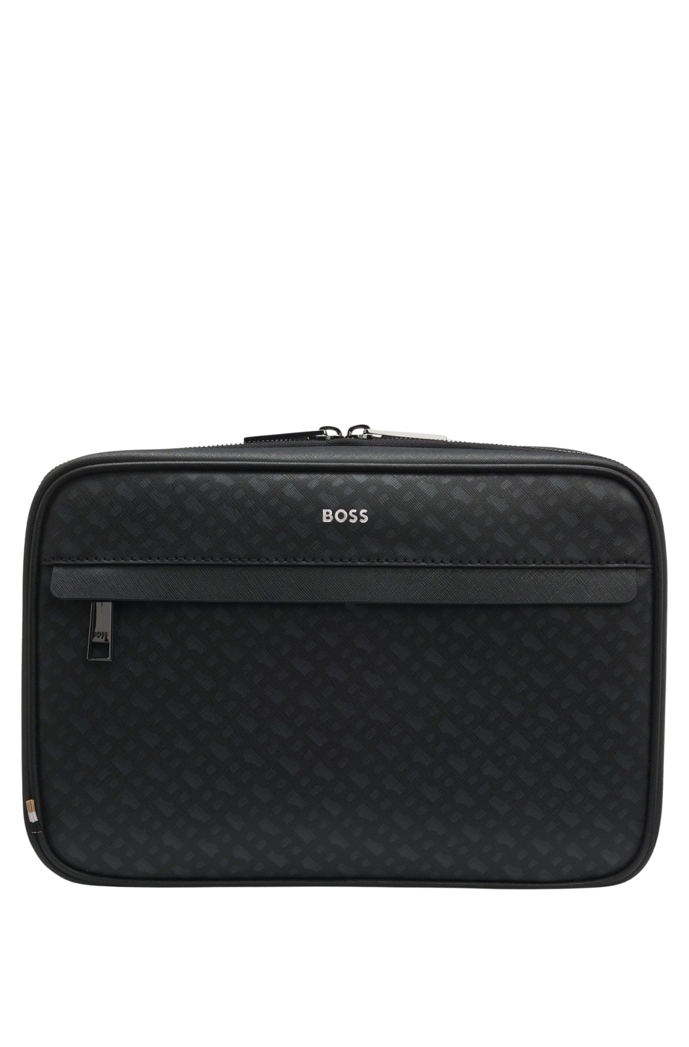 Upgrade your travel accessories with this organised BOSS Menswear washbag. Distinctive monogram pattern. Embossed with a silver-effect foil logo.
