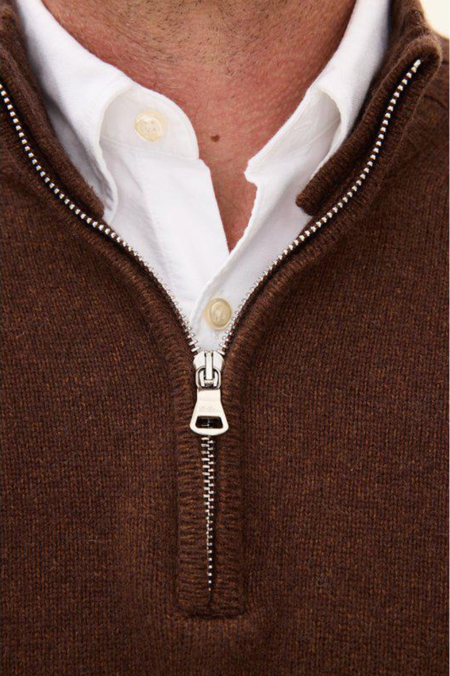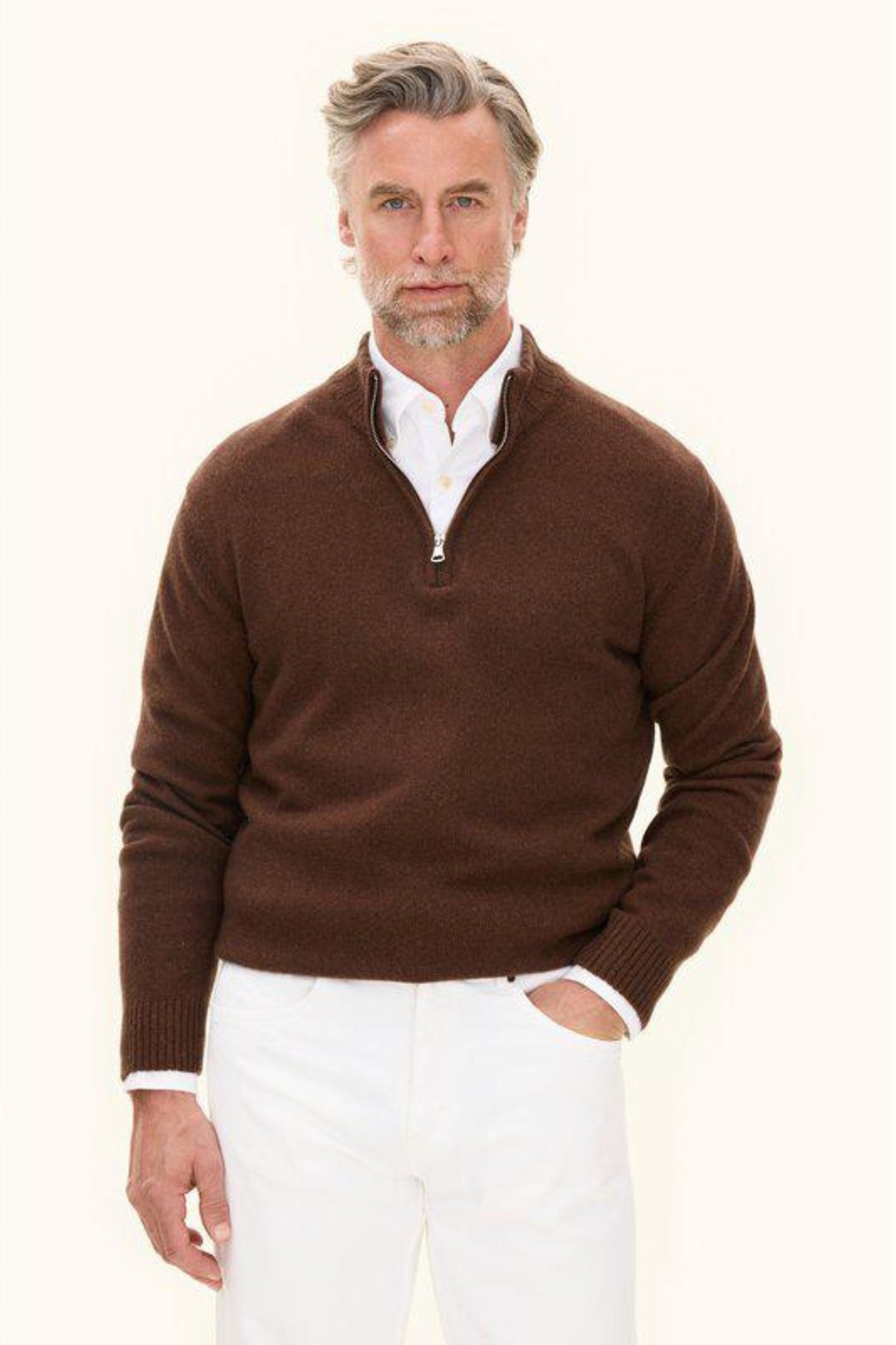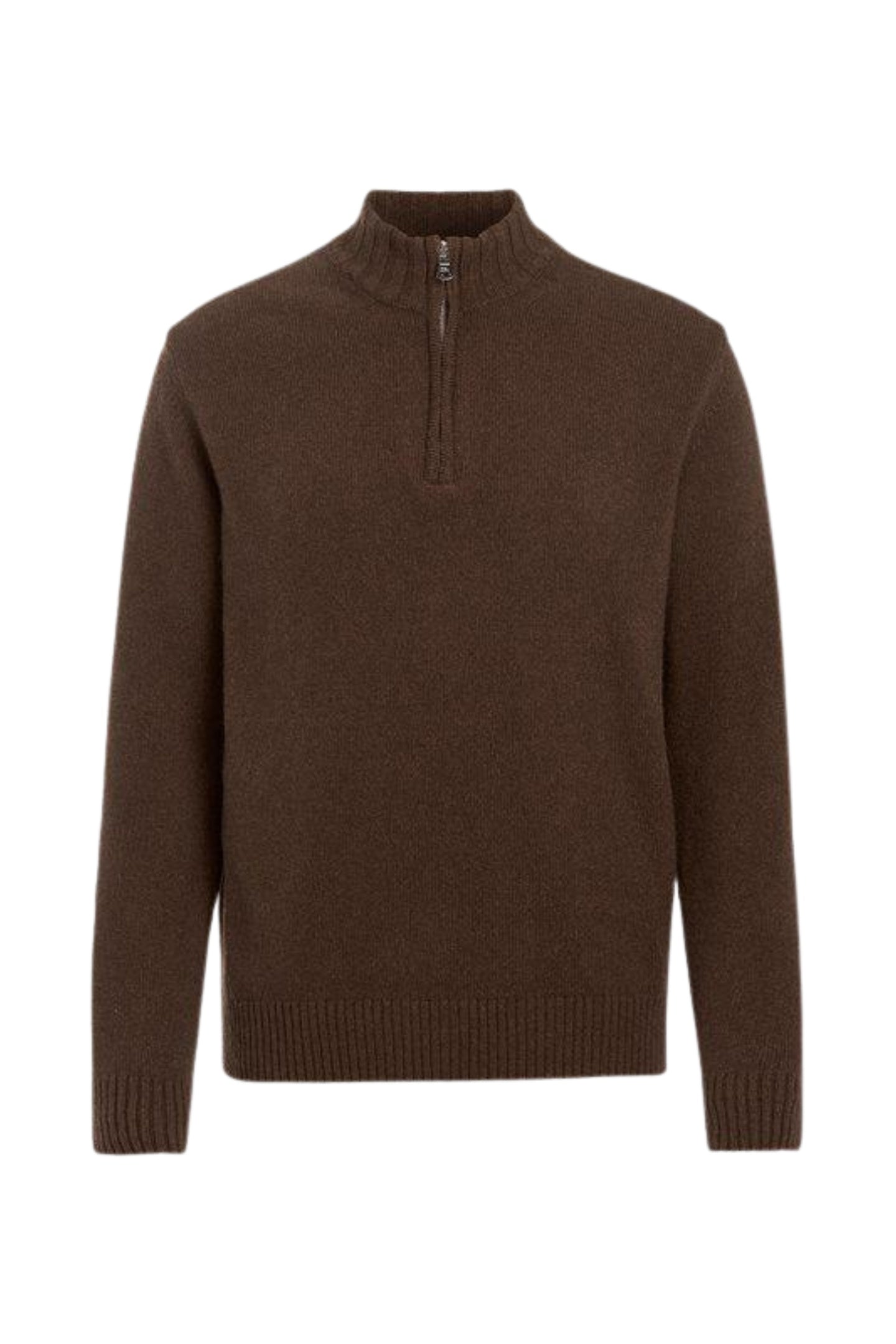 Plain knit half zip sweater in nice melange yarn. 2-ply i.e. 2 threads twisted together which gives this two-tone effect. Inside collar is solid color which gives a nice contrast. Soft and comfortable quality in a mix of wool, cashmere and viscose. In 7gg which gives a slightly thicker/stronger garment to wear both indoors and outdoors.