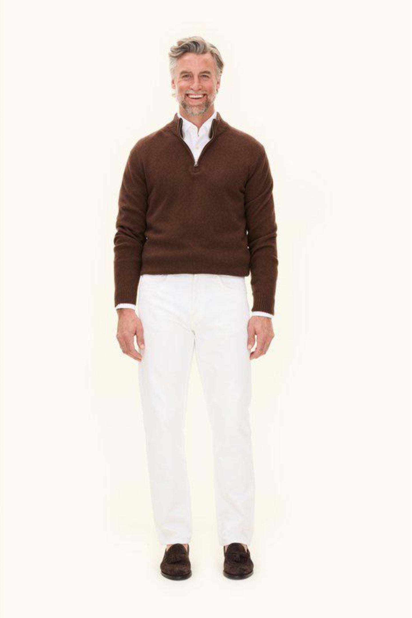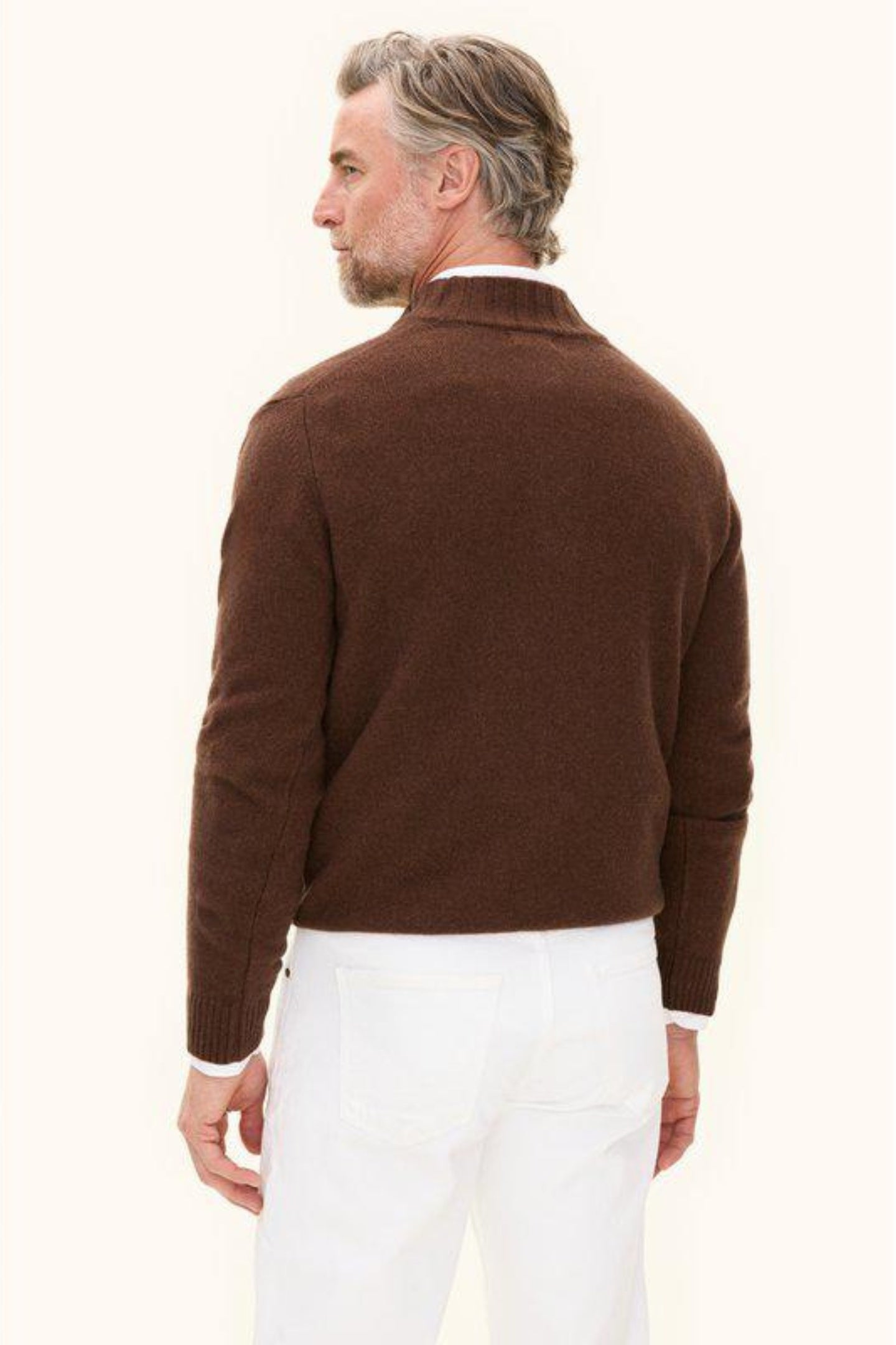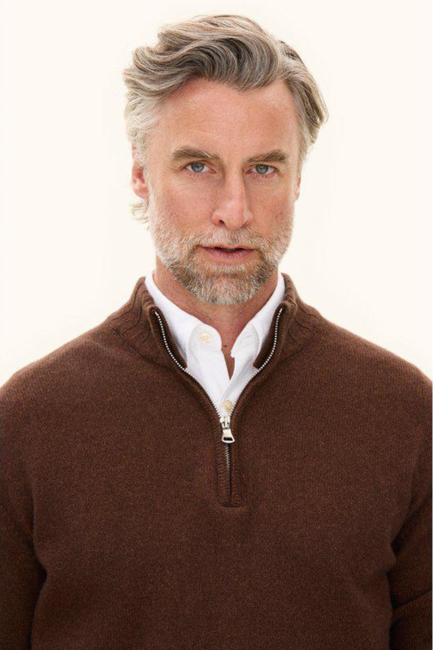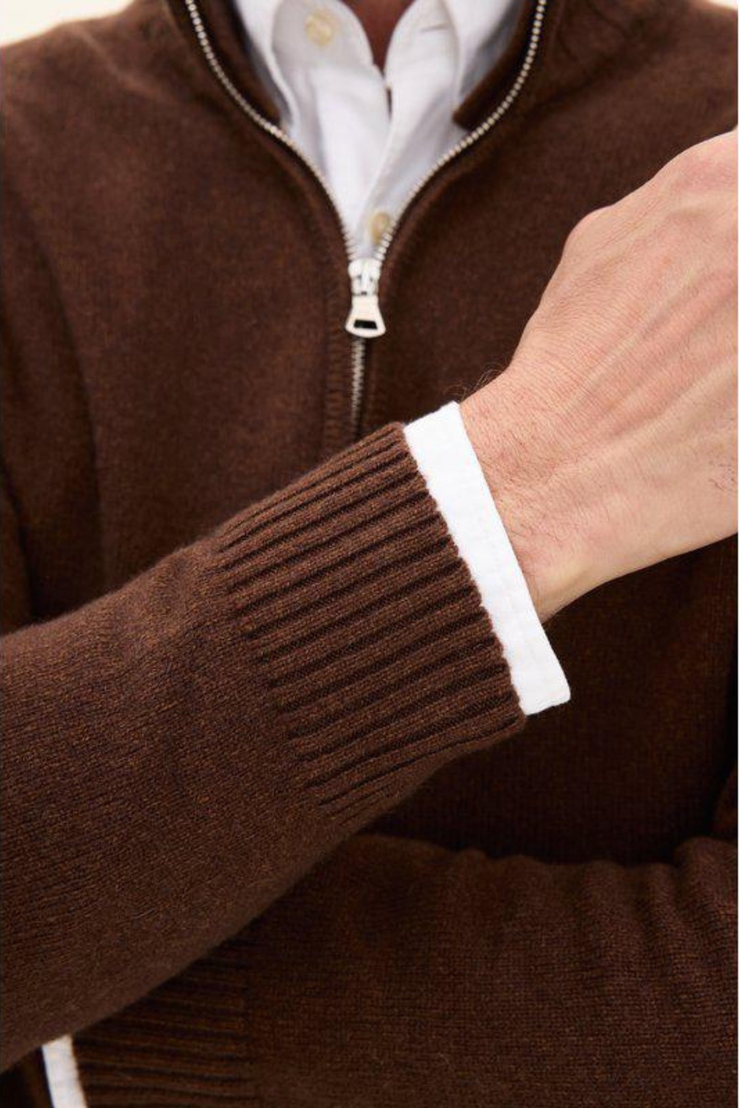 Plain knit half zip sweater in nice melange yarn. 2-ply i.e. 2 threads twisted together which gives this two-tone effect. Inside collar is solid color which gives a nice contrast. Soft and comfortable quality in a mix of wool, cashmere and viscose. In 7gg which gives a slightly thicker/stronger garment to wear both indoors and outdoors.