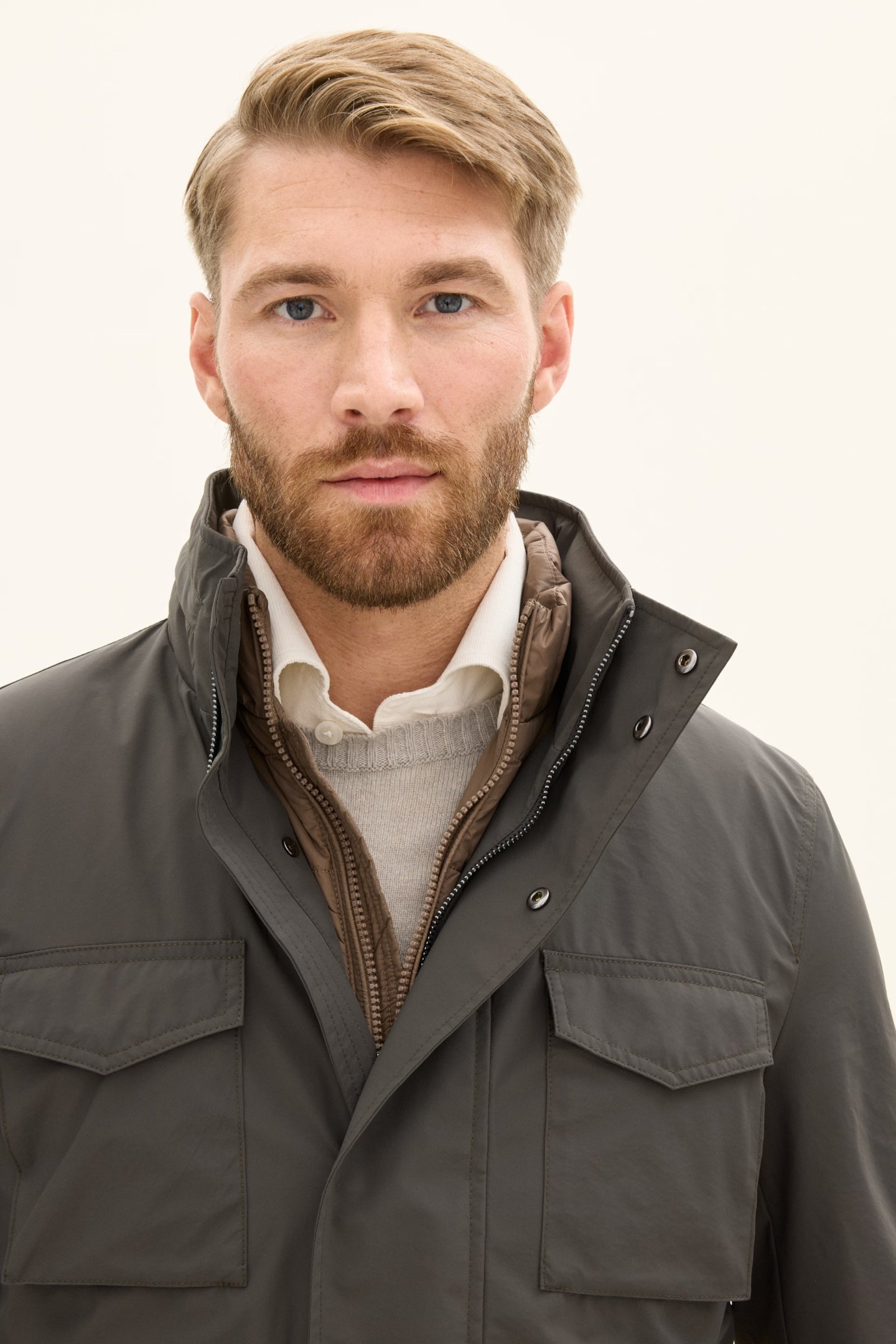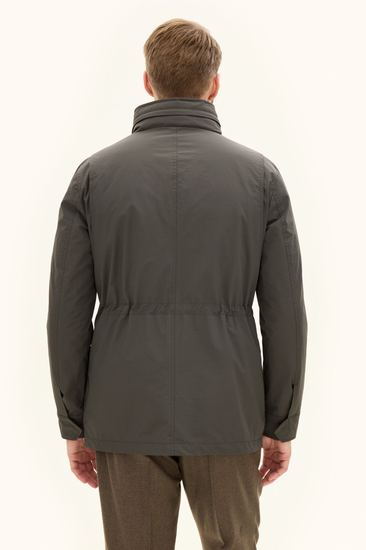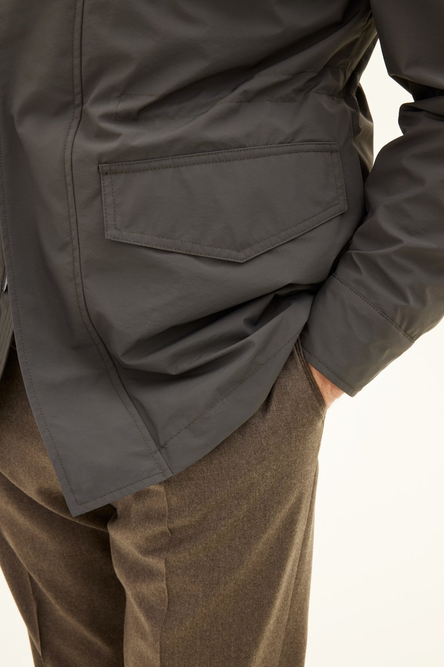 Our Nylon Shell field jacket is a stylish and functional version of the classic M-65 jacket designed to work as a blazer or a more casual knit sweater. With six pockets on the outside and three inside pockets, you have space for everything you need to carry with you and also the opportunity to protect your hands in tough weather conditions. The back is designed with action back to give you additional mobility in the garment and the waist is marked with adjustable drawstrings for a personal fit. The inside is lined with a ripstop lining and contains buttons for attaching our liner vest. Nylon Shell is our three-layer shell material, designed to protect against the elements without compromising on mobility, breathability or style