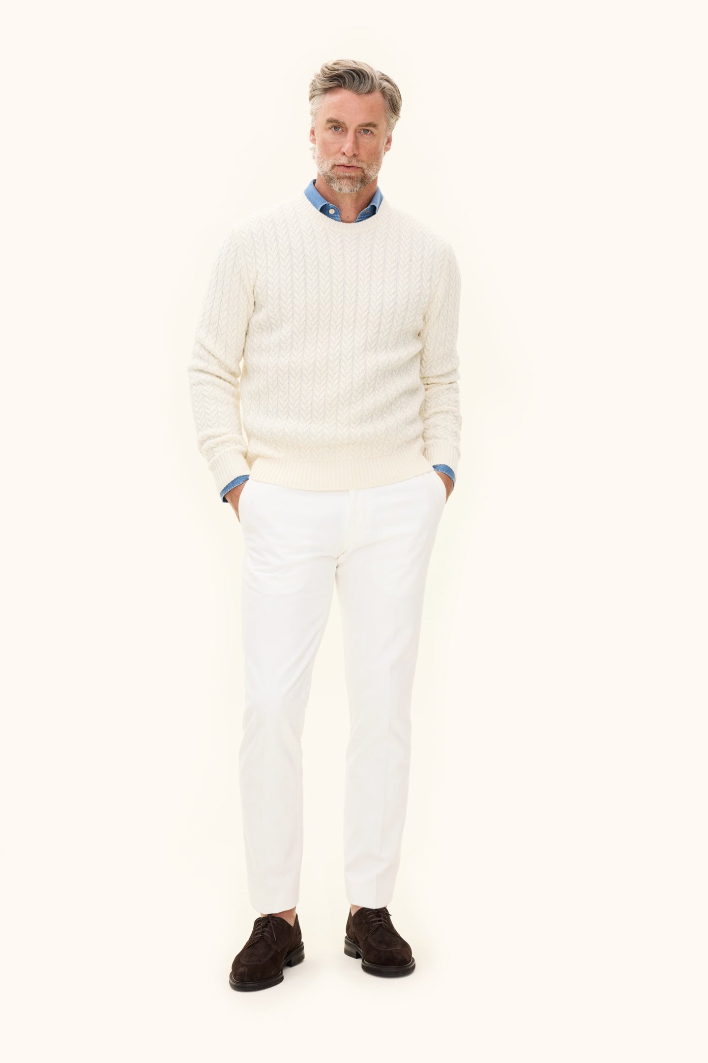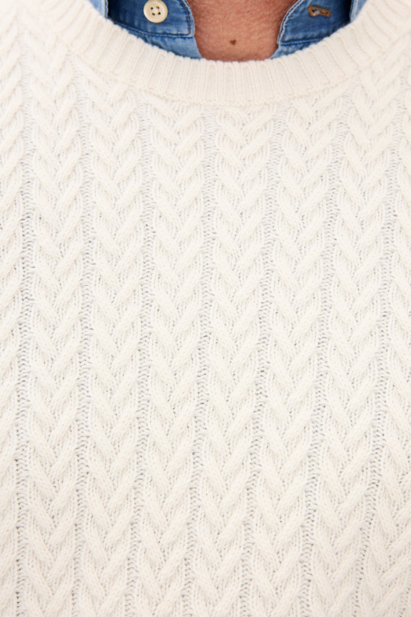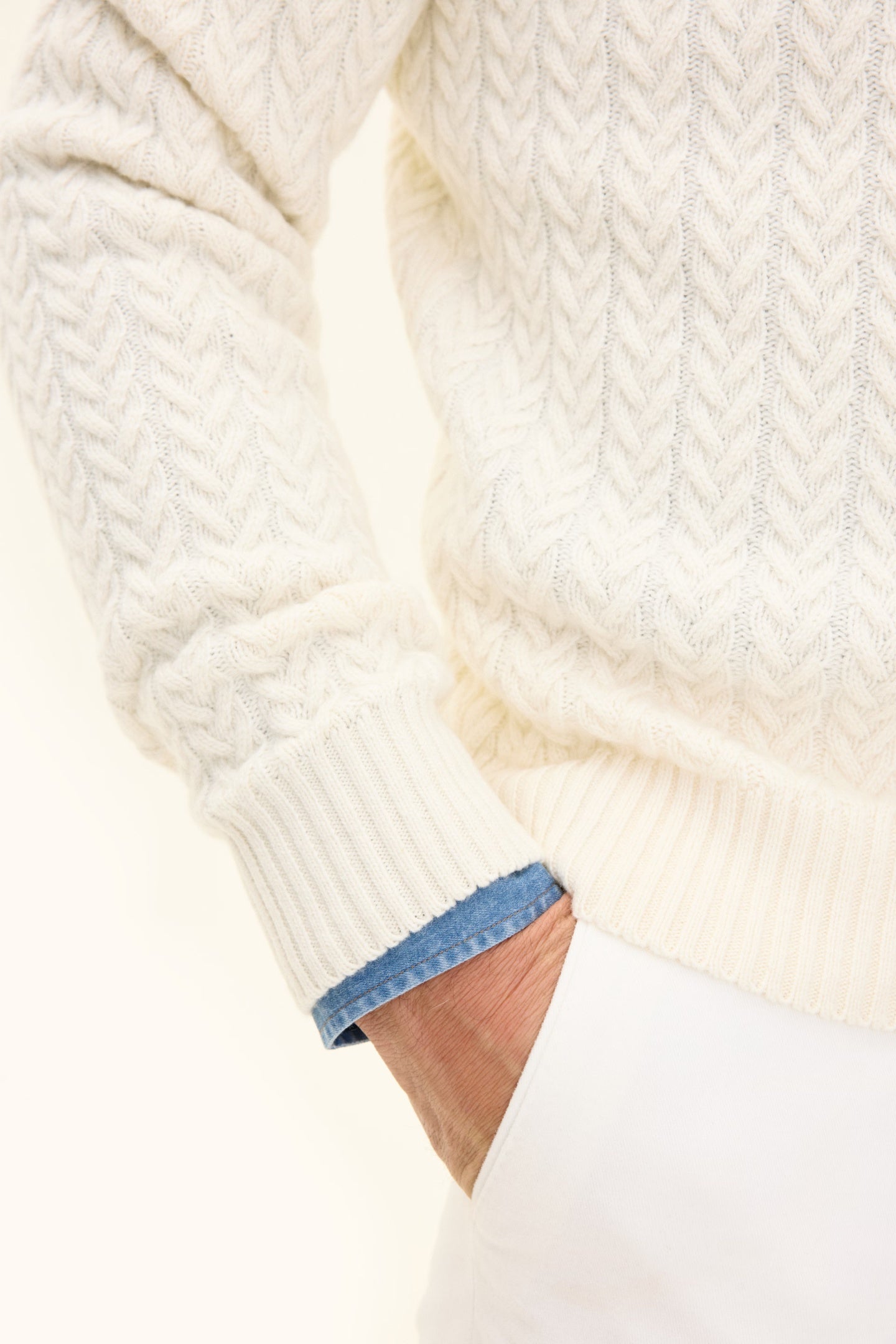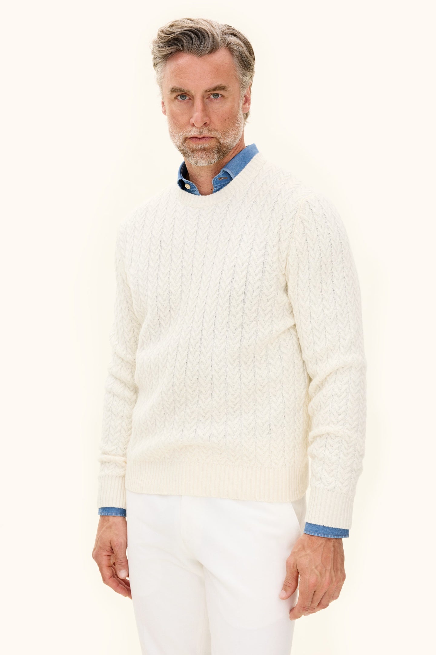 Round neck sweater with elegant cable knit all over. 2x2 rib at neck and hem for a characteristic finish. Soft and comfortable quality in a blend of wool, cashmere and viscose. 7gg. A garment to wear both indoors and outdoors.