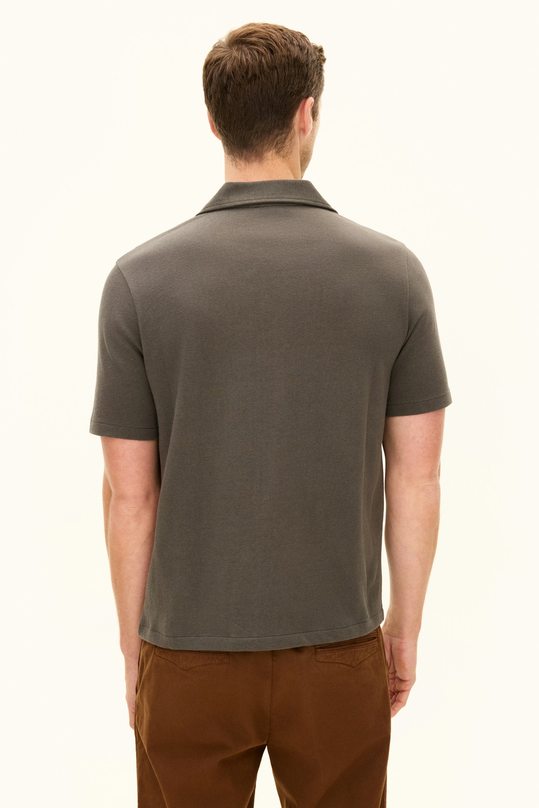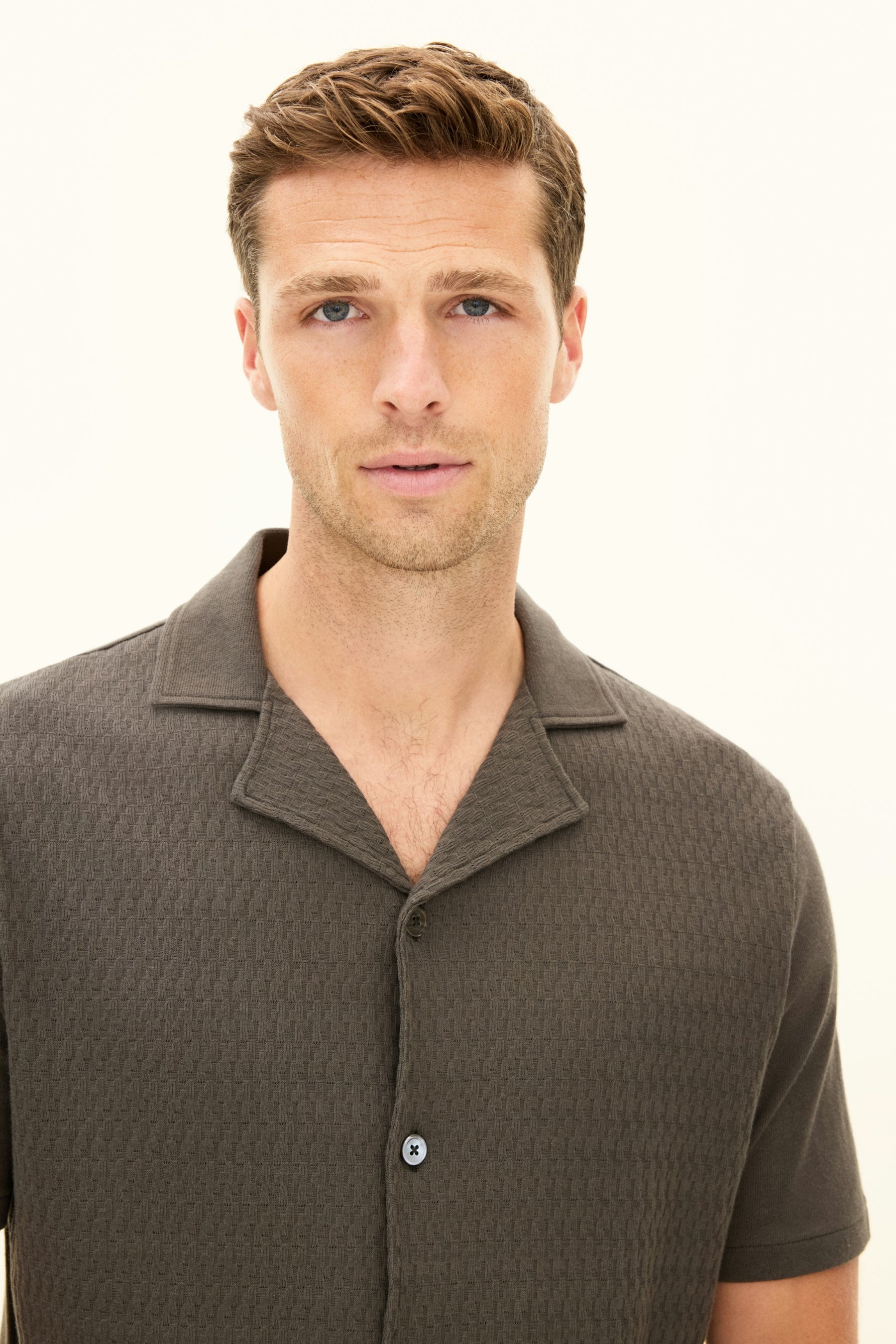 This short-sleeved cotton knit shirt, made from cotton jersey with a finely structured front, has mother-of-pearl buttons for a sophisticated touch. The shirt is both comfortable and airy – ideal for warm summer days.