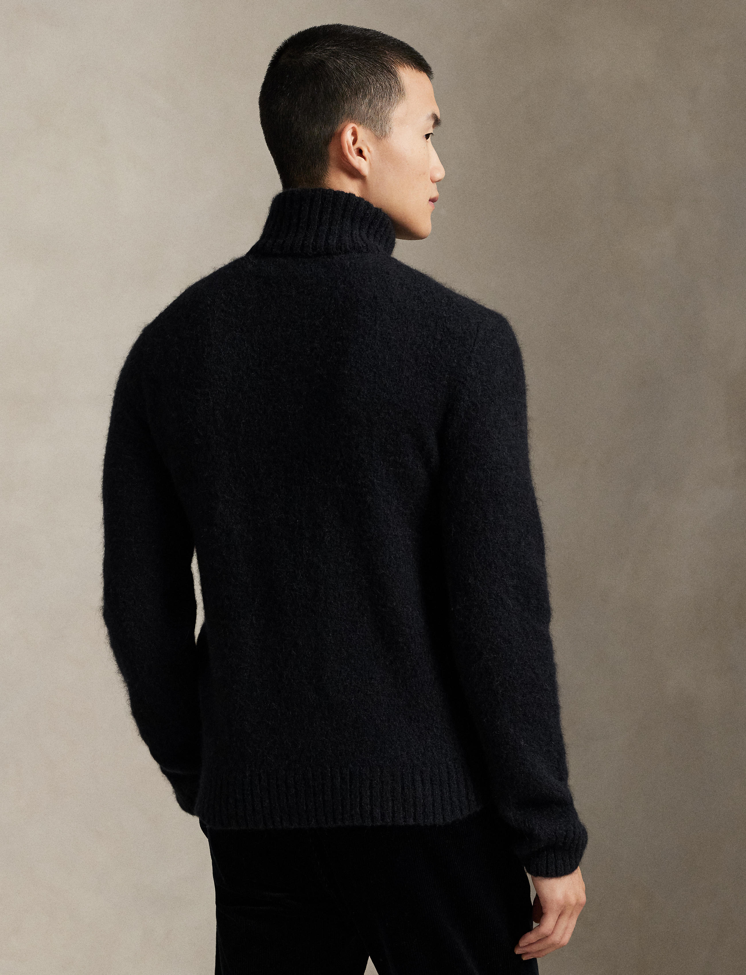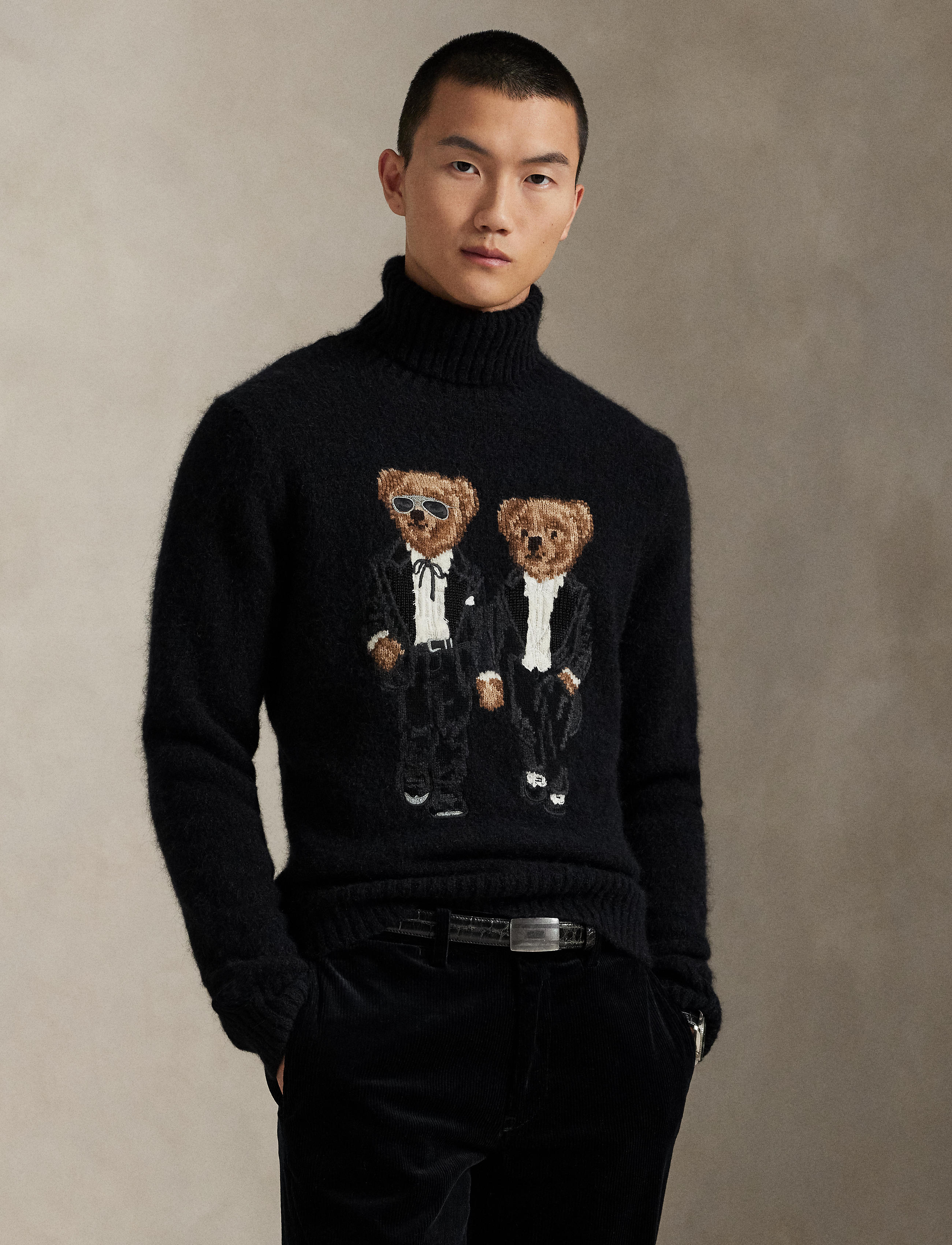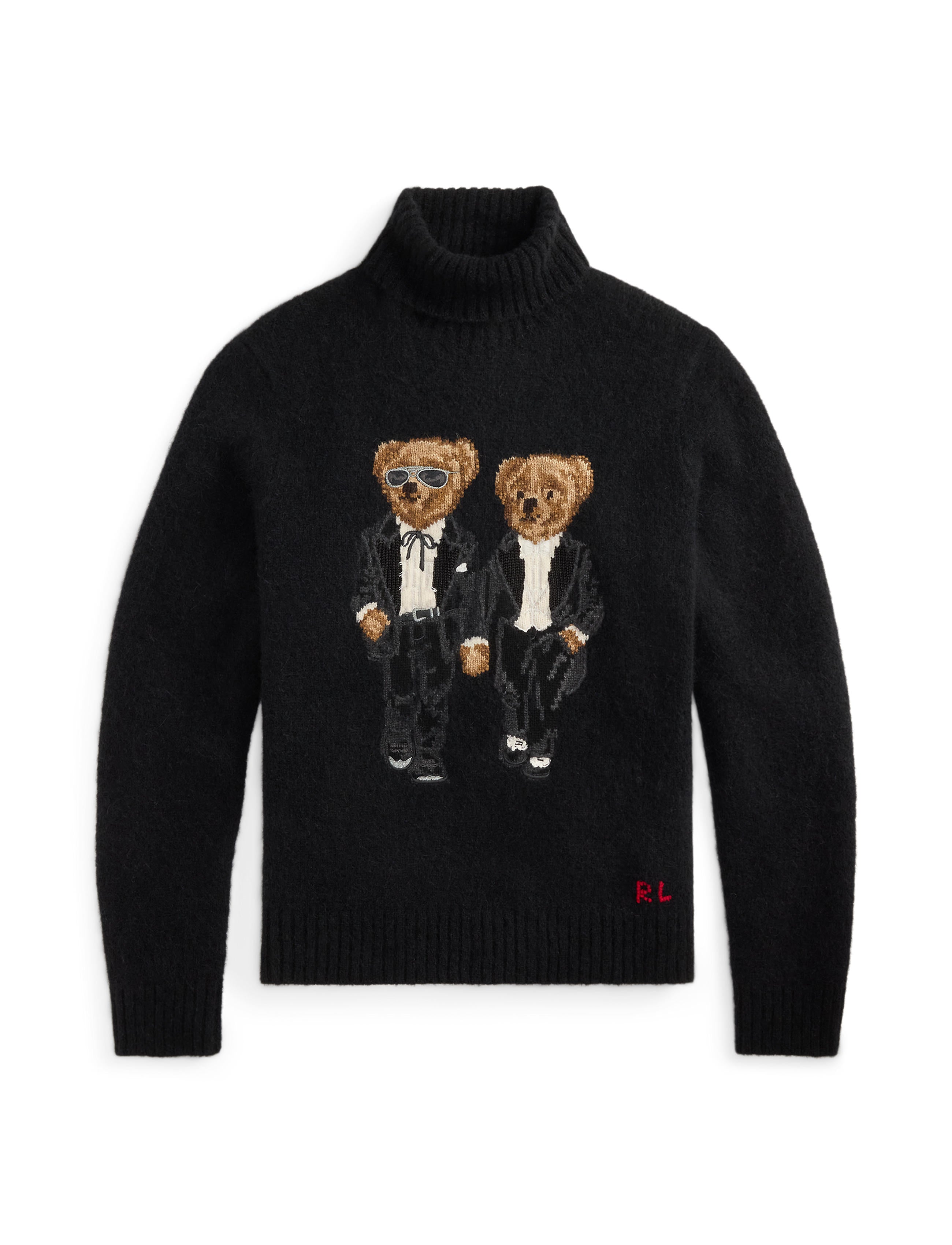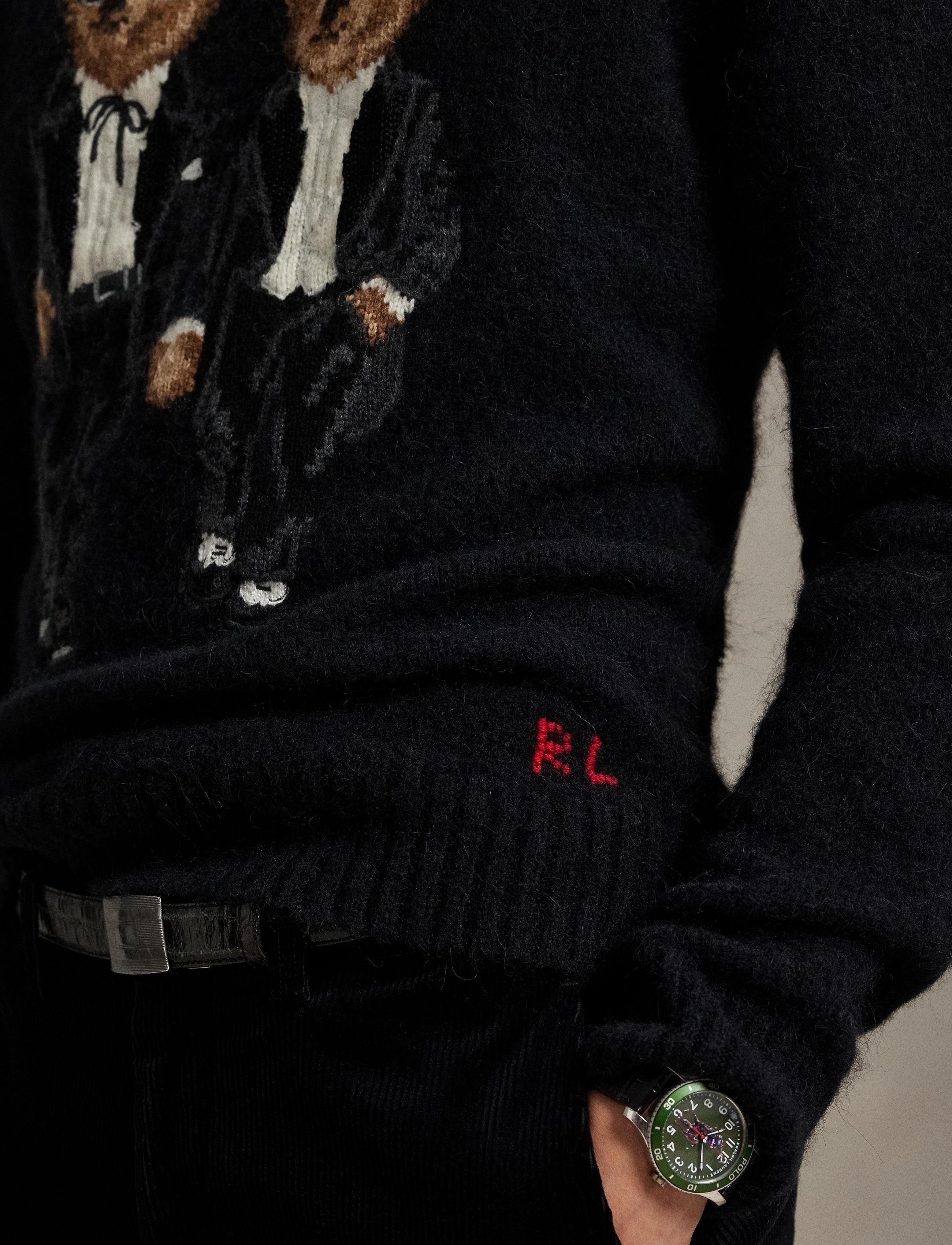 This special-edition sweater unites over 15 yarns to depict two bears in black-tie attire. Reflecting the elegance and excitement of a special occasion, the graphic is inspired by an iconic photograph of Mr. and Mrs. Lauren attending an awards show in the late ’70s.