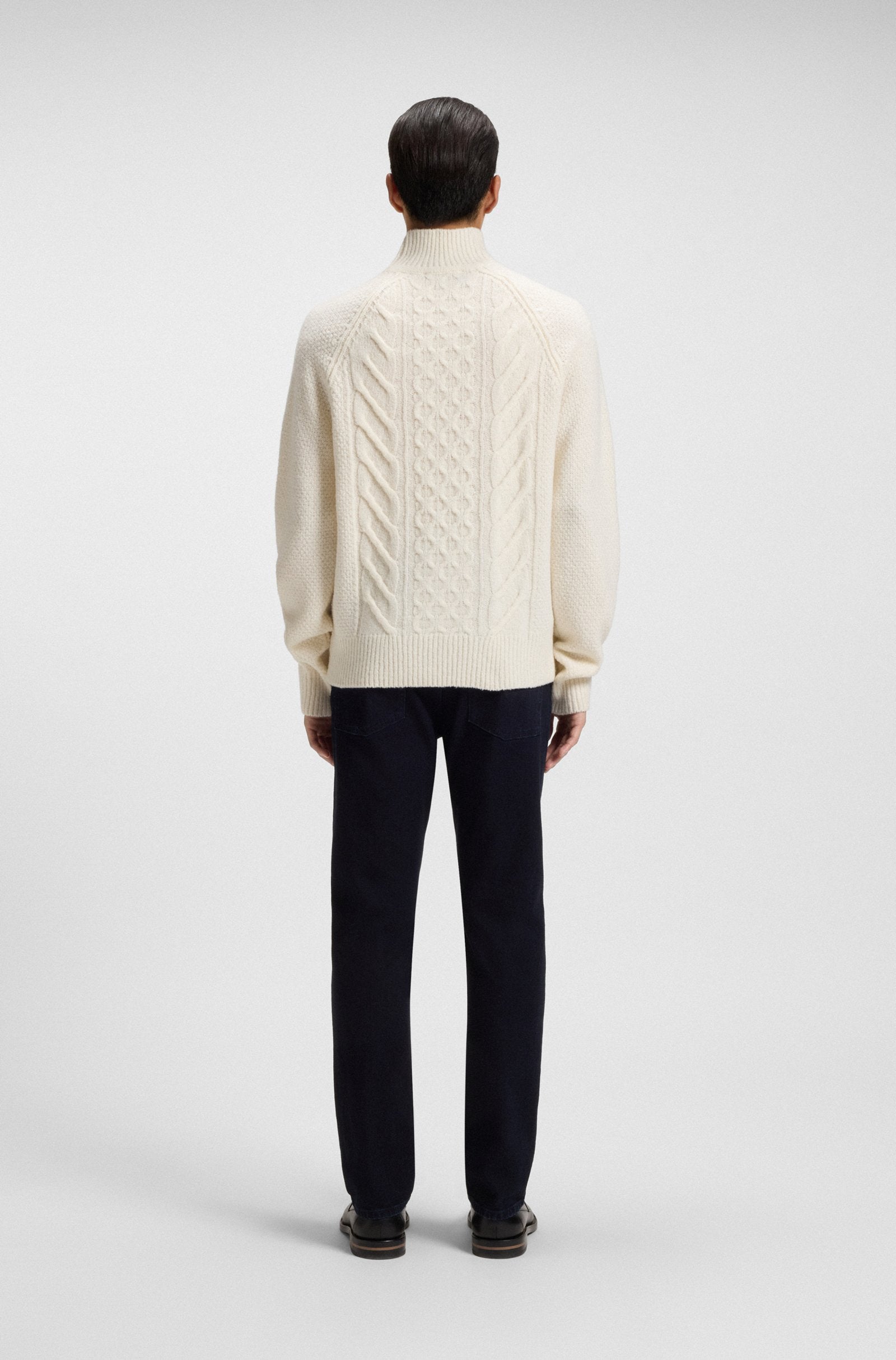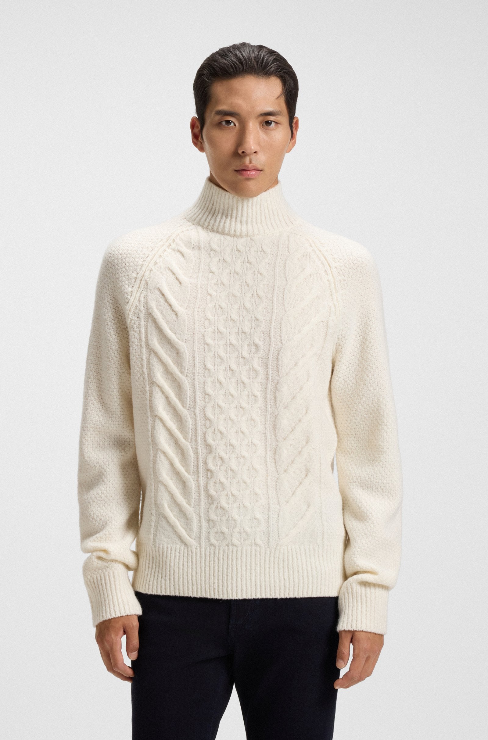 In bouclé yarn made from virgin wool and silk, this BOSS Menswear sweater offers cosy luxury in cold weather. Mock neck. Rich cable-knit structure.
