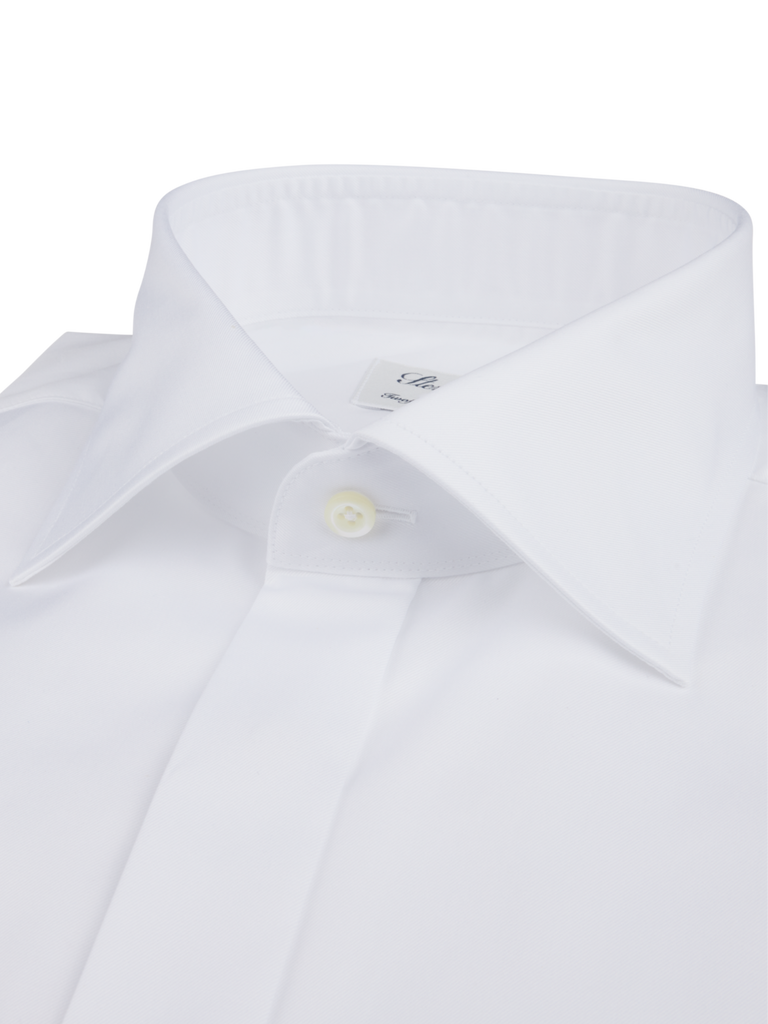 White is a color that complements anything in your wardrobe. Cut from crisp twofold super cotton for a slim and flexible fit, this shirt is finished with French cuffs, mother of pearl buttons and a moderate cut away collar. Team it with tailored pants or a nice suit.