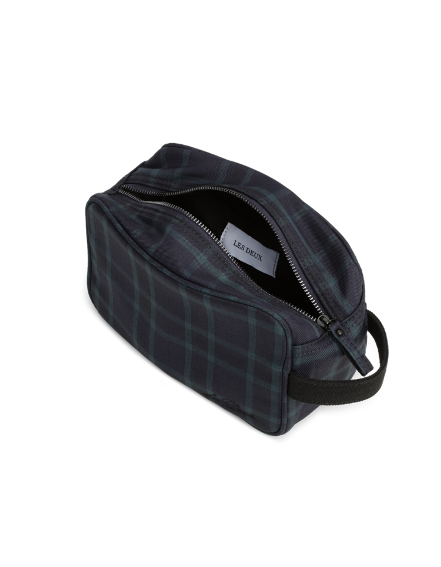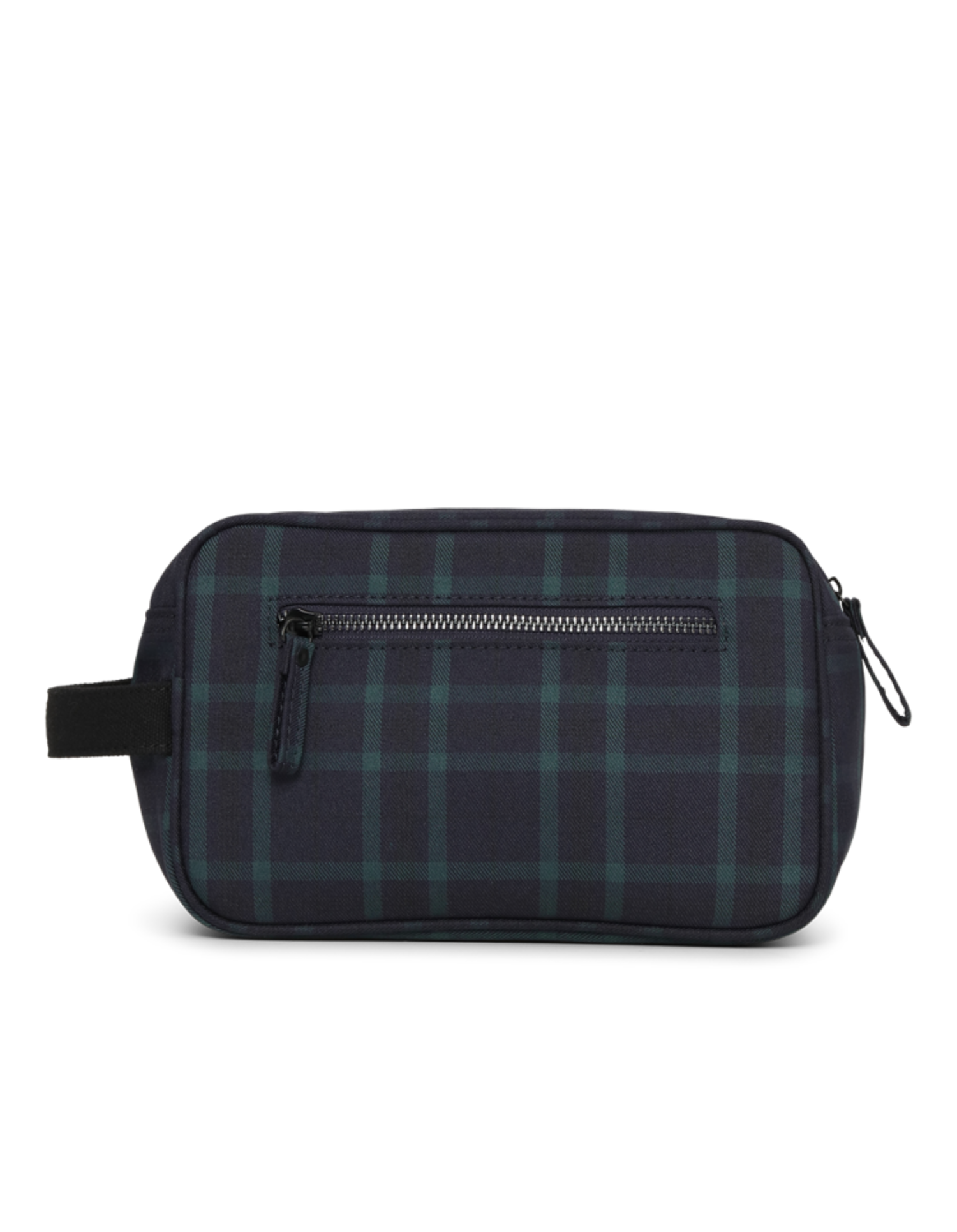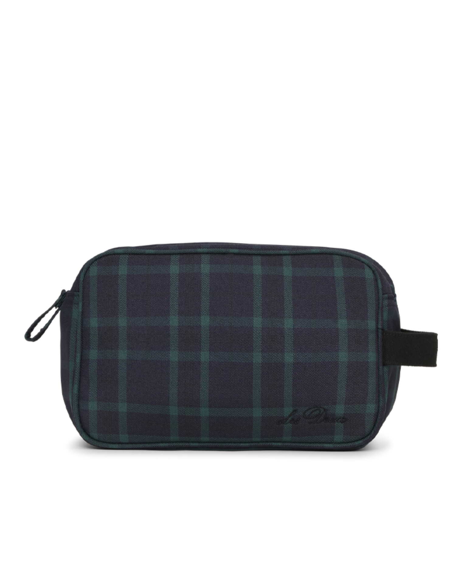 A compact wash bag in a subtle check pattern, designed with a clean rectangular shape and tonal embroidery. Finished with a back zipper pocket and a side carry strap.