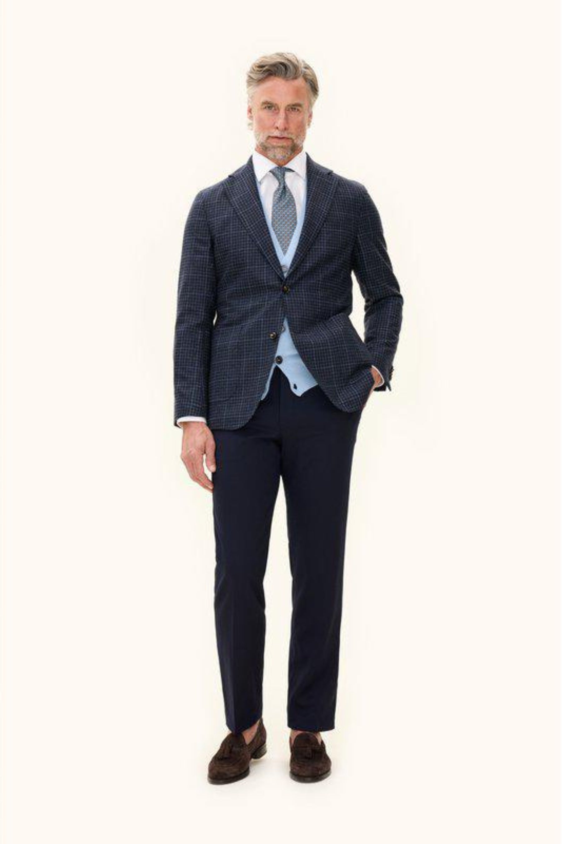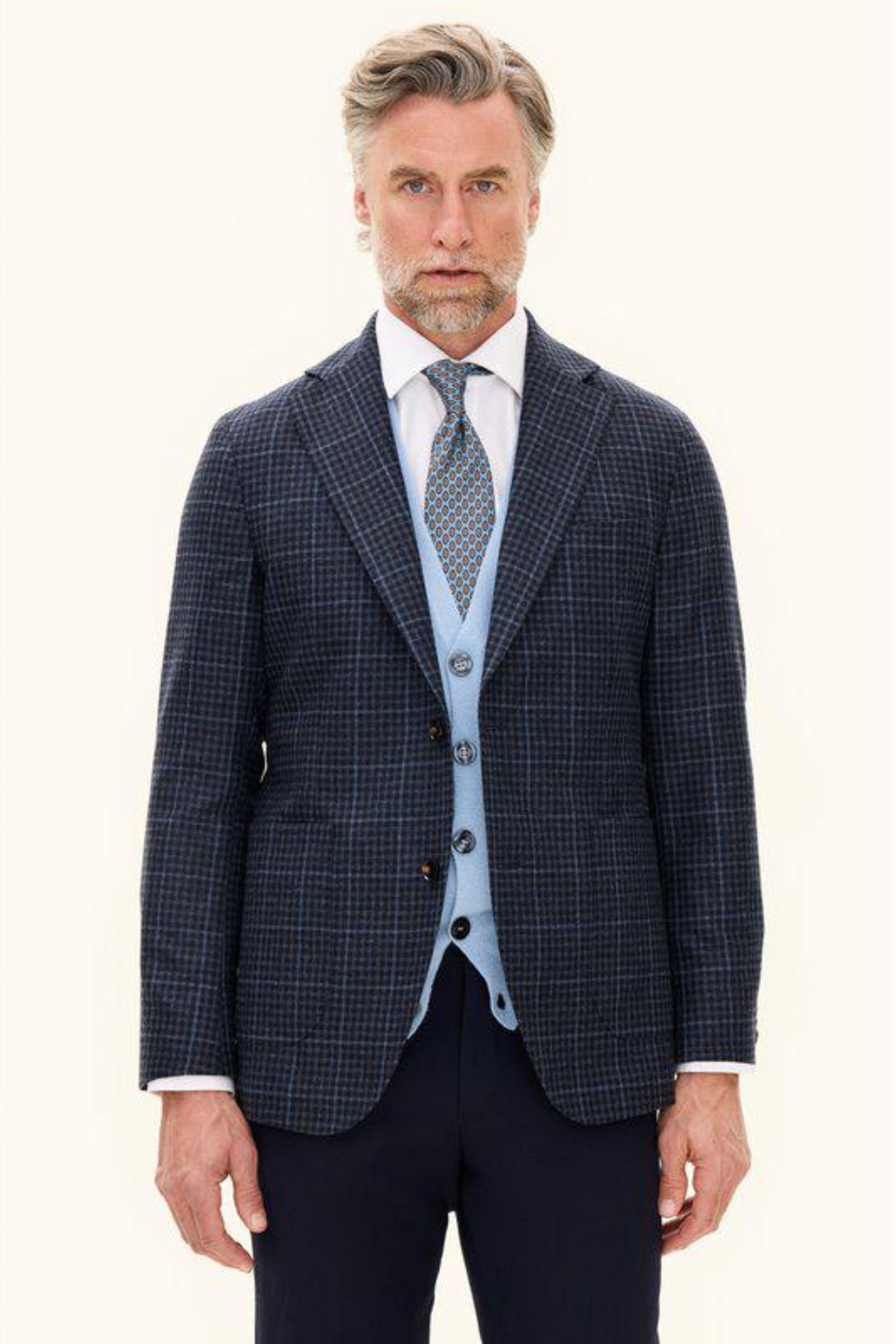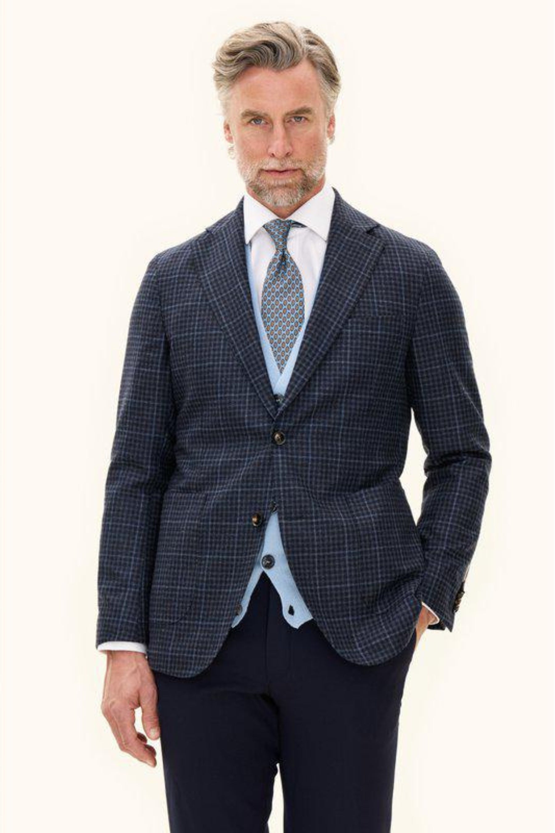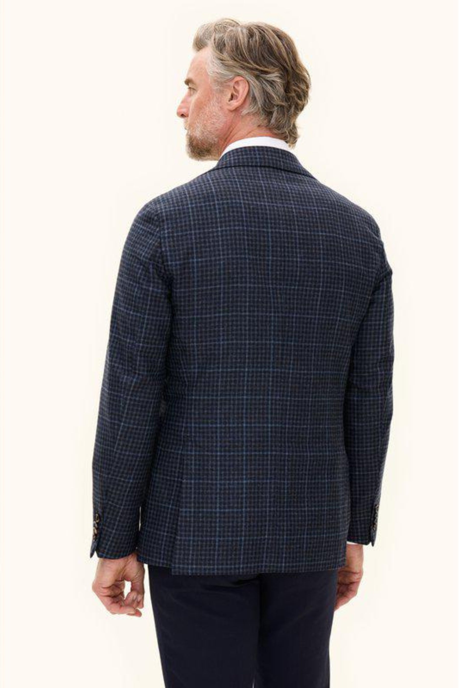 An elegant blazer in a wool blend, tailored to a regular fit and defined by a classic checked pattern. Its single breasted cut and unconstructed shoulder create a relaxed yet refined character. A piece that easily transitions from business to leisure.