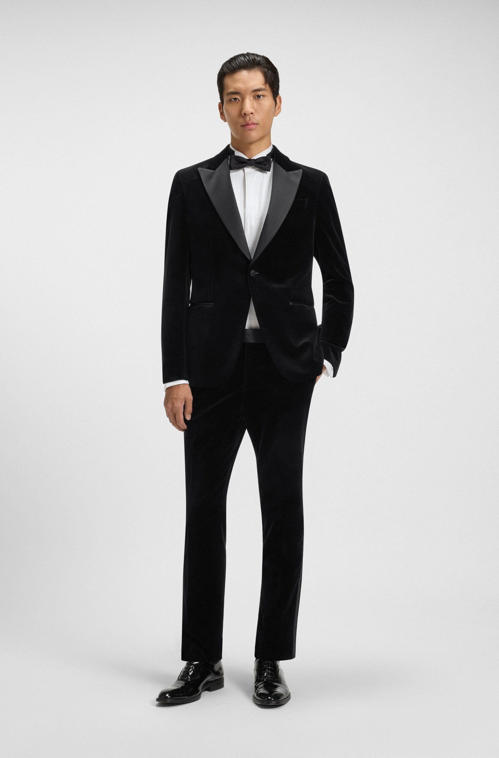 In opulent cotton velvet, this BOSS Menswear tuxedo jacket makes all the right statements at black-tie events. Silk-blend trims. Slim fit