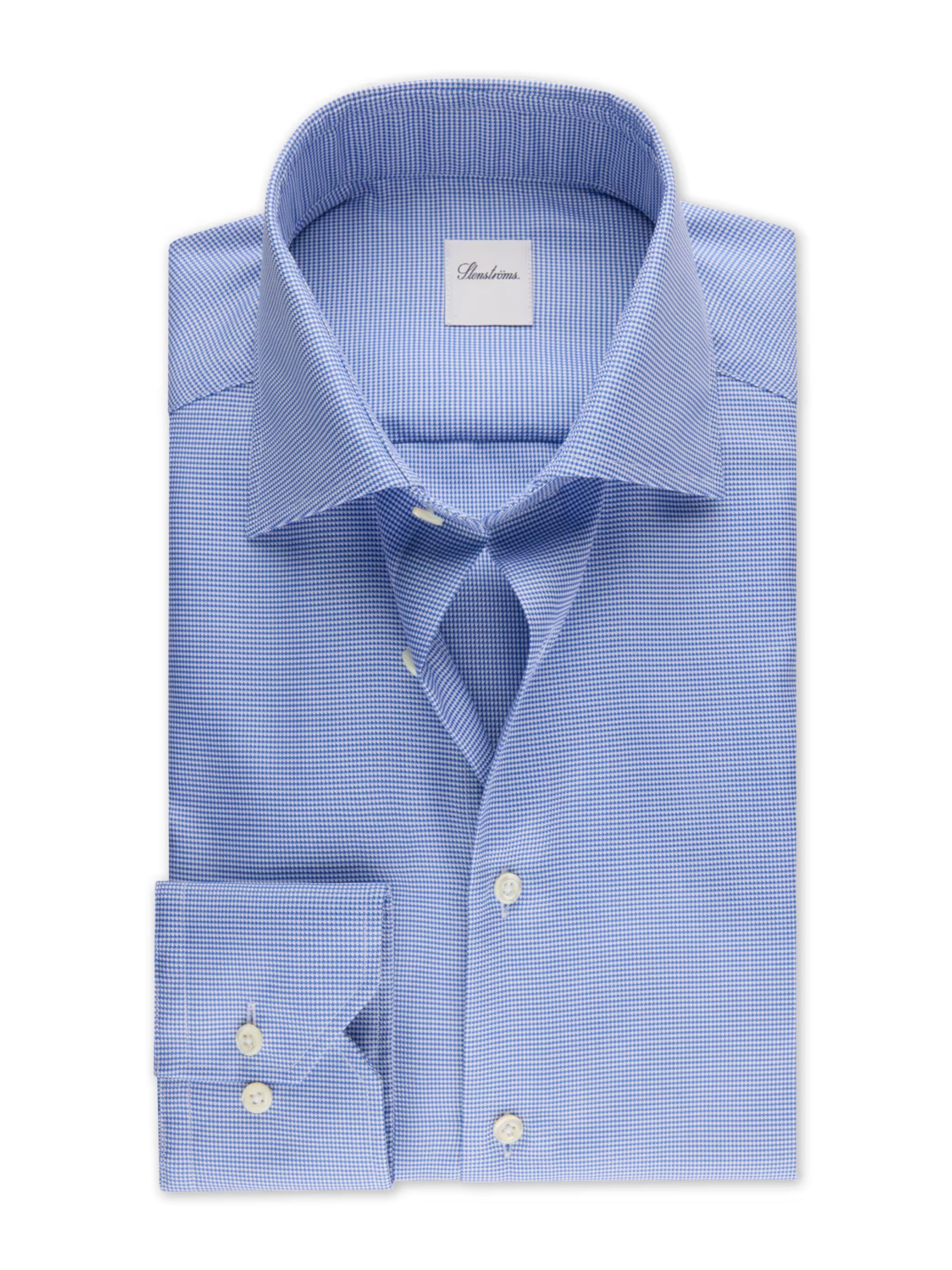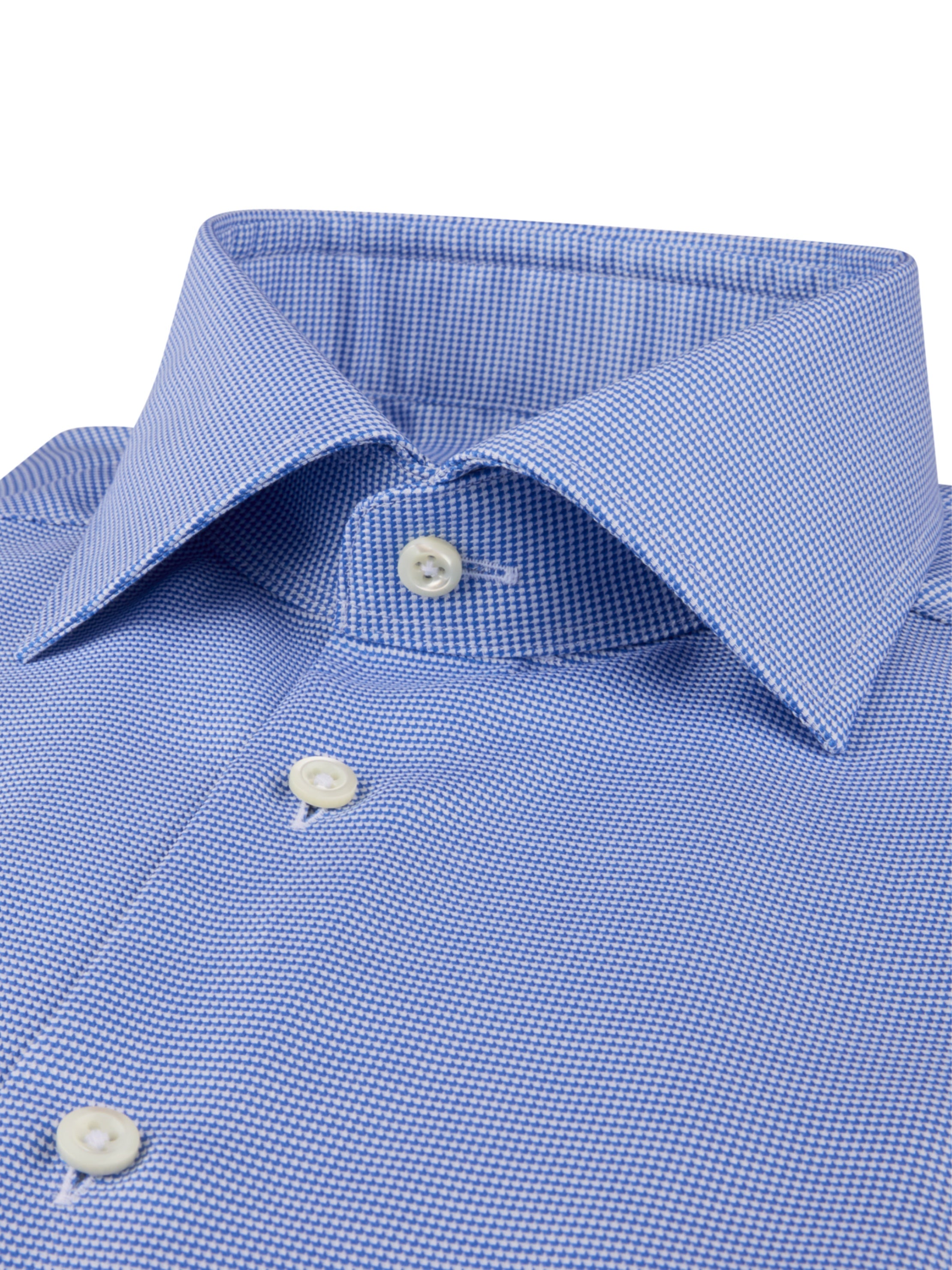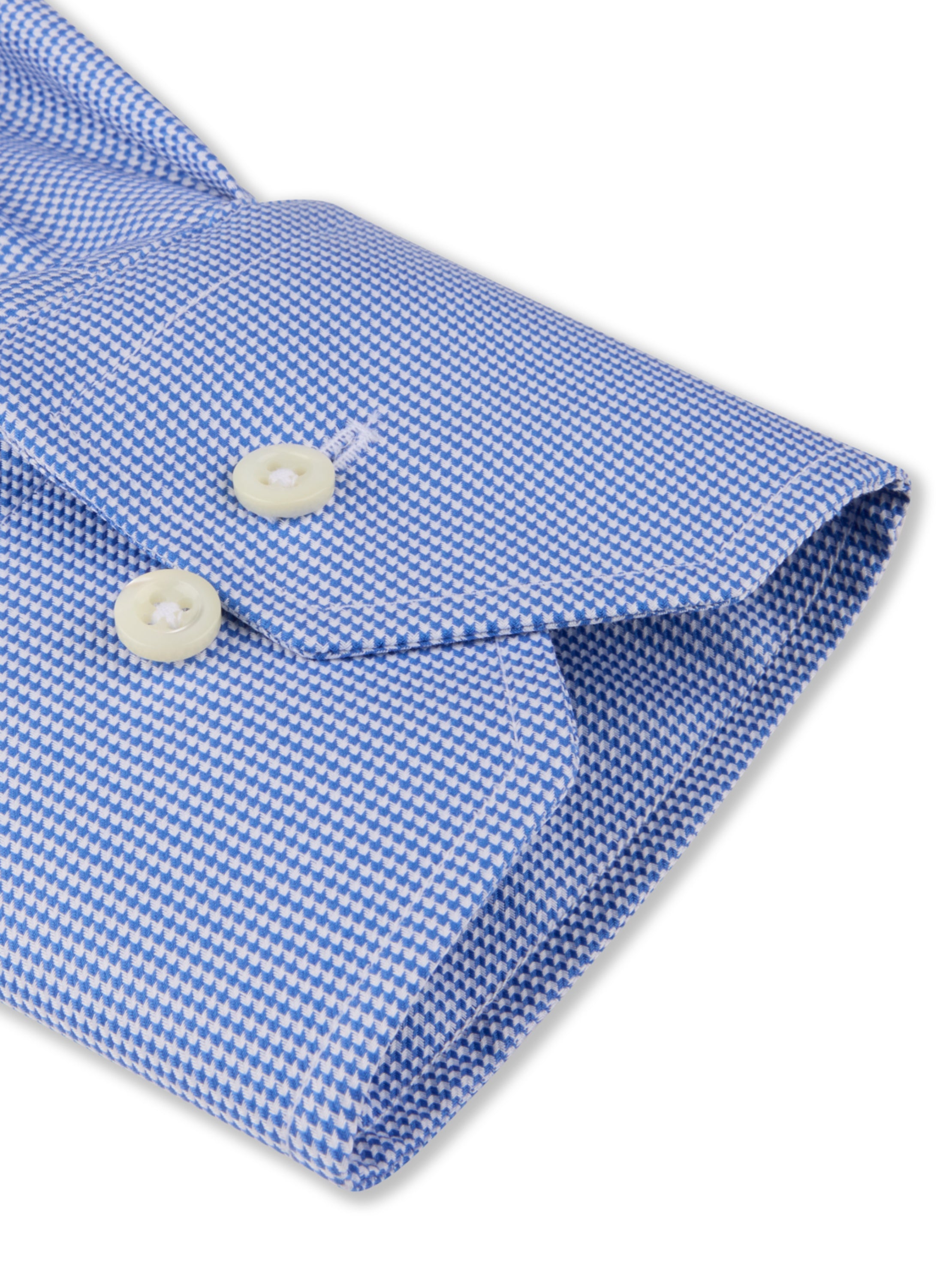 This twill shirt is made of twofold cotton and has a houndstooth pattern. The shirt is detailed with mother of pearl buttons, single cuffs and a cut away collar.