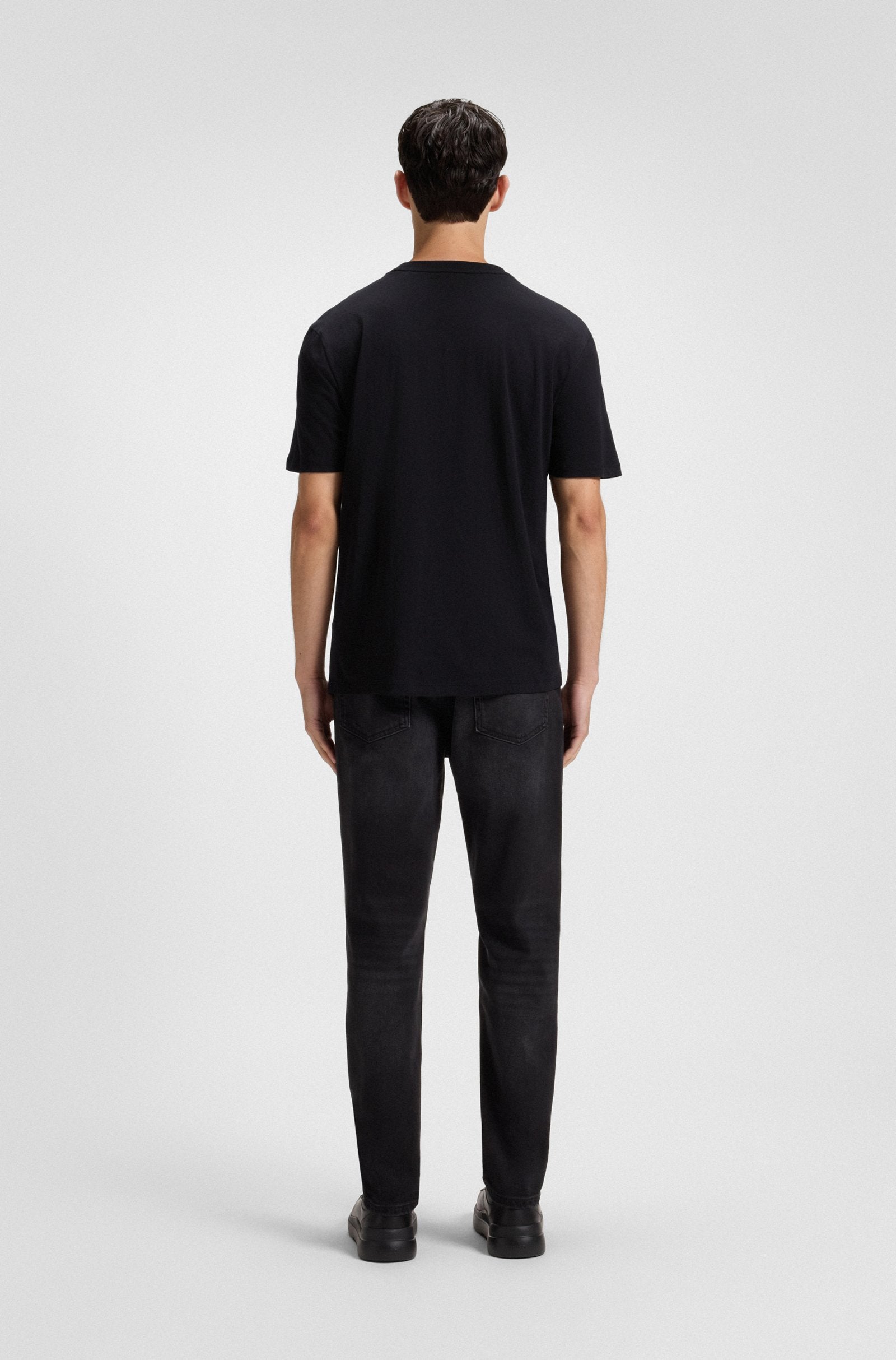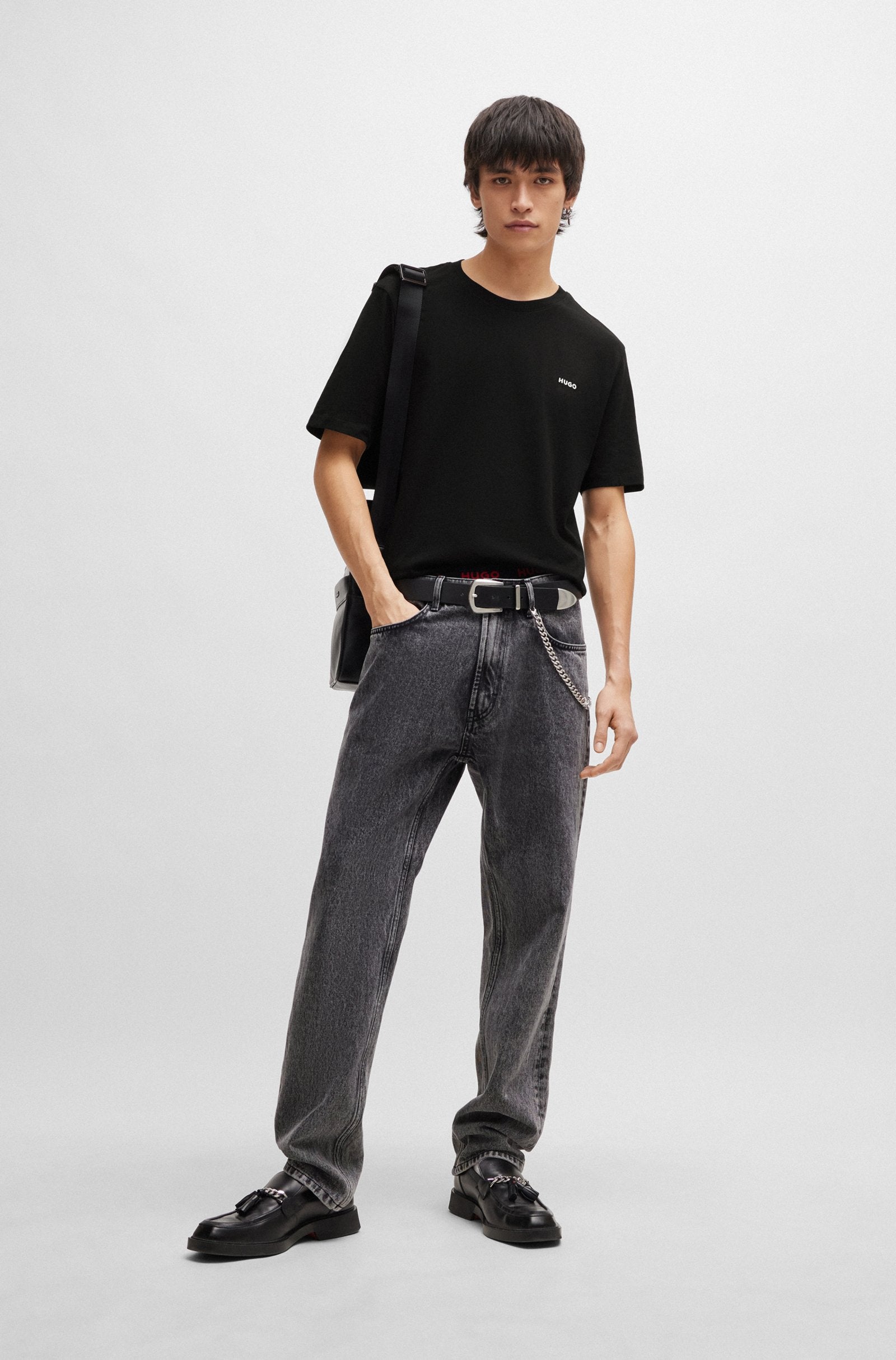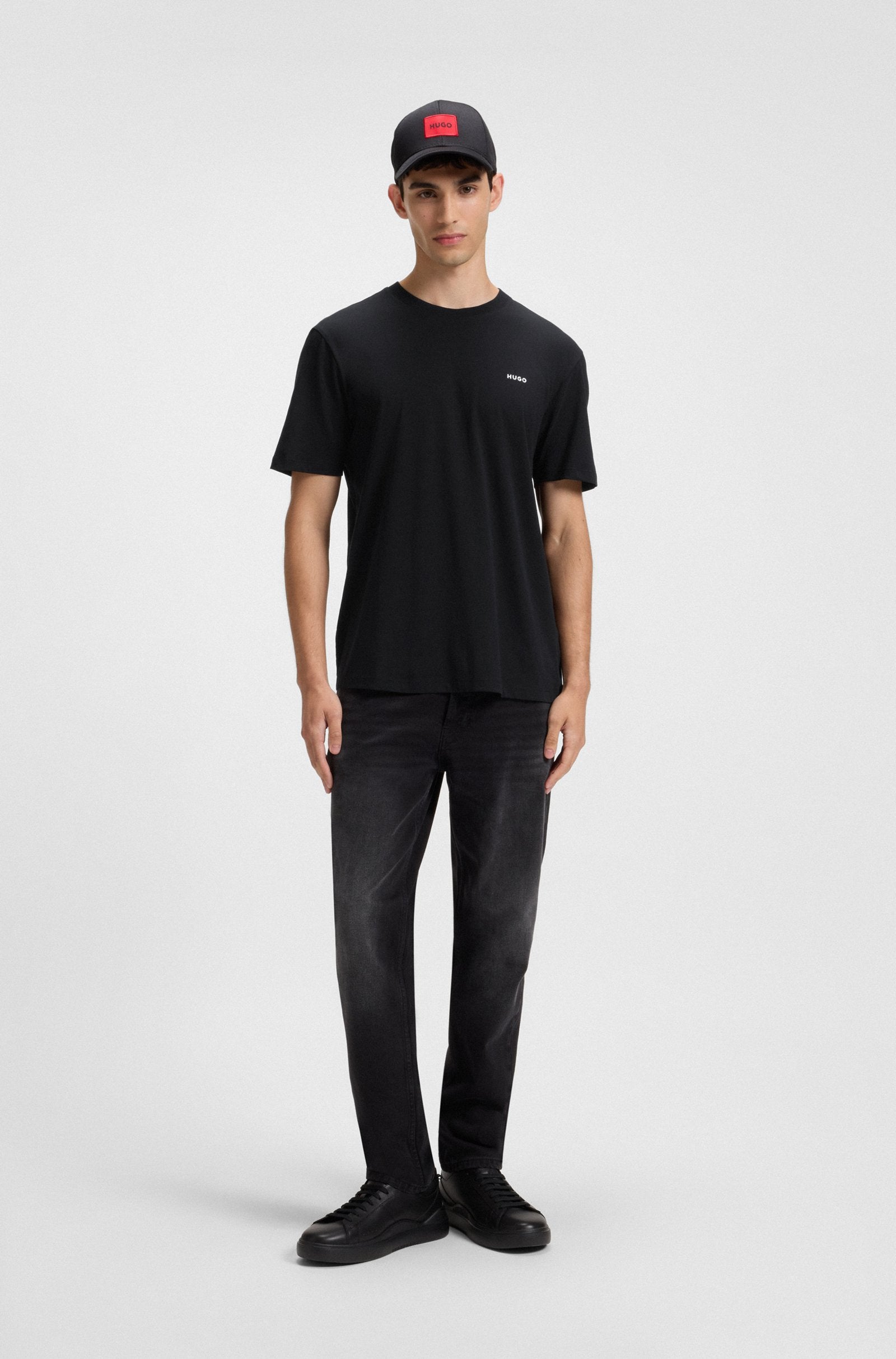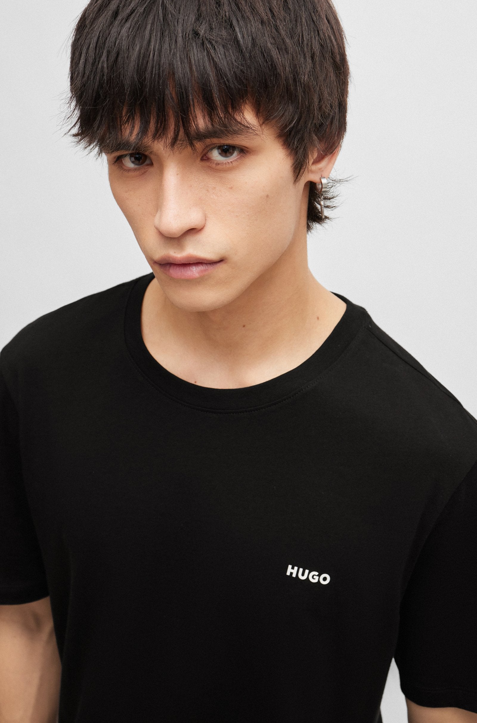 An everyday essential, this HUGO Menswear T-shirt is printed with a logo at the chest. Cut to a straight fit in soft cotton jersey.