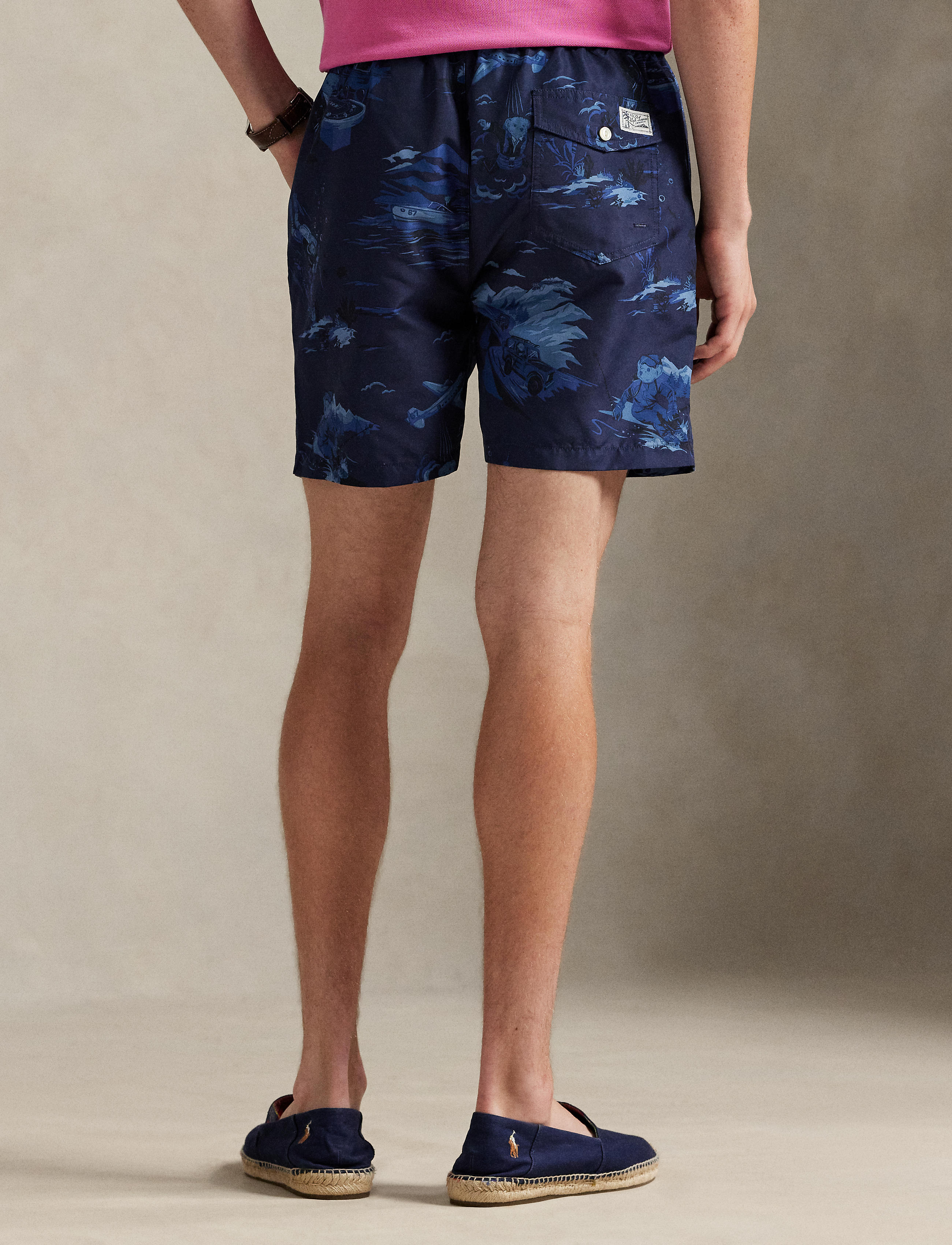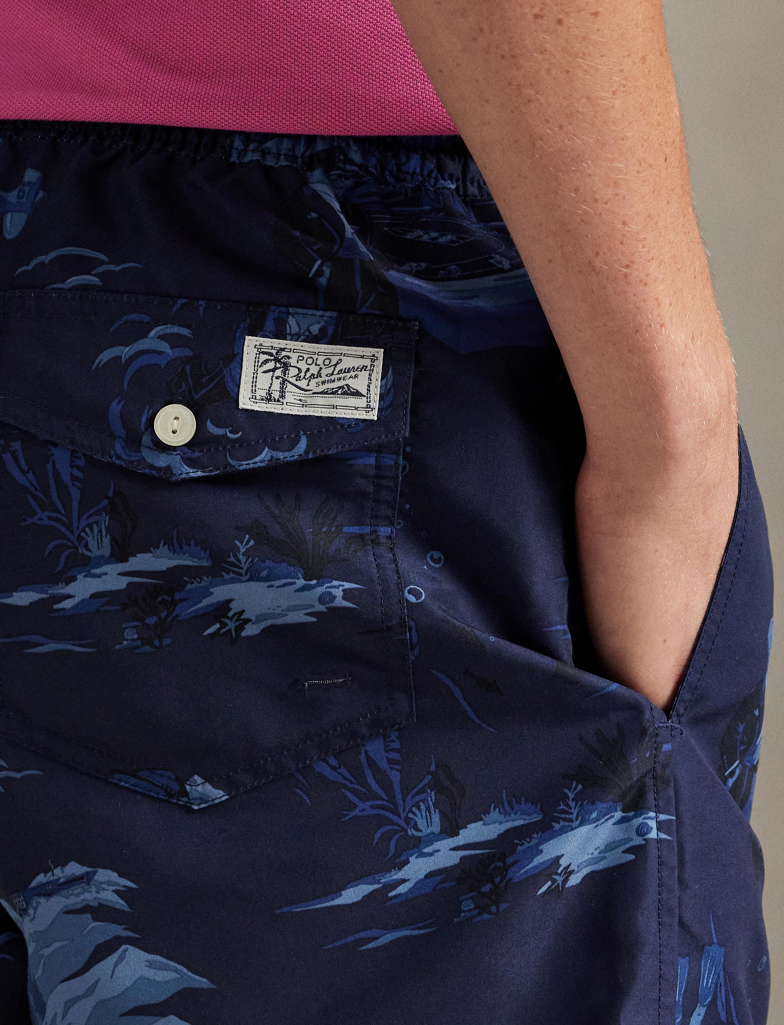 - Side on-seam pockets. Back right buttoned pocket. “Polo Ralph Lauren Swimwear” label at the back pocket.