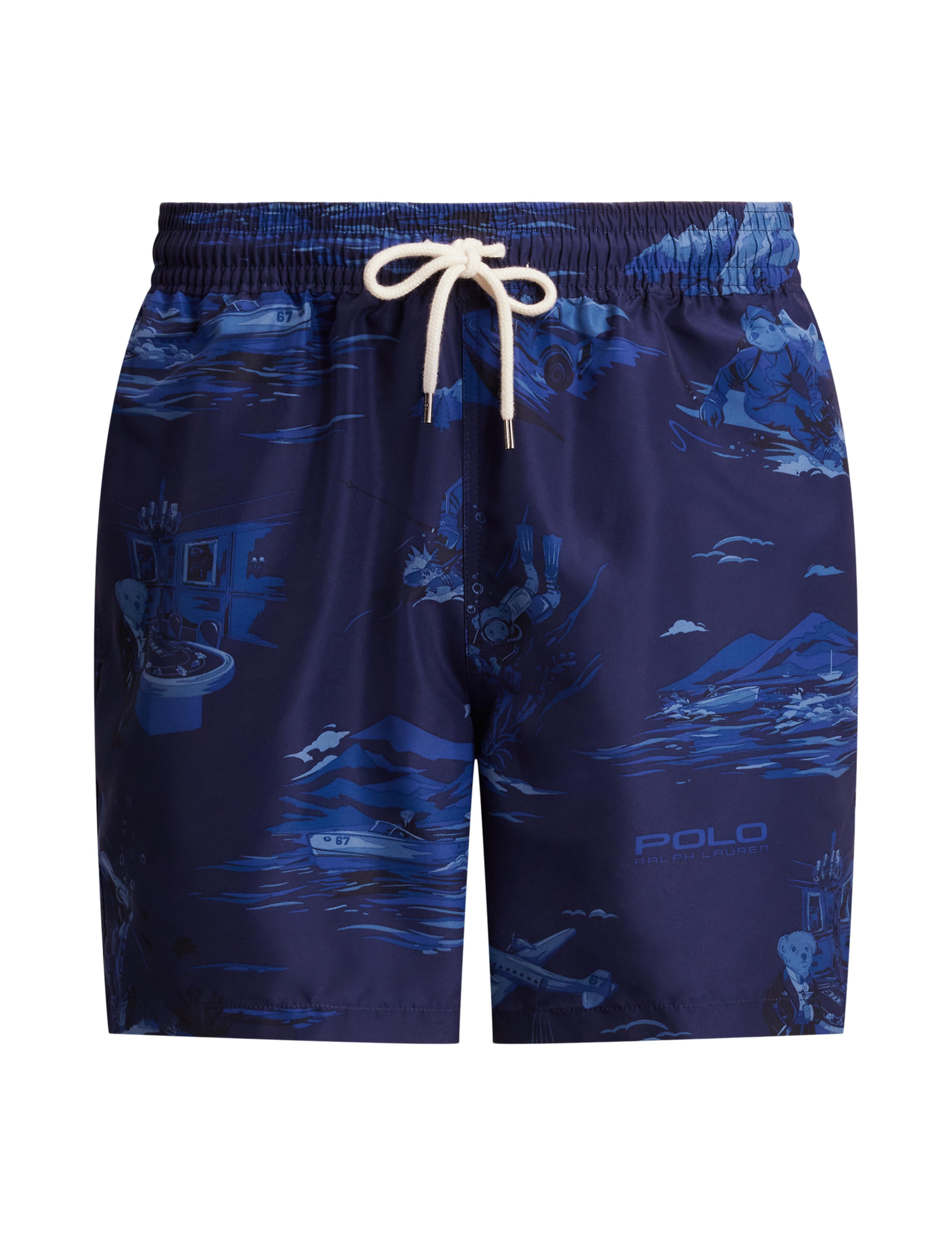 These mesh-lined swim trunks are printed all over with our Polo Bear, who, like a protagonist in classic spy films, deftly navigates the sky, land, and sea. They are rendered in a tonal palette for a sleek, modern look and embroidered at the left hem with our iconic Polo Pony.