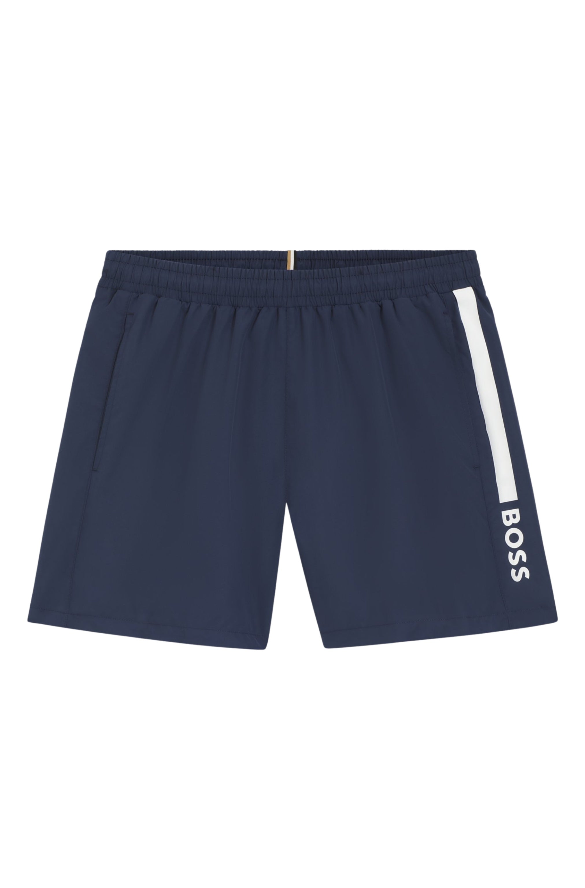 Printed with a stripe and logo, these BOSS Menswear swim shorts are naturally quick drying for easy care.