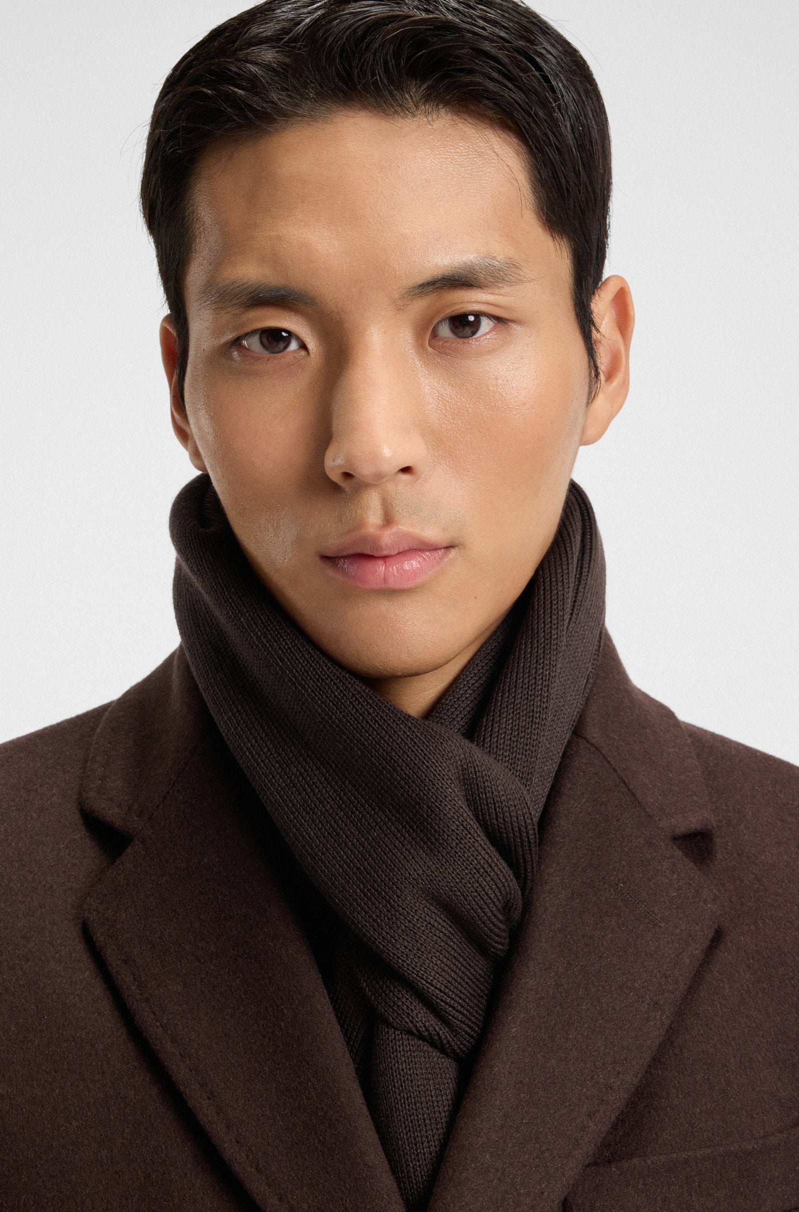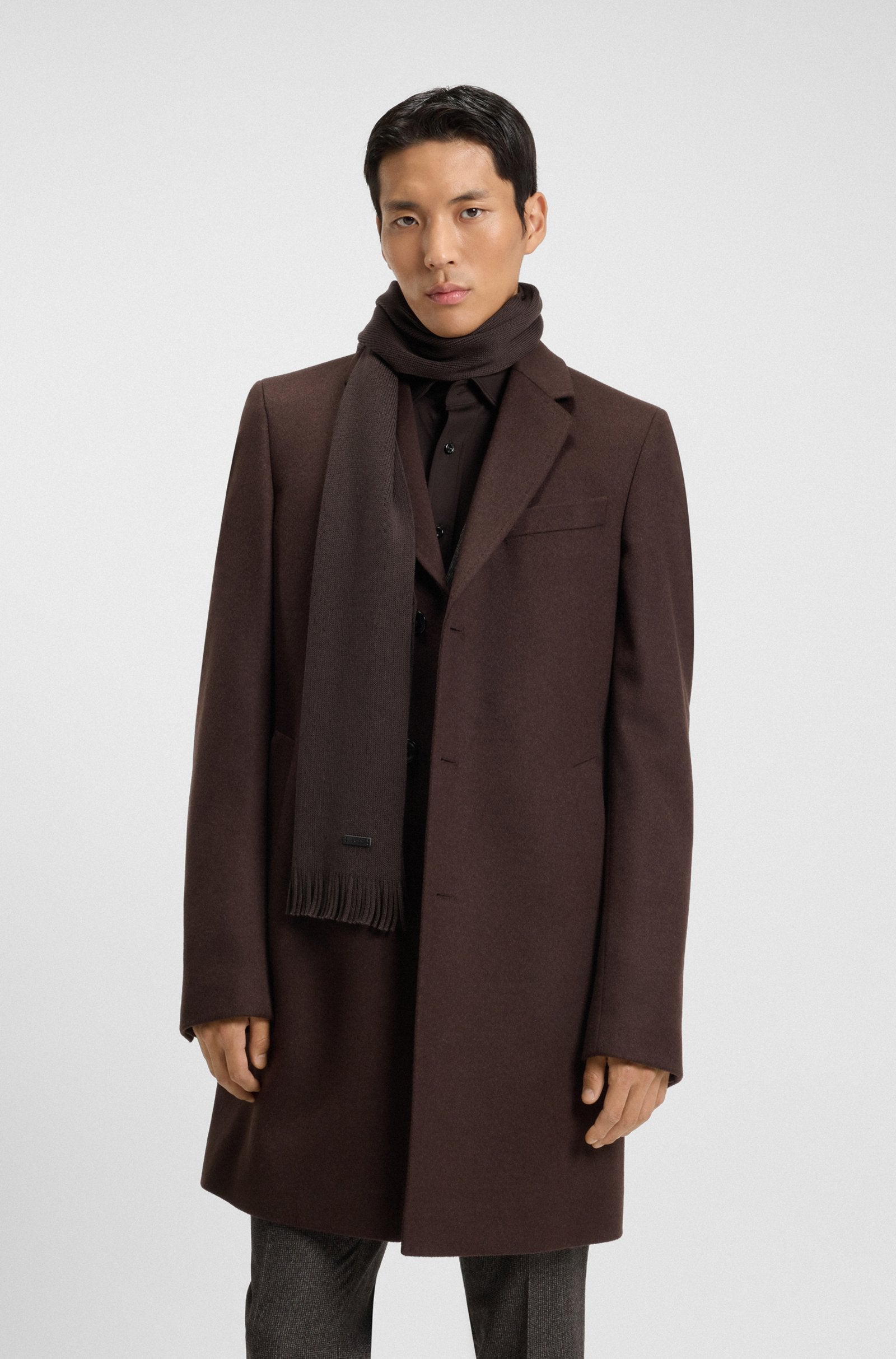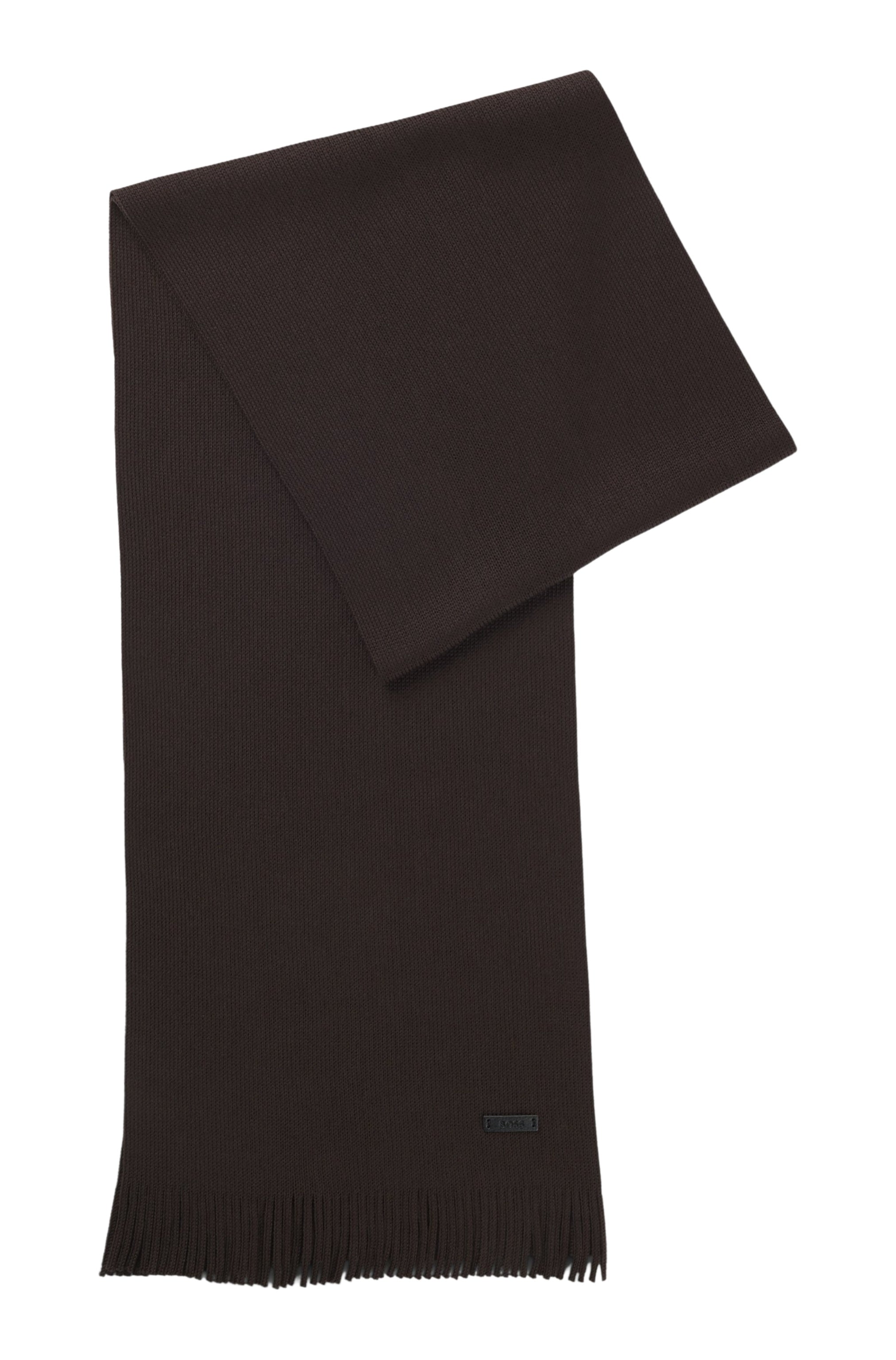 A versatile scarf by BOSS, knitted with a raschel structure and featuring fringing and a branded faux-leather plaque.