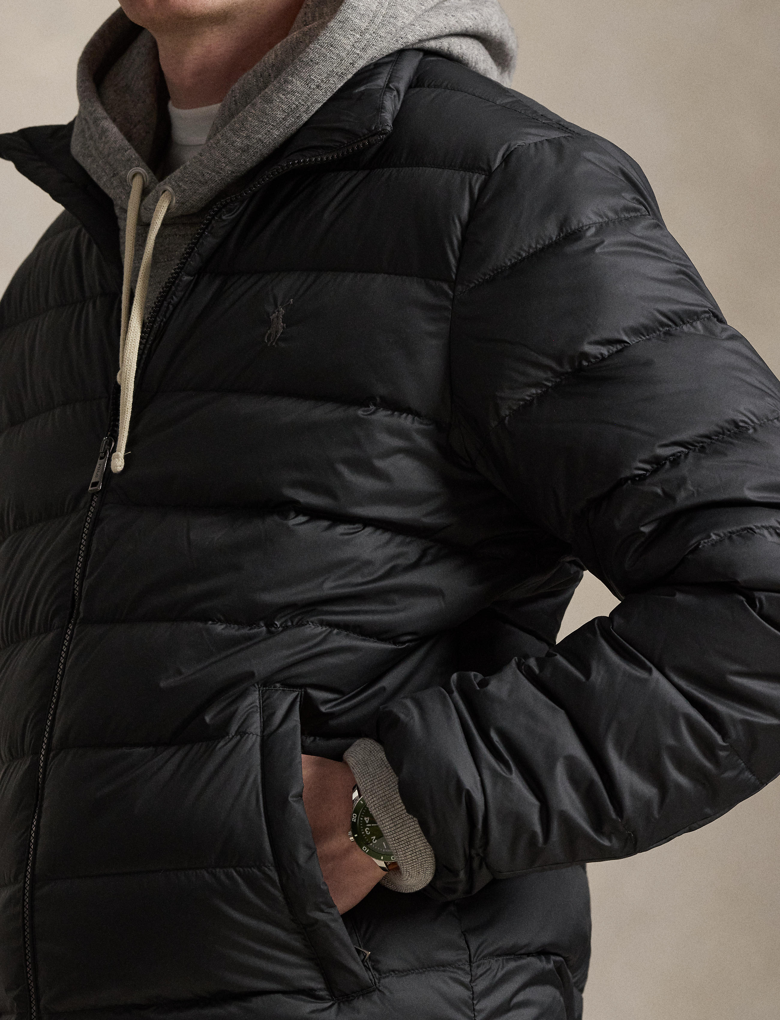- Mockneck. Full-zip front with a flap at the top that prevents chafing. Zipper pulls and drawstring stoppers custom-developed with a “Polo” logo.