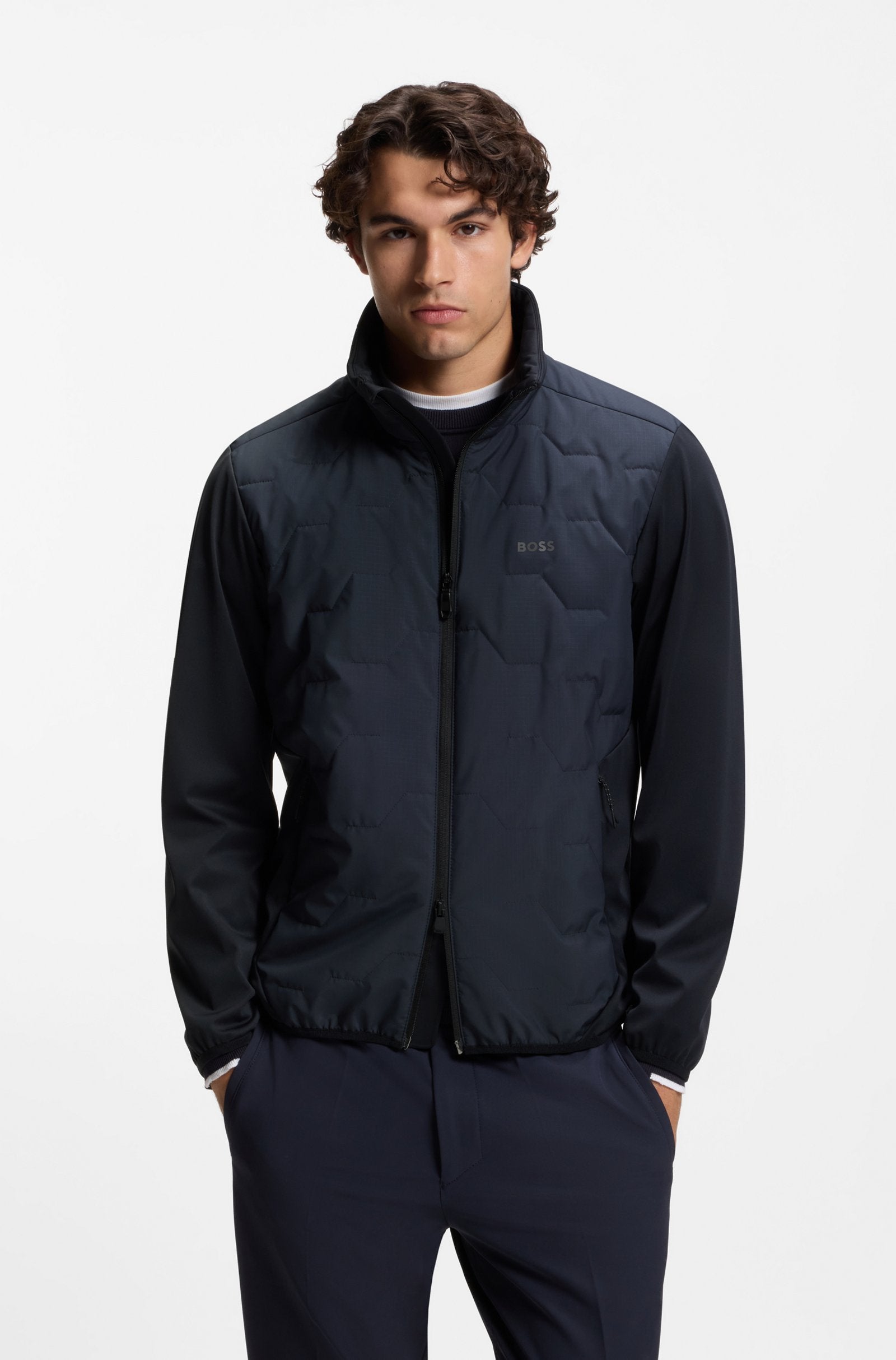 With its protective finish and decorative reflective logo, this regular BOSS Menswear jacket is ideal for active days. Athleisure design elements for easy movement.