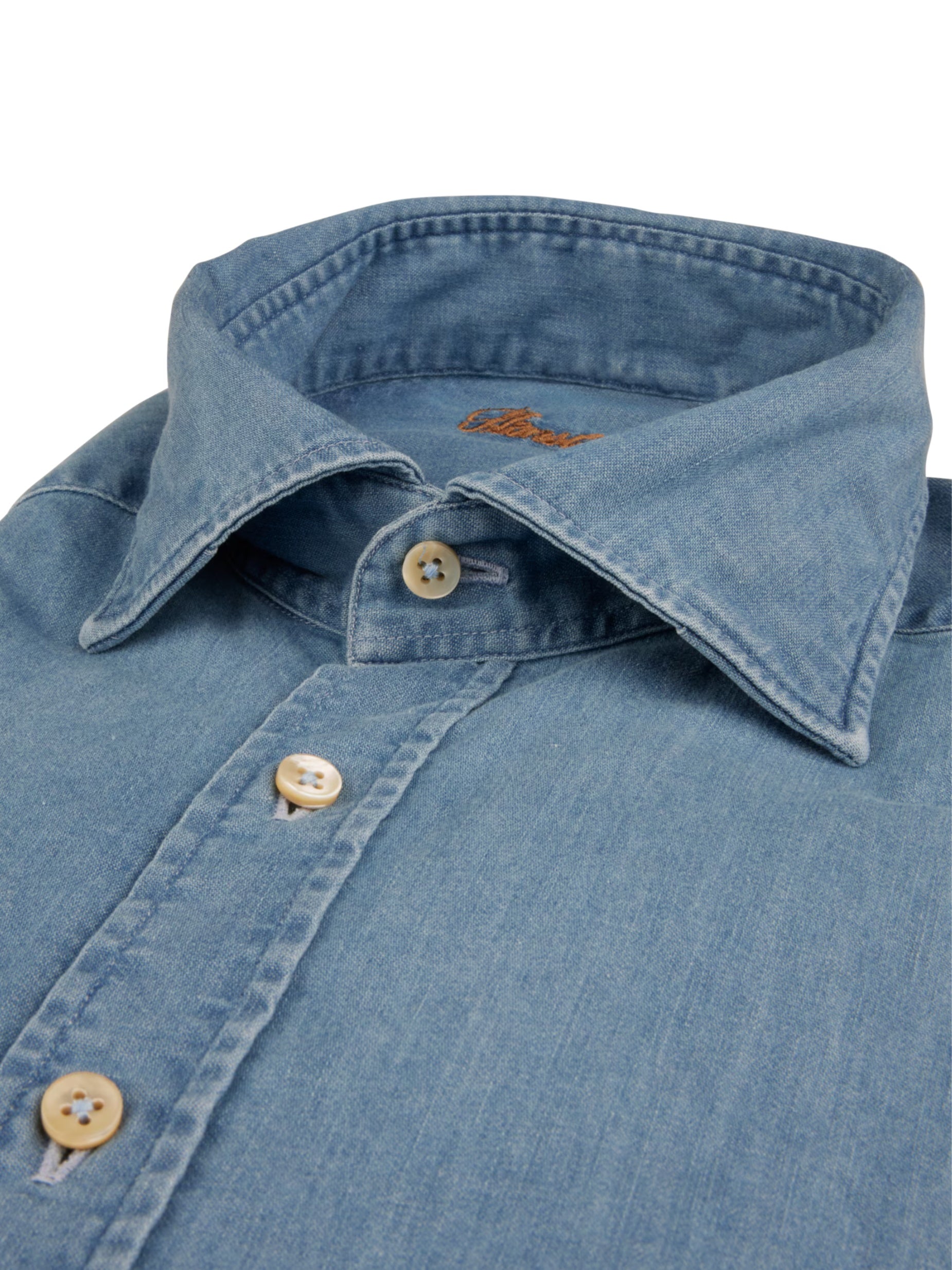 This denim shirt is made of cotton and elastane and is detailed with mother of pearl buttons, single cuffs and a cut away collar.