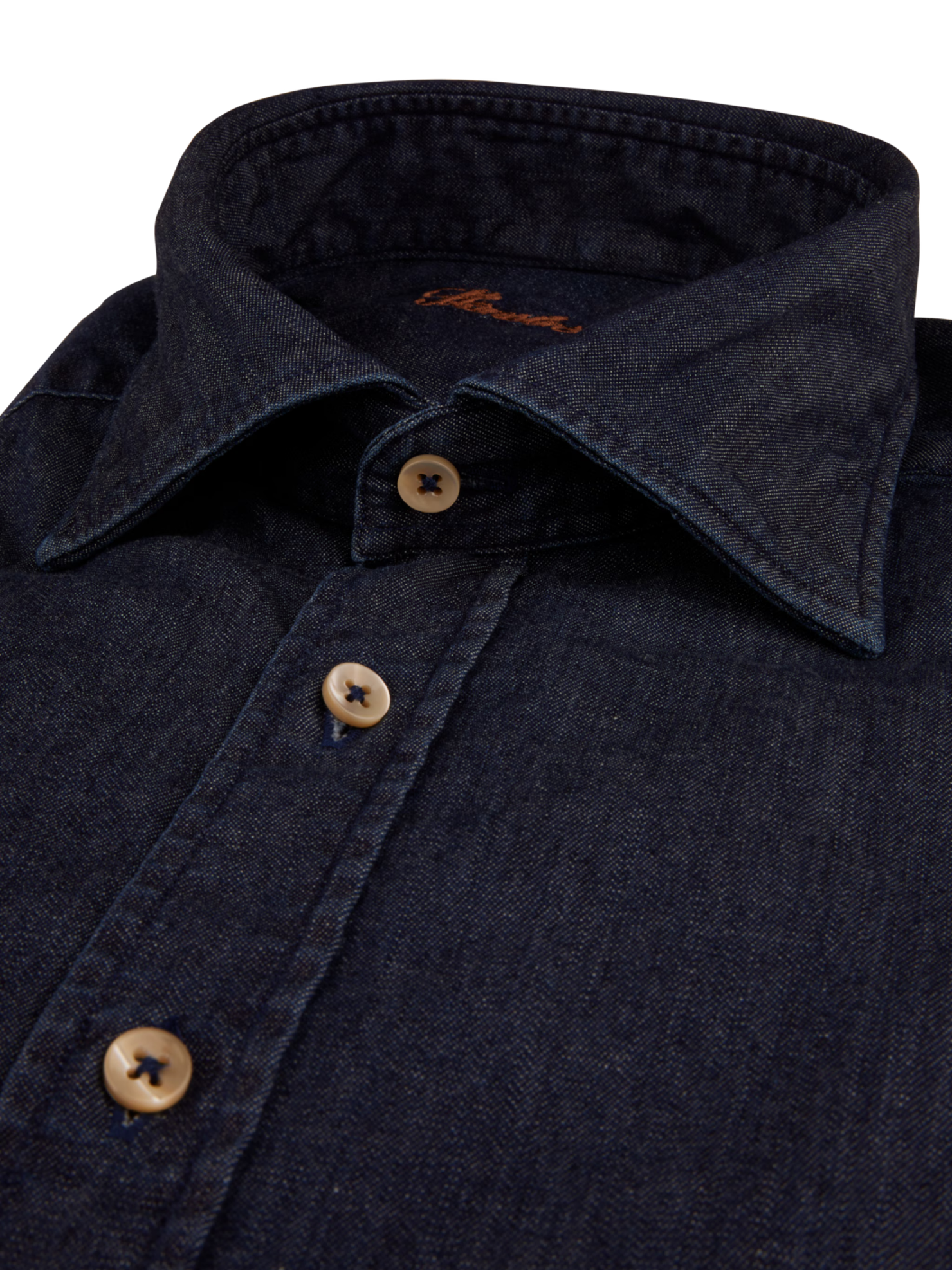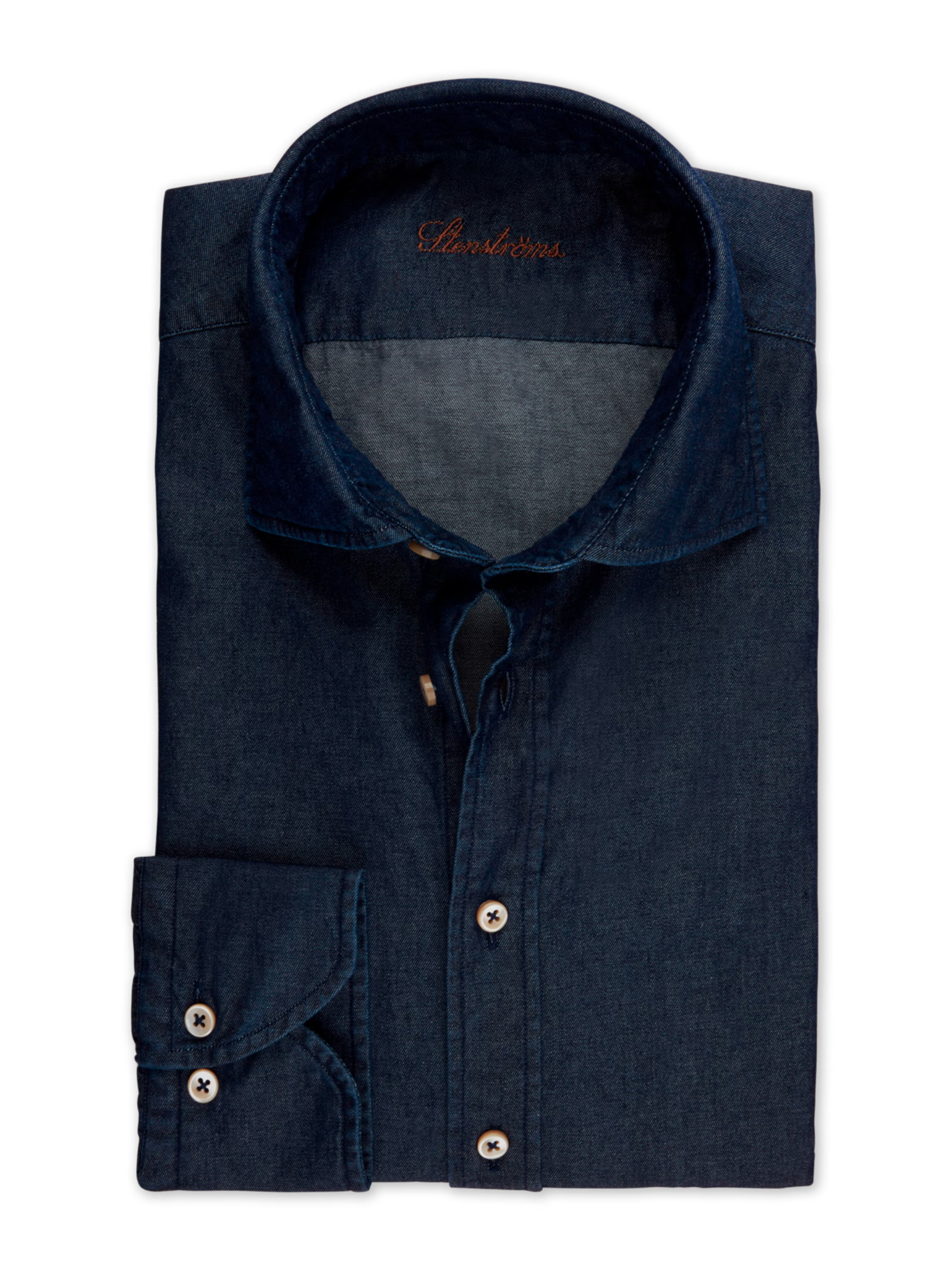 This denim shirt is made of cotton and elastane and is detailed with mother of pearl buttons, single cuffs and a cut away collar.