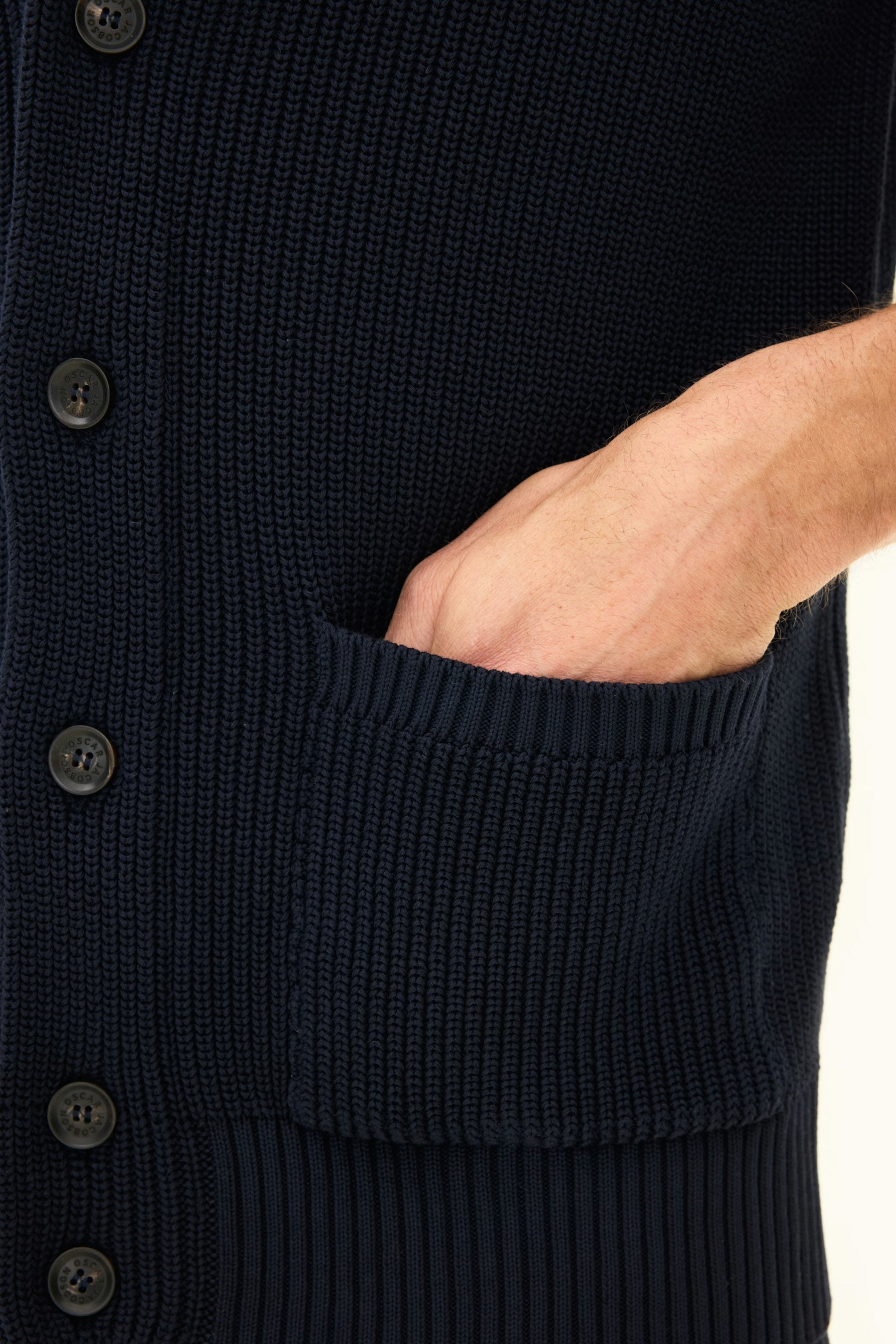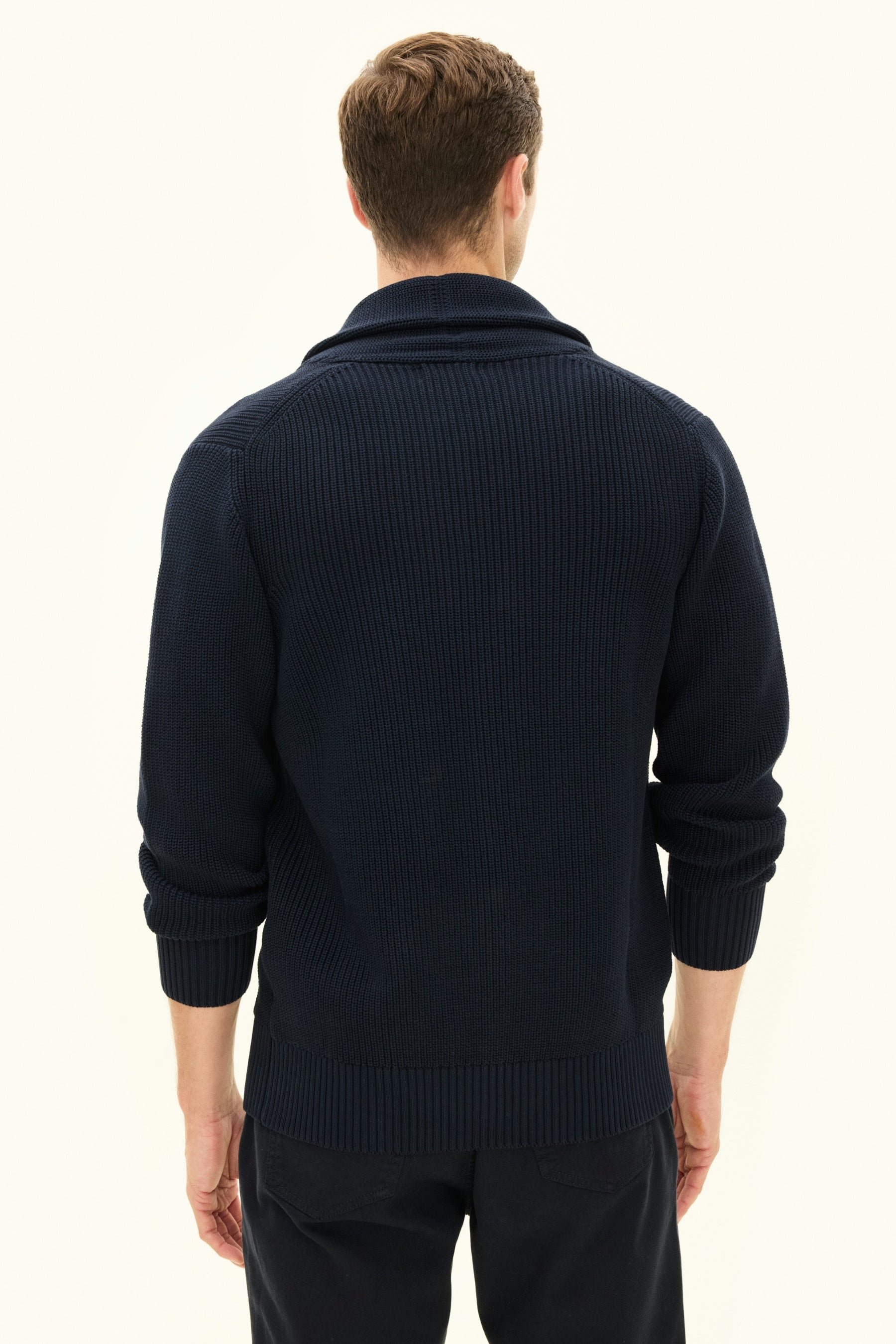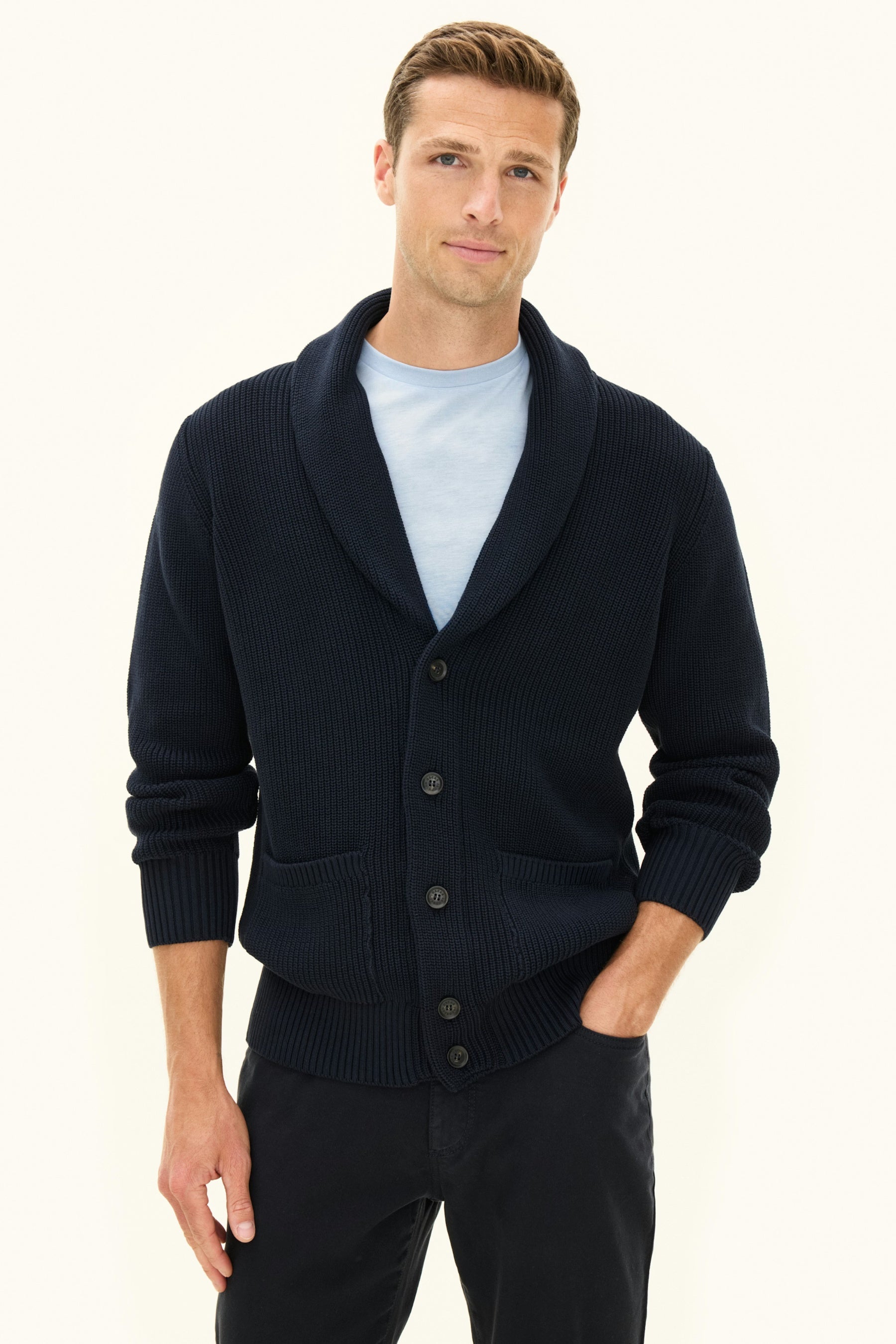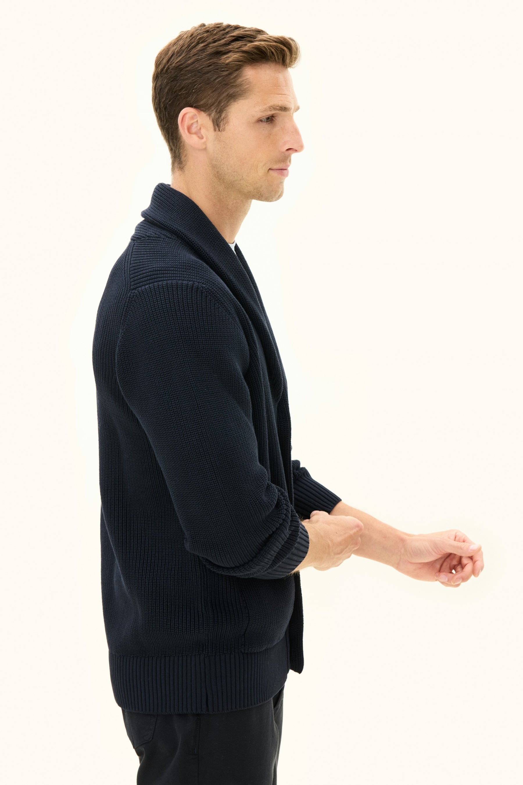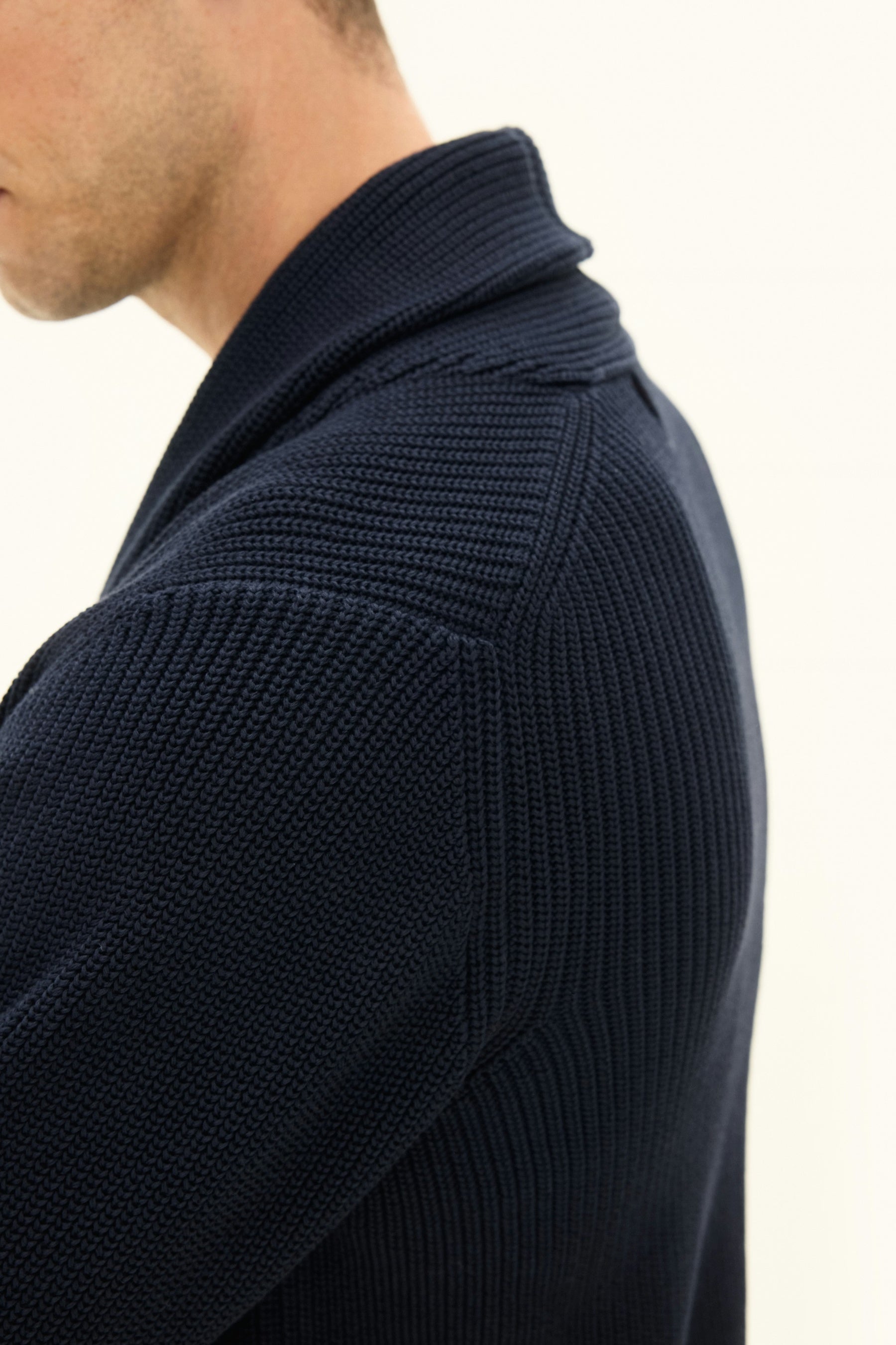 A ribbed cardigan in 100% cotton with a shawl collar and regular fit. The soft knit gives a relaxed yet stylish look, making the model ideal both as a mid-layer and as a standalone piece.